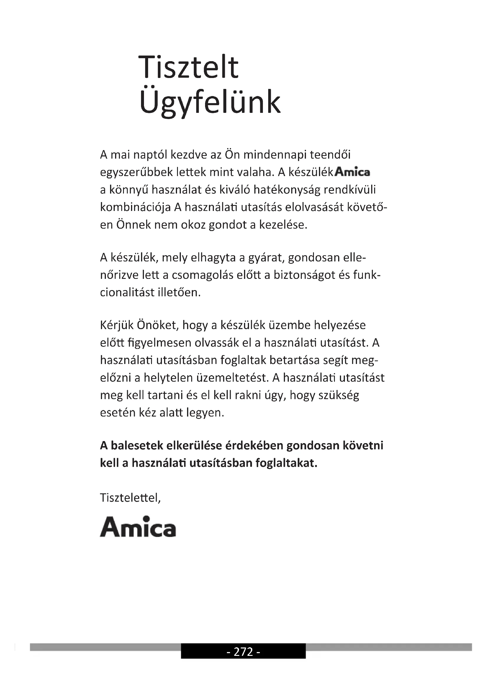 - Директива 2014/35/ЕО за ниско напрежение• Директива 2014/30/ЕО за електромагнетична компатибилност• Директива 2009/125/EO• Директива RoHS 2011/65/EO и поради това продуктът е маркиран с и му е издадена декларация за съответствие на разположение на надзорните органи на пазара.- 272 - Tisztelt Ügyfelünk A mai naptól kezdve az Ön mindennapi teendői egyszerűbbek leek mint valaha. A készülék a könnyű használat és kiváló hatékonyság rendkívüli kombinációja A használa utasítás elolvasását követő- en Önnek nem okoz gondot a kezelése. A készülék, mely elhagyta a gyárat, gondosan elle- nőrizve le a csomagolás elő a biztonságot és funk- cionalitást illetően. Kérjük Önöket, hogy a készülék üzembe helyezése elő gyelmesen olvassák el a használa utasítást. A használa utasításban foglaltak betartása segít meg- előzni a helytelen üzemeltetést. A használa utasítást meg kell tartani és el kell rakni úgy, hogy szükség esetén kéz ala legyen. A balesetek elkerülése érdekében gondosan követni kell a használa utasításban foglaltakat. Tiszteleel,- 273 -