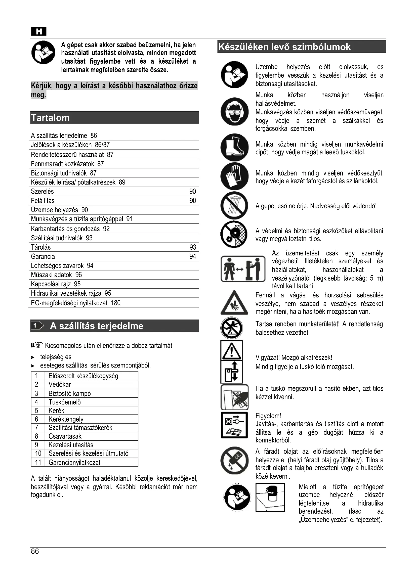 Tartalom A szállítás terjedelme 86 Jelölések a készüléken 86/87 Rendeltetésszerű használat 87 Fennmaradt kozkázatok 87 Biztonsági tudnivalók 87 Készülék leírása/ pótalkatrészek 89 Szerelés 90 Felállítás 90 Üzembe helyezés 90 Munkavégzés a tűzifa aprítógéppel 91 Karbantartás és gondozás 92 Szállítási tudnivalók 93 Tárolás 93 Garancia 94 Lehetséges zavarok 94 Műszaki adatok 96 Kapcsolási rajz 95 Hidraulikai vezetékek rajza 95 EG-megfelelőségi nyilatkozat 180