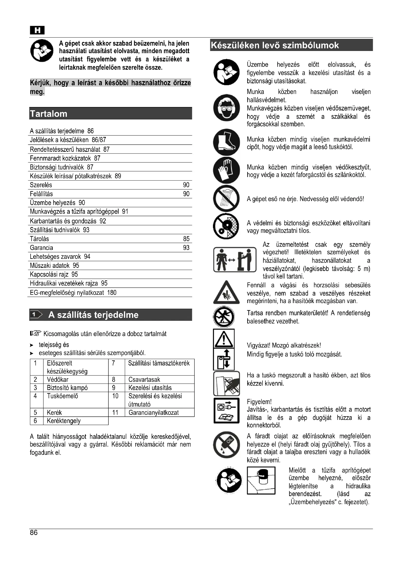 Tartalom A szállítás terjedelme 86 Jelölések a készüléken 86/87 Rendeltetésszerű használat 87 Fennmaradt kozkázatok 87 Biztonsági tudnivalók 87 Készülék leírása/ pótalkatrészek 89 Szerelés 90 Felállítás 90 Üzembe helyezés 90 Munkavégzés a tűzifa aprítógéppel 91 Karbantartás és gondozás 92 Szállítási tudnivalók 93 Tárolás 85 Garancia 93 Lehetséges zavarok 94 Műszaki adatok 95 Kapcsolási rajz 95 Hidraulikai vezetékek rajza 95 EG-megfelelőségi nyilatkozat 180