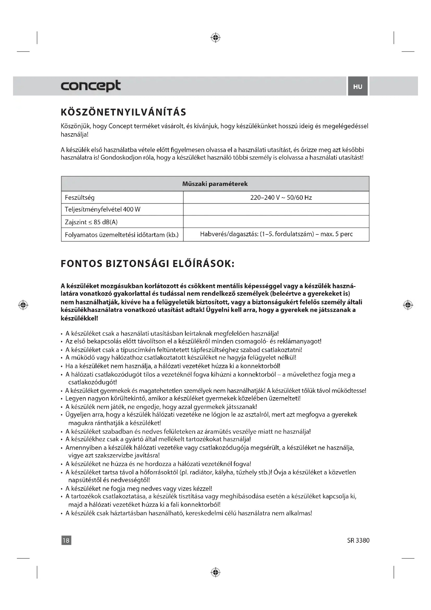 SR 3380 Problem Przyczyna RozwiązanieKÖSZÖNETNYILVÁNÍTÁS Köszönjük, hogy Concept terméket vásárolt, és kívánjuk, hogy készülékünket hosszú ideig és megelégedéssel használja! A készülék első használatba vétele előtt gyelmesen olvassa el a használati utasítást, és őrizze meg azt későbbi használatra is! Gondoskodjon róla, hogy a készüléket használó többi személy is elolvassa a használati utasítást! Műszaki paraméterek Feszültség 220–240 V ~ 50 /60 Hz Teljesítményfelvétel 400 W Zajszint ≤ 85 dB(A) Folyamatos üzemeltetési időtartam (kb.) Habverés/dagasztás: (1–5. fordulatszám) – max. 5 perc FONTOS BIZTONSÁGI ELŐÍRÁSOK: A készüléket mozgásukban korlátozott és csökkent mentális képességgel vagy a készülék haszná- latára vonatkozó gyakorlattal és tudással nem rendelkező személyek (beleértve a gyerekeket is) nem használhatják, kivéve ha a felügyeletük biztosított, vagy a biztonságukért felelős személy általi készülékhasználatra vonatkozó utasítást adtak! Ügyelni kell arra, hogy a gyerekek ne játsszanak a készülékkel!