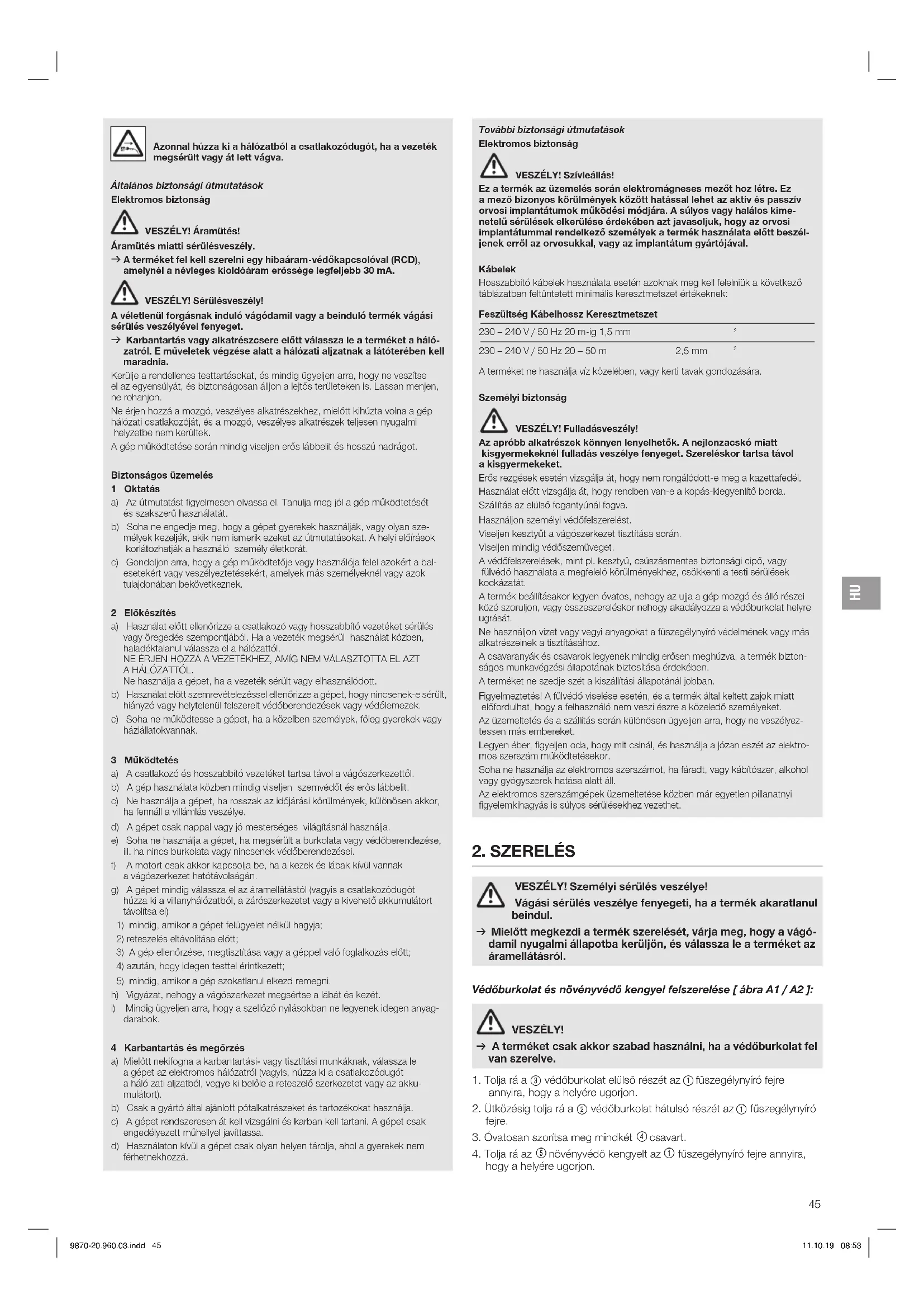 darabok. 4 Karbantartás és megőrzés a) Mielőtt nekifogna a karbantartási- vagy tisztítási munkáknak, válassza le a gépet az elektromos hálózatról (vagyis, húzza ki a csatlakozódugót a háló zati aljzatból, vegye ki belőle a reteszelő szerkezetet vagy az akku- mulátort). b) Csak a gyártó által ajánlott pótalkatrészeket és tartozékokat használja. c) A gépet rendszeresen át kell vizsgálni és karban kell tartani. A gépet csak engedélyezett műhellyel javíttassa. d) Használaton kívül a gépet csak olyan helyen tárolja, ahol a gyerekek nem férhetnek hozzá. További biztonsági útmutatások Elektromos biztonság VESZÉLY! Szívleállás! Ez a termék az üzemelés során elektromágneses mezőt hoz létre. Ez a mező bizonyos körülmények között hatással lehet az aktív és passzív orvosi implantátumok működési módjára. A súlyos vagy halálos kime- netelű sérülések elkerülése érdekében azt javasoljuk, hogy az orvosi implantátummal rendelkező személyek a termék használata előtt beszél- jenek erről az orvosukkal, vagy az implantátum gyártójával. Kábelek Hosszabbító kábelek használata esetén azoknak meg kell felelniük a következő táblázatban feltüntetett minimális keresztmetszet értékeknek: Feszültség Kábelhossz Keresztmetszet 230 – 240 V / 50 Hz 20 m-ig 1,5 mm