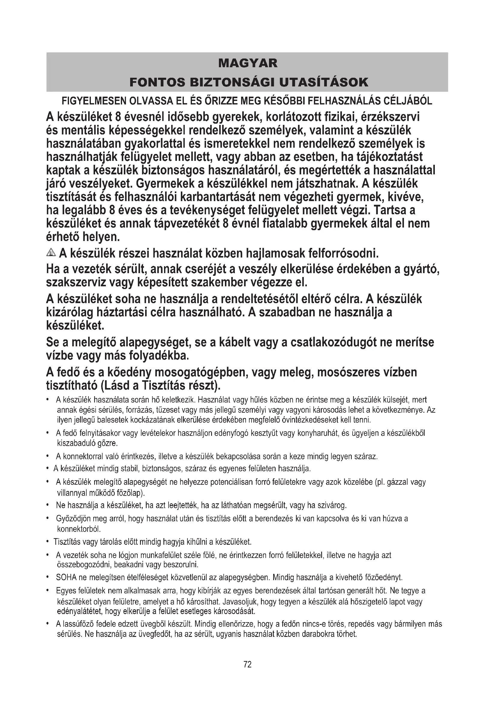 FIGYELMESEN OLVASSA EL ÉS ŐRIZZE MEG KÉSŐBBI FELHASZNÁLÁS CÉLJÁBÓL A készüléket 8 évesnél idősebb gyerekek, korlátozott fizikai, érzékszervi és mentális képességekkel rendelkező személyek, valamint a készülék használatában gyakorlattal és ismeretekkel nem rendelkező személyek is használhatják felügyelet mellett, vagy abban az esetben, ha tájékoztatást kaptak a készülék biztonságos használatáról, és megértették a használattal járó veszélyeket. Gyermekek a készülékkel nem játszhatnak. A készülék tisztítását és felhasználói karbantartását nem végezheti gyermek, kivéve, ha legalább 8 éves és a tevékenységet felügyelet mellett végzi. Tartsa a készüléket és annak tápvezetékét 8 évnél fiatalabb gyermekek által el nem érhető helyen. A készülék részei használat közben hajlamosak felforrósodni. Ha a vezeték sérült, annak cseréjét a veszély elkerülése érdekében a gyártó, szakszerviz vagy képesített szakember végezze el. A készüléket soha ne használja a rendeltetésétől eltérő célra. A készülék kizárólag háztartási célra használható. A szabadban ne használja a készüléket. Se a melegítő alapegységet, se a kábelt vagy a csatlakozódugót ne merítse vízbe vagy más folyadékba. A fedő és a kőedény mosogatógépben, vagy meleg, mosószeres vízben tisztítható (Lásd a Tisztítás részt).
