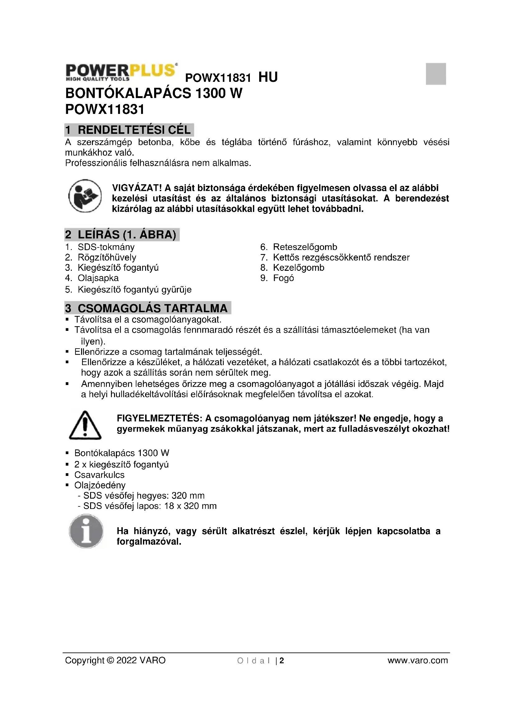 Ha a gép elhasználódott, ne dobja a háztartási szemétbe, hanem gondoskodjon annak környezetbarát elhelyezéséről! Az elhasználódott elektromos termékek hulladékait ne dobja a háztartási szemétbe. Kérjük, hogy gondoskodjon azok újrahasznosításáról, amennyiben erre lehetősége van. Az újrahasznosítási lehetőségeket illetően érdeklődjön a helyi köztisztasági szerveknél vagy a forgalmazónál!POWX11831 HU Copyright © 2022 VARO O l d a l | 9 www.varo.com