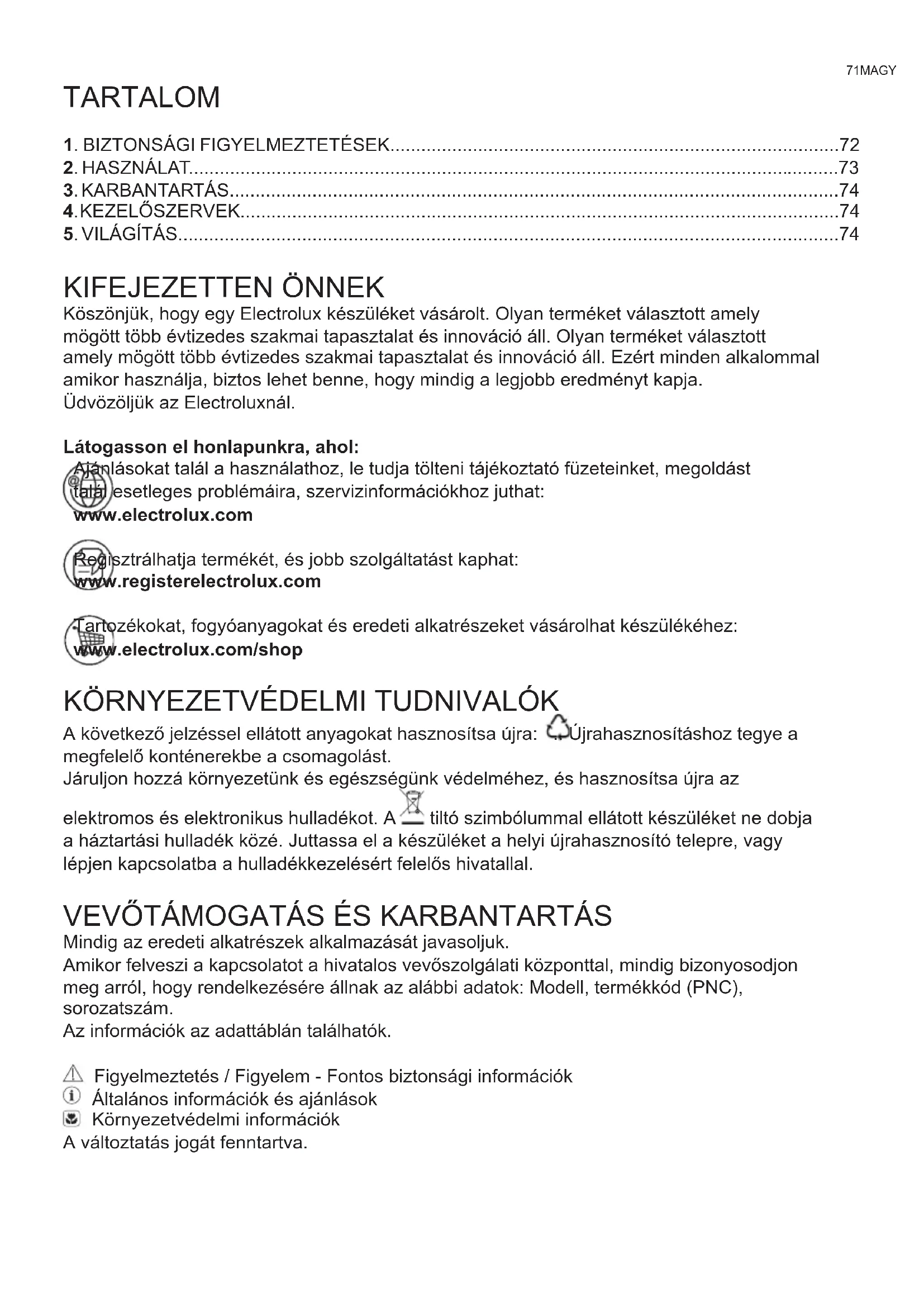 - 5. VILÁGÍTÁS KIFEJEZETTEN ÖNNEK Köszönjük, hogy egy Electrolux készüléket vásárolt. Olyan terméket választott amely mögött több évtizedes szakmai tapasztalat és innováció áll. Olyan terméket választott amely mögött több évtizedes szakmai tapasztalat és innováció áll. Ezért minden alkalommal amikor használja, biztos lehet benne, hogy mindig a legjobb eredményt kapja. Üdvözöljük az Electroluxnál. Látogasson el honlapunkra, ahol: Ajánlásokat talál a használathoz, le tudja tölteni tájékoztató füzeteinket, megoldást talál esetleges problémáira, szervizinformációkhoz juthat: www.electrolux.com Regisztrálhatja termékét, és jobb szolgáltatást kaphat: www.registerelectrolux.com Tartozékokat, fogyóanyagokat és eredeti alkatrészeket vásárolhat készülékéhez: www.electrolux.com/shop p. 74