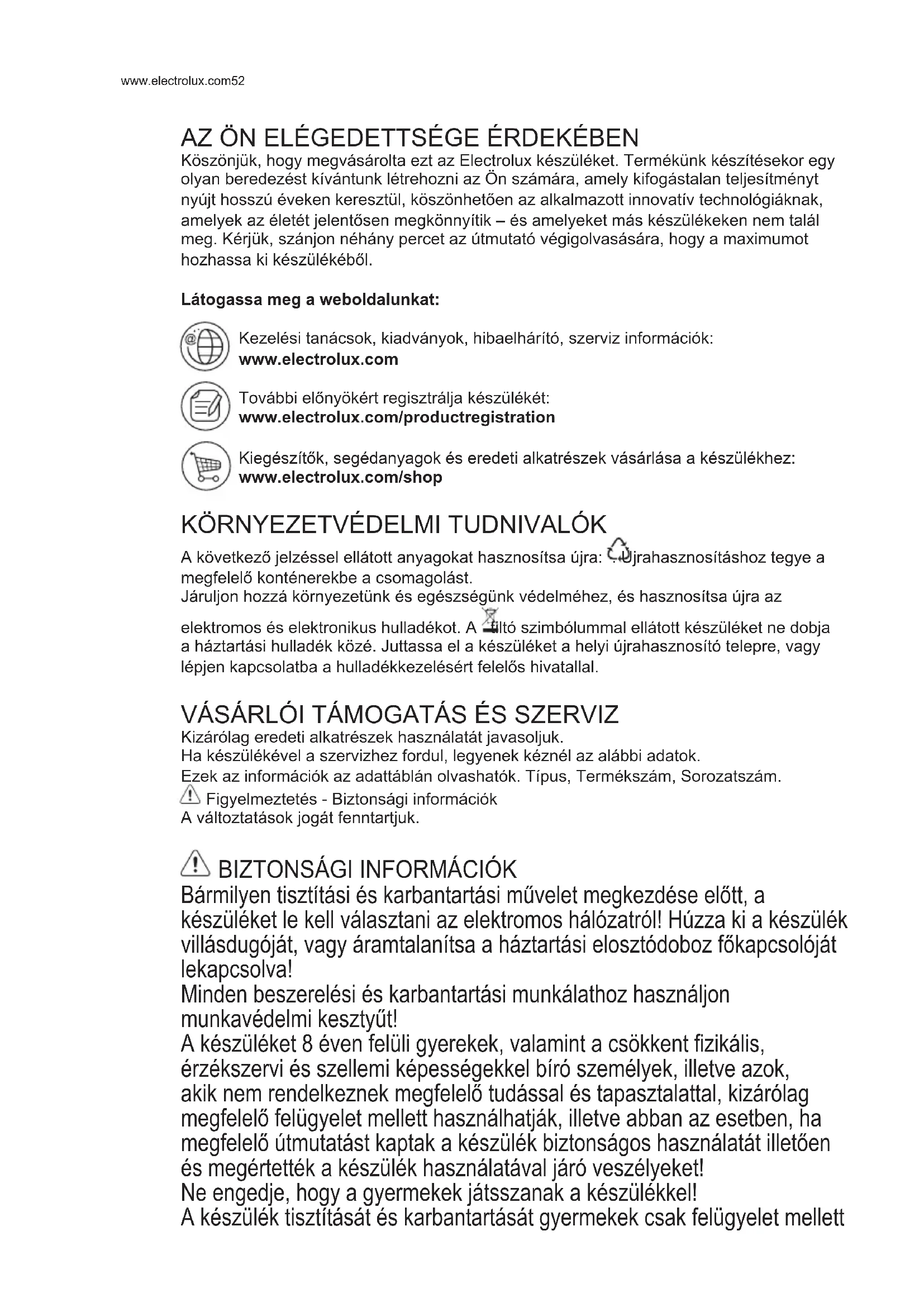 A következő jelzéssel ellátott anyagokat hasznosítsa újra: Újrahasznosításhoz tegye a megfelelő konténerekbe a csomagolást. Járuljon hozzá környezetünk és egészségünk védelméhez, és hasznosítsa újra az elektromos és elektronikus hulladékot A tiltó szimbólummal ellátott készüléket ne dobja a háztartási hulladék közé. Juttassa el a készüléket a helyi újrahasznosító telepre, vagy lépjen kapcsolatba a hulladékkezelésért felelős hivatallal. VÁSÁRLÓI TÁMOGATÁS ÉS SZERVIZ Kizárólag eredeti alkatrészek használatát javasoljuk Ha készülékével a szervizhez fordul, legyenek kéznél az alábbi adatok Ezek az információk az adattáblán olvashatók Típus, Termékszám, Sorozatszám Figyelmeztetés - Biztonsági információk A változtatások jogát fenntartjuk