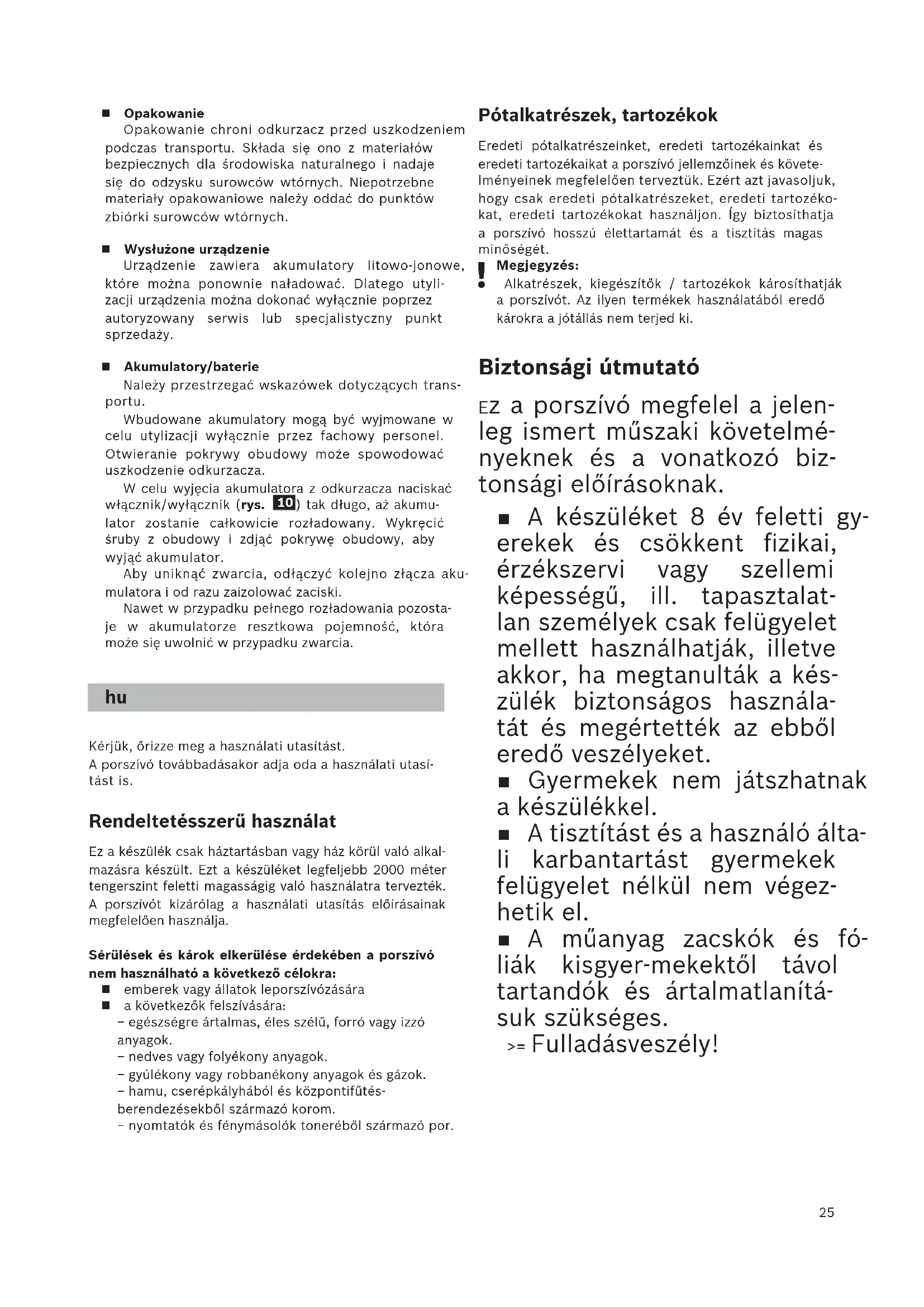 Ártalmatlanítási tudnivalók Lehetővé kell tenni a porszívó, az akkumulátorok, a tartozékok és a csomagolás környezetbarát újrahasz- nosítását. Ne dobja a porszívót és az akkukat/elemeket a háztartá- si szemétbe! Csomagolás A csomagolás védi a porszívót a szállítás során keletkező sérülésektől. A csomagolás környezet- barát anyagokból készült, és ezért újrafeldolgozásra alkalmas. A továbbiakban már nem szükséges cso- magolóanyagot helyezze el a szelektív gyűjtőhelyek megfelelő tárolóiban. Régi készülék A készülék újratölthető lítiumion-akkumulátorokat tartalmaz. Ezért a készüléket csak erre felhatalma- zott vevőszolgálaton vagy szakkereskedésen keresz- tül ártalmatlanítsa. Akkumulátorok / elemek Vegye figyelembe a szállítási tudnivalókat. A beépített akkumulátorokat ártalmatlanítás céljára csak szakképzett személyzet távolíthatja el. A burko- lat nyitásakor a porszívó megsérülhet. Ha ki akarja venni az akkut a porszívóból, tartsa nyomva a be-/kikapcsolót (