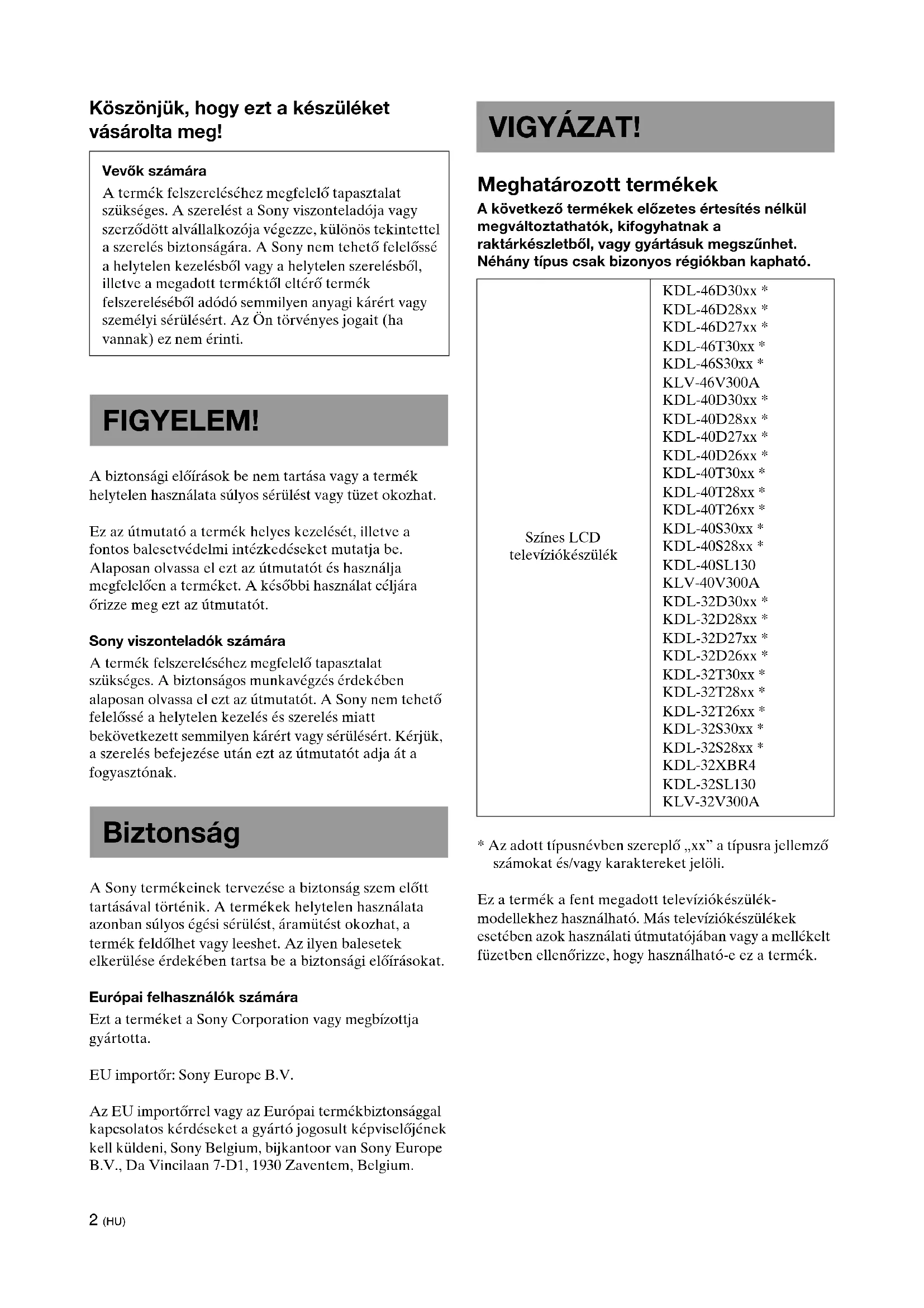 - Yukarıdaki tabloda yer alan modeller için “a” kanca konumu kullanılamaz. c2 (HU) Köszönjük, hogy ezt a készüléket vásárolta meg! A biztonsági előírások be nem tartása vagy a termék helytelen használata súlyos sérülést vagy tüzet okozhat. Ez az útmutató a termék helyes kezelését, illetve a fontos balesetvédelmi intézkedéseket mutatja be. Alaposan olvassa el ezt az útmutatót és használja megfelelően a terméket. A későbbi használat céljára őrizze meg ezt az útmutatót. Sony viszonteladók számára A termék felszereléséhez megfelelő tapasztalat szükséges. A biztonságos munkavégzés érdekében alaposan olvassa el ezt az útmutatót. A Sony nem tehető felelőssé a helytelen kezelés és szerelés miatt bekövetkezett semmilyen kárért vagy sérülésért. Kérjük, a szerelés befejezése után ezt az útmutatót adja át a fogyasztónak. A Sony termékeinek tervezése a biztonság szem előtt tartásával történik. A termékek helytelen használata azonban súlyos égési sérülést, áramütést okozhat, a termék feldőlhet vagy leeshet. Az ilyen balesetek elkerülése érdekében tartsa be a biztonsági előírásokat. Európai felhasználók számára Ezt a terméket a Sony Corporation vagy megbízottja gyártotta. EU importőr: Sony Europe B.V. Az EU importőrrel vagy az Európai termékbiztonsággal kapcsolatos kérdéseket a gyártó jogosult képviselőjének kell küldeni, Sony Belgium, bijkantoor van Sony Europe B.V., Da Vincilaan 7-D1, 1930 Zaventem, Belgium. Meghatározott termékek A következő termékek előzetes értesítés nélkül megváltoztathatók, kifogyhatnak a raktárkészletből, vagy gyártásuk megszűnhet. Néhány típus csak bizonyos régiókban kapható.