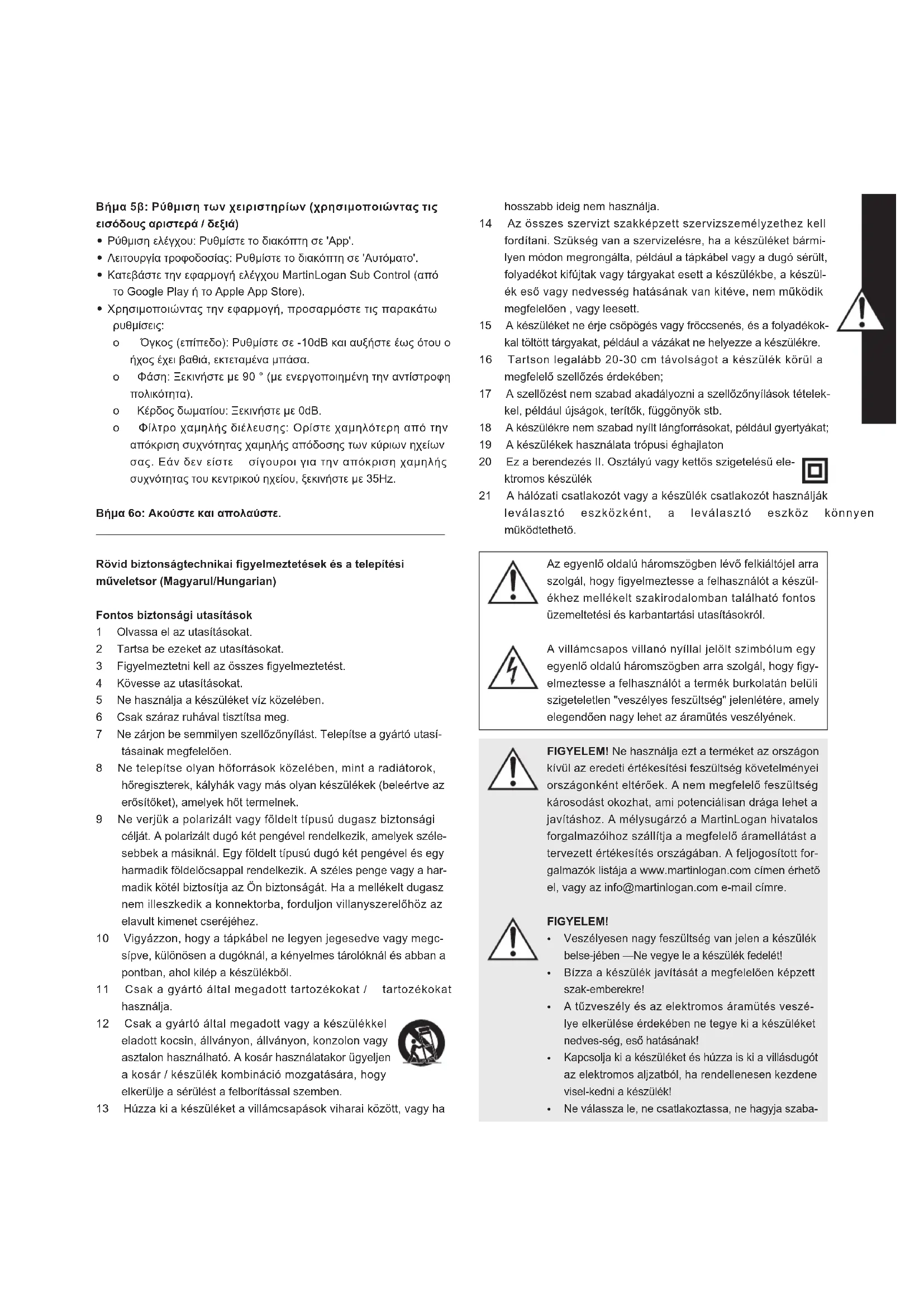 o Όγκος(επίπεδο):Ρυθμίστεσε-10dBκαιαυξήστεέωςότουο ήχοςέχειβαθιά,εκτεταμέναμπάσα. o Φάση:Ξεκινήστεμε90°(μεενεργοποιημένητηναντίστροφη πολικότητα). o Κέρδοςδωματίου:Ξεκινήστεμε0dB. o Φίλτροχαμηλήςδιέλευσης:Ορίστεχαμηλότερηαπότην απόκρισησυχνότηταςχαμηλήςαπόδοσηςτωνκύριωνηχείων σας.Εάνδενείστε σίγουροιγιατηναπόκρισηχαμηλής συχνότηταςτουκεντρικούηχείου,ξεκινήστεμε35Hz. Βήμα 6ο: Ακούστε και απολαύστε. Rövid biztonságtechnikai figyelmeztetések és a telepítési műveletsor (Magyarul/Hungarian) Fontos biztonsági utasítások 1 Olvassaelazutasításokat. 2 Tartsabeezeketazutasításokat. 3 Figyelmeztetnikellazösszesfigyelmeztetést. 4 Kövesseazutasításokat. 5 Nehasználjaakészüléketvízközelében. 6 Csakszárazruhávaltisztítsameg. 7 Nezárjonbesemmilyenszellőzőnyílást.Telepítseagyártóutasí- tásainakmegfelelően. 8 Netelepítseolyanhőforrásokközelében,mintaradiátorok, hőregiszterek,kályhákvagymásolyankészülékek(beleértveaz erősítőket),amelyekhőttermelnek. 9 Neverjükapolarizáltvagyföldelttípusúdugaszbiztonsági célját.Apolarizáltdugókétpengévelrendelkezik,amelyekszéle- sebbekamásiknál.Egyföldelttípusúdugókétpengévelésegy harmadikföldelőcsappalrendelkezik.Aszélespengevagyahar- madikkötélbiztosítjaazÖnbiztonságát.Haamellékeltdugasz nemilleszkedikakonnektorba,forduljonvillanyszerelőhözaz elavultkimenetcseréjéhez. 10 Vigyázzon,hogyatápkábelnelegyenjegesedvevagymegc- sípve,különösenadugóknál,akényelmestárolóknálésabbana pontban,aholkilépakészülékből. 11 Csakagyártóáltalmegadotttartozékokat/ tartozékokat használja. 12 Csakagyártóáltalmegadottvagyakészülékkel eladottkocsin,állványon,állványon,konzolonvagy asztalonhasználható.Akosárhasználatakorügyeljen akosár/készülékkombinációmozgatására,hogy elkerüljeasérüléstafelborítássalszemben. 13 Húzzakiakészüléketavillámcsapásokviharaiközött,vagyha hosszabbideignemhasználja. 14 Azösszesszerviztszakképzettszervizszemélyzethezkell fordítani.Szükségvanaszervizelésre,haakészüléketbármi- lyenmódonmegrongálta,példáulatápkábelvagyadugósérült, folyadékotkifújtakvagytárgyakatesettakészülékbe,akészül- ékesővagynedvességhatásánakvankitéve,nemműködik megfelelően,vagyleesett. 15 Akészüléketneérjecsöpögésvagyfröccsenés,ésafolyadékok- kaltöltötttárgyakat,példáulavázákatnehelyezzeakészülékre. 16 Tartsonlegalább20-30cmtávolságotakészülékkörüla megfelelőszellőzésérdekében; 17 Aszellőzéstnemszabadakadályozniaszellőzőnyílásoktételek- kel,példáulújságok,terítők,függönyökstb. 18 Akészülékrenemszabadnyíltlángforrásokat,példáulgyertyákat; 19 Akészülékekhasználatatrópusiéghajlaton 20 EzaberendezésII.Osztályúvagykettősszigetelésűele- ktromoskészülék 21 Ahálózaticsatlakozótvagyakészülékcsatlakozóthasználják leválasztó eszközként, a leválasztó eszköz könnyen működtethető. Azegyenlőoldalúháromszögbenlévőfelkiáltójelarra szolgál,hogyfigyelmeztesseafelhasználótakészül- ékhezmellékeltszakirodalombantalálhatófontos üzemeltetésiéskarbantartásiutasításokról. Avillámcsaposvillanónyíllaljelöltszimbólumegy egyenlőoldalúháromszögbenarraszolgál,hogyfigy- elmeztesseafelhasználótatermékburkolatánbelüli szigeteletlen"veszélyesfeszültség"jelenlétére,amely elegendőennagylehetazáramütésveszélyének. FIGYELEM! Nehasználjaeztaterméketazországon kívülazeredetiértékesítésifeszültségkövetelményei országonkénteltérőek.Anemmegfelelőfeszültség károsodástokozhat,amipotenciálisandrágaleheta javításhoz.AmélysugárzóaMartinLoganhivatalos forgalmazóihozszállítjaamegfelelőáramellátásta tervezettértékesítésországában.Afeljogosítottfor- galmazóklistájaawww.martinlogan.comcímenérhető el,vagyazinfo@martinlogan.come-mailcímre. FIGYELEM!