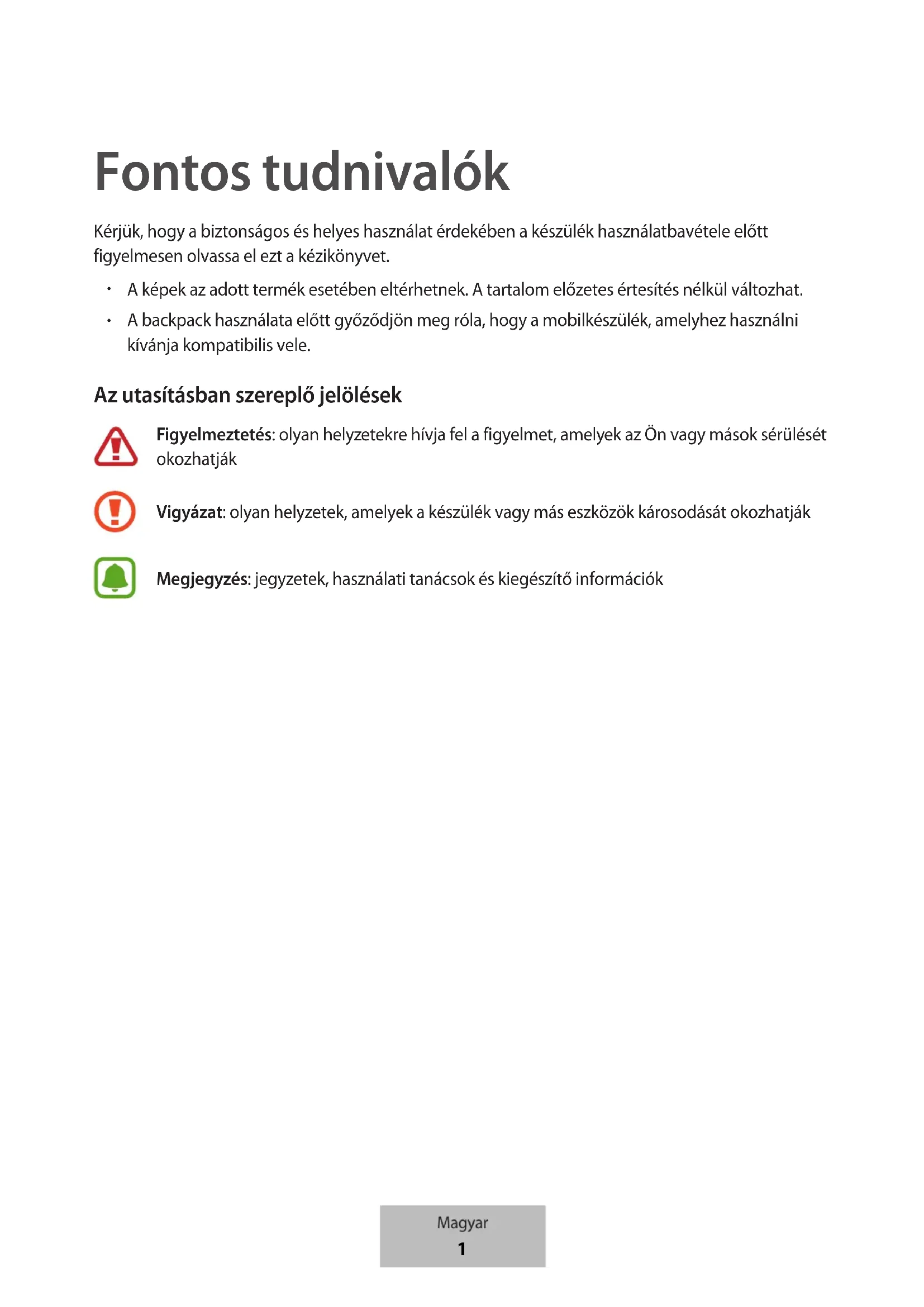 A backpack használata előtt győződjön meg róla, hogy a mobilkészülék, amelyhez használni kívánja kompatibilis vele. Az utasításban szereplő jelölések Figyelmeztetés: olyan helyzetekre hívja fel a figyelmet, amelyek az Ön vagy mások sérülését okozhatják Vigyázat: olyan helyzetek, amelyek a készülék vagy más eszközök károsodását okozhatják Megjegyzés: jegyzetek, használati tanácsok és kiegészítő információk Magyar