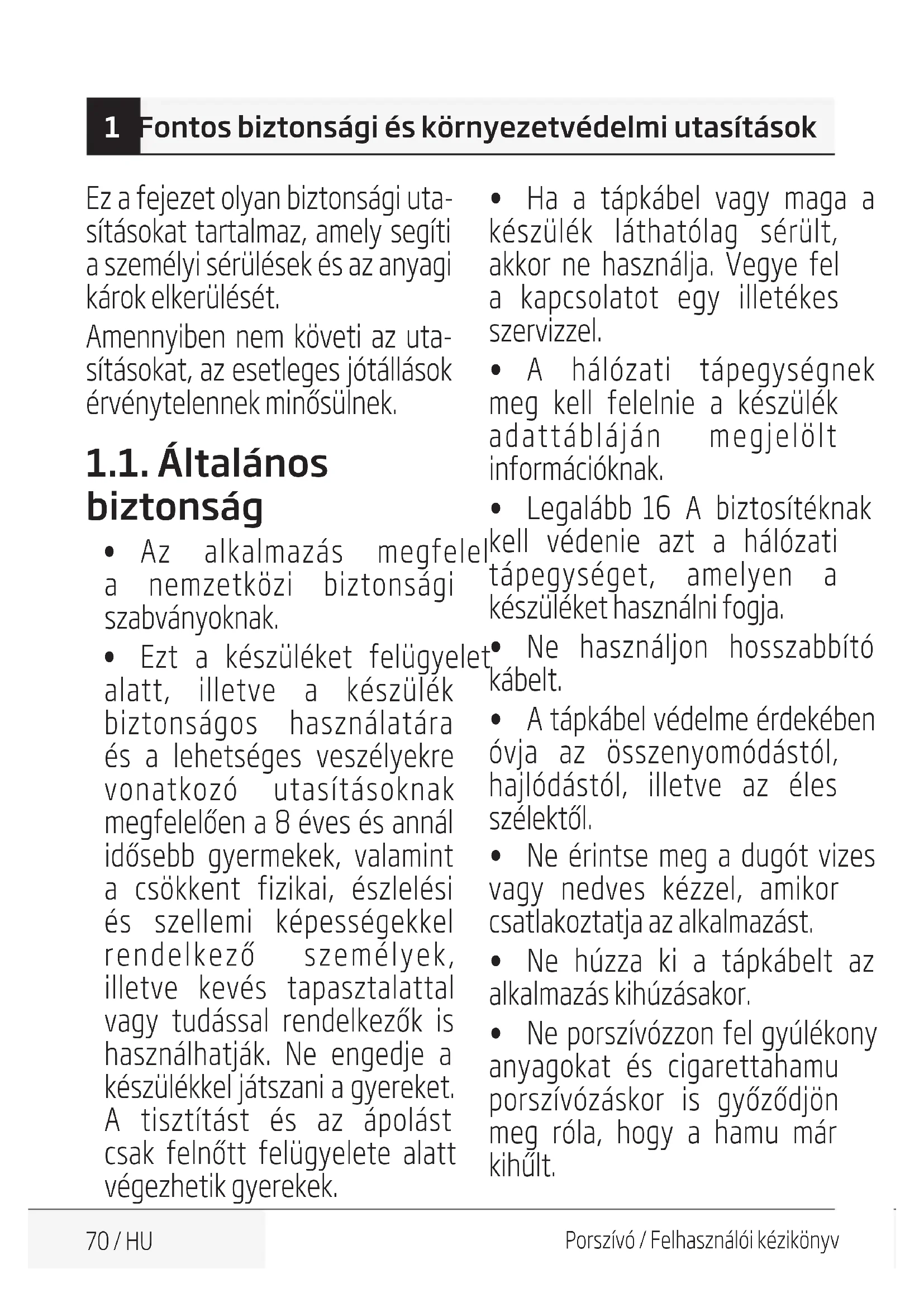 - Изпускането на уреда може да причини спиране на работата му или да доведе до трайна повреда. 4 Почистване и поддръжка70 / HU Porszívó / Felhasználói kézikönyv Ez a fejezet olyan biztonsági uta- sításokat tartalmaz, amely segíti a személyi sérülések és az anyagi károk elkerülését. Amennyiben nem követi az uta- sításokat, az esetleges jótállások érvénytelennek minősülnek. 1.1. Általános biztonság