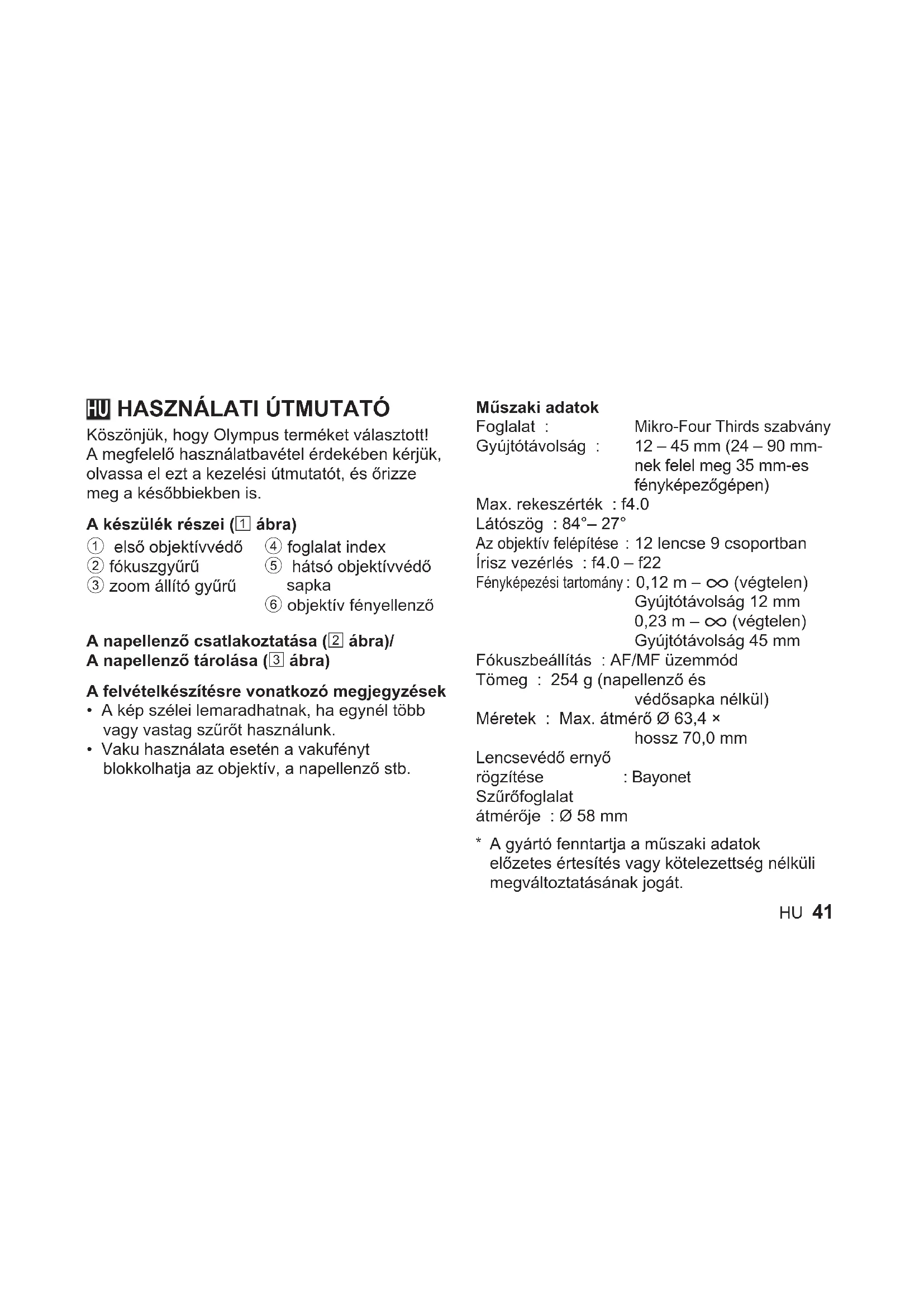 - Vaku használata esetén a vakufényt blokkolhatja az objektív, a napellenző stb. Műszaki adatok Foglalat : Mikro-Four Thirds szabvány Gyújtótávolság : 12 – 45 mm (24 – 90 mm- nek felel meg 35 mm-es fényképezőgépen) Max. rekeszérték : f4.0 Látószög : 84°– 27° Az objektív felépítése : 12 lencse 9 csoportban Írisz vezérlés : f4.0 – f22 Fényképezési tartomány : 0,12 m – ) (végtelen) Gyújtótávolság 12 mm 0,23 m – ) (végtelen) Gyújtótávolság 45 mm Fókuszbeállítás : AF/MF üzemmód Tömeg : 254 g (napellenző és védősapka nélkül) Méretek : Max. átmérő Ø 63,4 × hossz 70,0 mm Lencsevédő ernyő rögzítése : Bayonet Szűrőfoglalat átmérője : Ø 58 mm