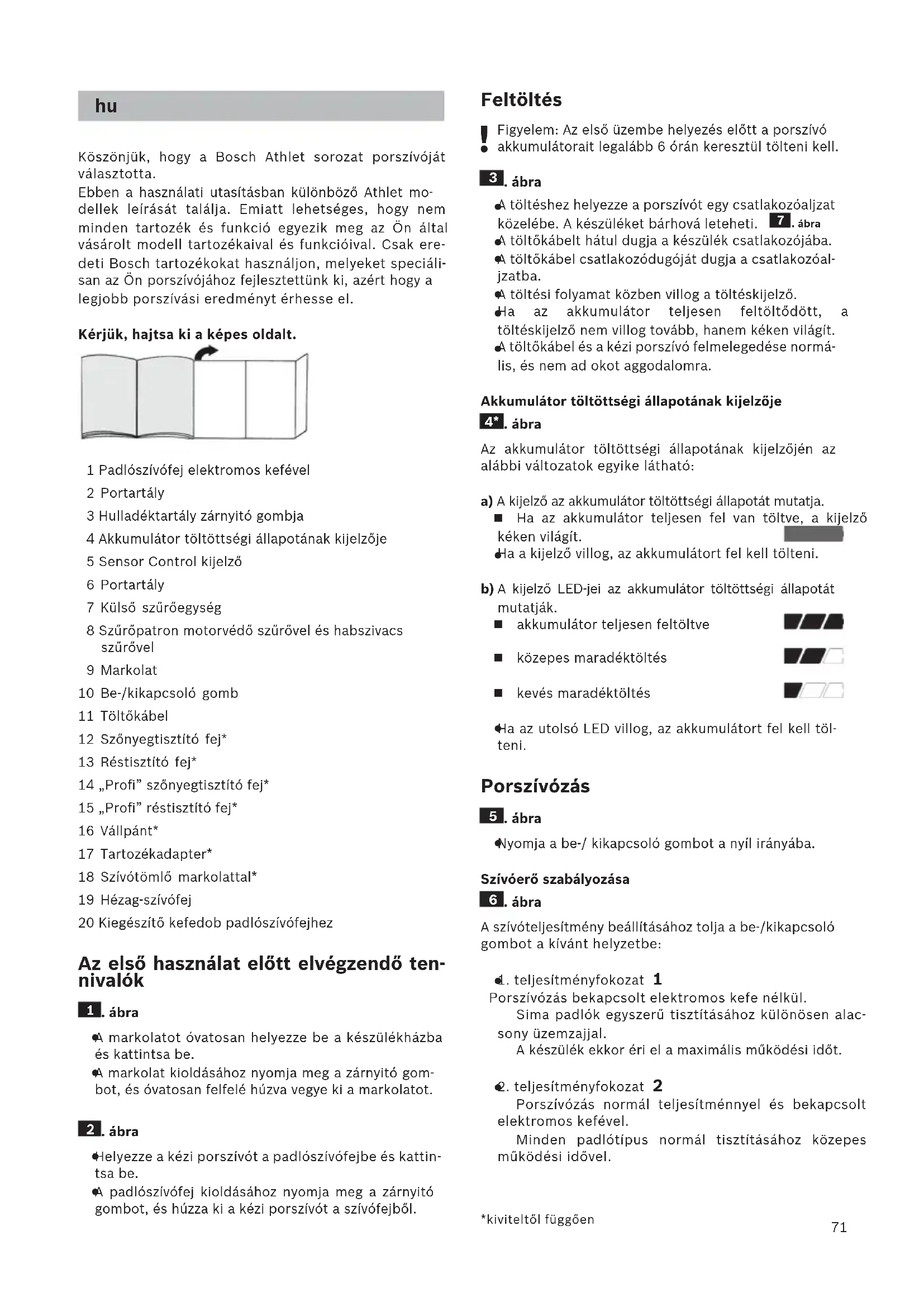 Köszönjük, hogy a Bosch Athlet sorozat porszívóját választotta. Ebben a használati utasításban különböző Athlet mo- dellek leírását találja. Emiatt lehetséges, hogy nem minden tartozék és funkció egyezik meg az Ön által vásárolt modell tartozékaival és funkcióival. Csak ere- deti Bosch tartozékokat használjon, melyeket speciáli- san az Ön porszívójához fejlesztettünk ki, azért hogy a legjobb porszívási eredményt érhesse el. Kérjük, hajtsa ki a képes oldalt. 1 Padlószívófej elektromos kefével 2 Portartály 3 Hulladéktartály zárnyitó gombja 4 Akkumulátor töltöttségi állapotának kijelzője 5 Sensor Control kijelző 6 Portartály 7 Külső szűrőegység 8 Szűrőpatron motorvédő szűrővel és habszivacs szűrővel 9 Markolat 10 Be-/kikapcsoló gomb 11 Töltőkábel 12 Szőnyegtisztító fej* 13 Réstisztító fej* 14 „Profi” szőnyegtisztító fej* 15 „Profi” réstisztító fej* 16 Vállpánt* 17 Tartozékadapter* 18 Szívótömlő markolattal* 19 Hézag-szívófej 20 Kiegészítő kefedob padlószívófejhez Az első használat előtt elvégzendő ten- nivalók
