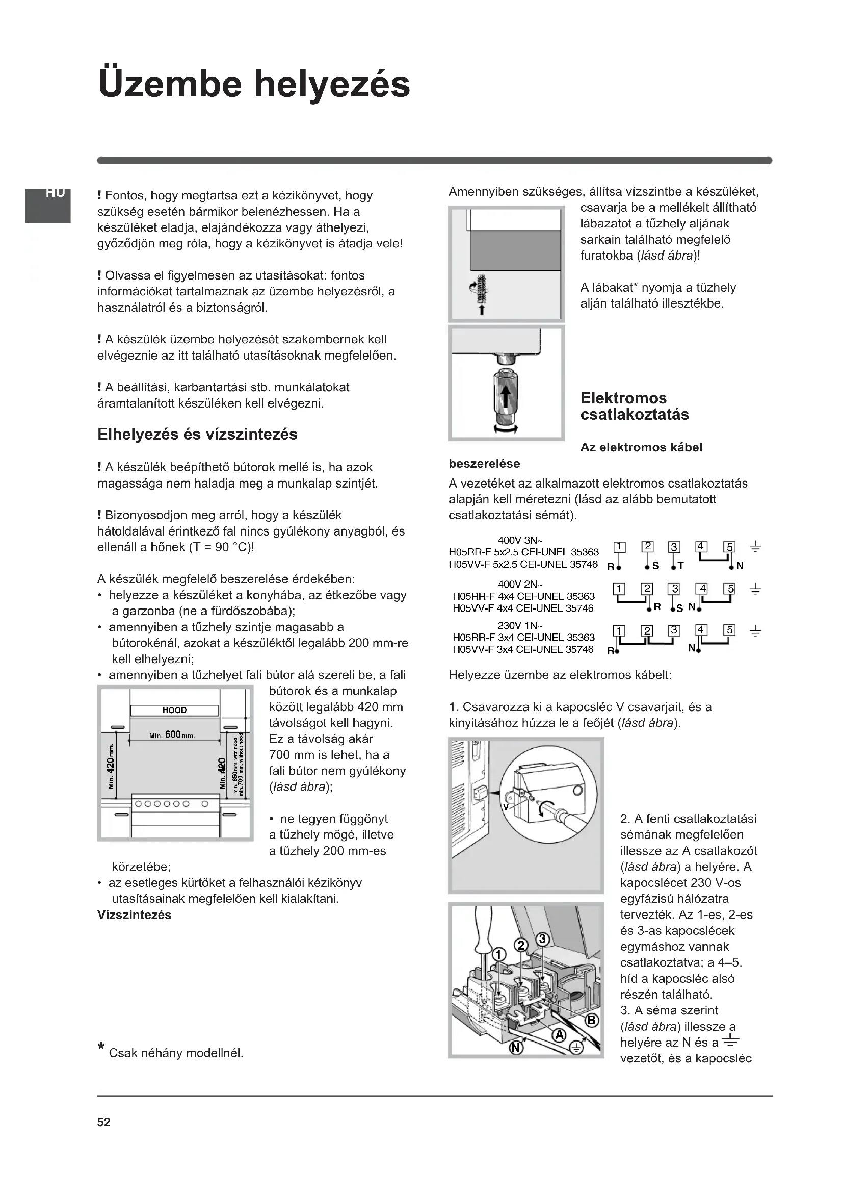 - az esetleges kürtőket a felhasználói kézikönyv utasításainak megfelelően kell kialakítani. Vízszintezés Amennyiben szükséges, állítsa vízszintbe a készüléket, csavarja be a mellékelt állítható lábazatot a tűzhely aljának sarkain található megfelelő furatokba (lásd ábra)! A lábakat* nyomja a tűzhely alján található illesztékbe. Elektromos csatlakoztatás Az elektromos kábel beszerelése A vezetéket az alkalmazott elektromos csatlakoztatás alapján kell méretezni (lásd az alább bemutatott csatlakoztatási sémát). Helyezze üzembe az elektromos kábelt: