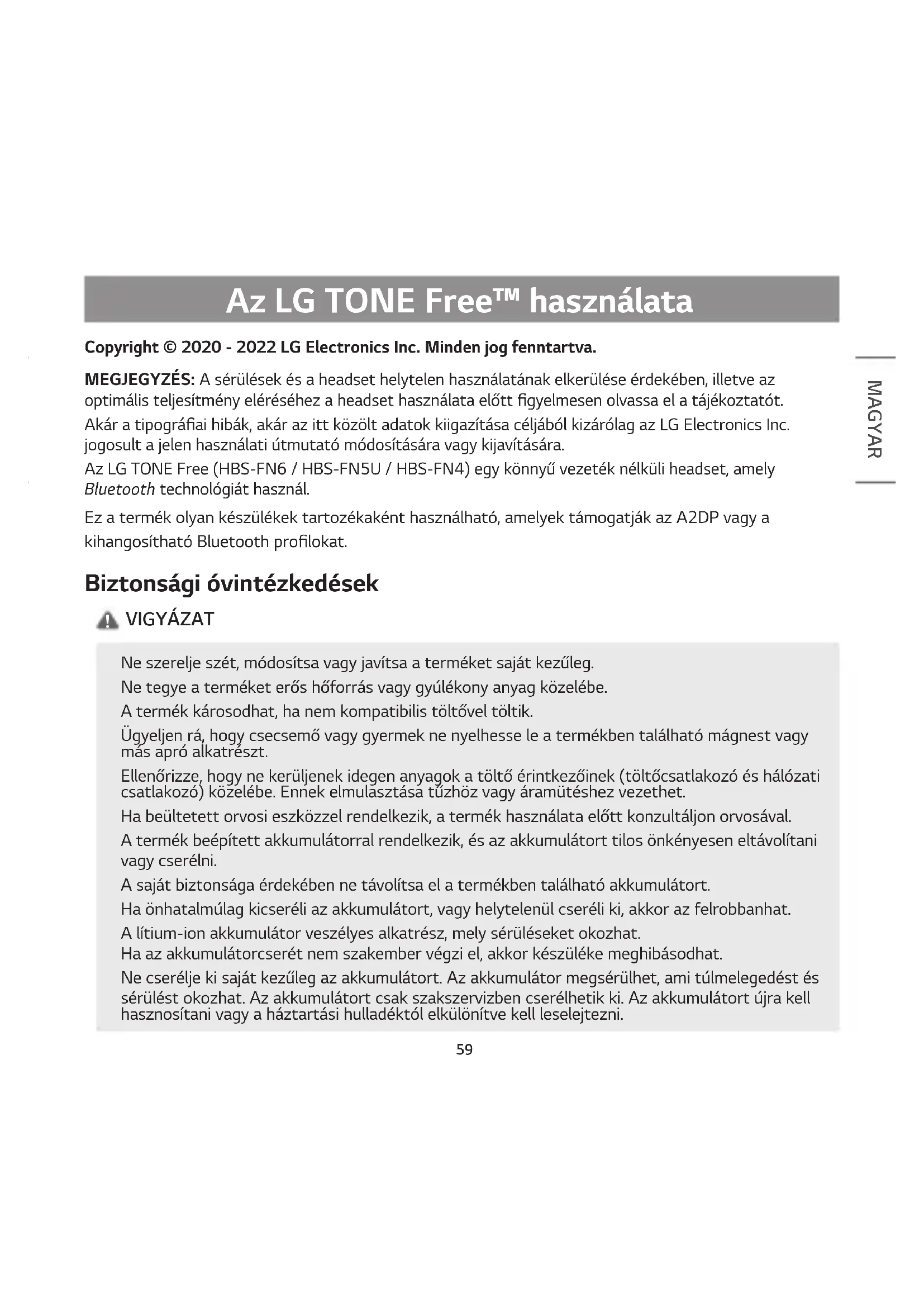 MAGYAR Copyright © 2020 - 2022 LG Electronics Inc. Minden jog fenntartva. MEGJEGYZÉS: A sérülések és a headset helytelen használatának elkerülése érdekében, illetve az optimális teljesítmény eléréséhez a headset használata előtt gyelmesen olvassa el a tájékoztatót. Akár a tipográai hibák, akár az itt közölt adatok kiigazítása céljából kizárólag az LG Electronics Inc. jogosult a jelen használati útmutató módosítására vagy kijavítására. Az LG TONE Free (HBS-FN6 / HBS-FN5U / HBS-FN4) egy könnyű vezeték nélküli headset, amely Bluetooth technológiát használ. Ez a termék olyan készülékek tartozékaként használható, amelyek támogatják az A2DP vagy a kihangosítható Bluetooth prolokat. Biztonsági óvintézkedések