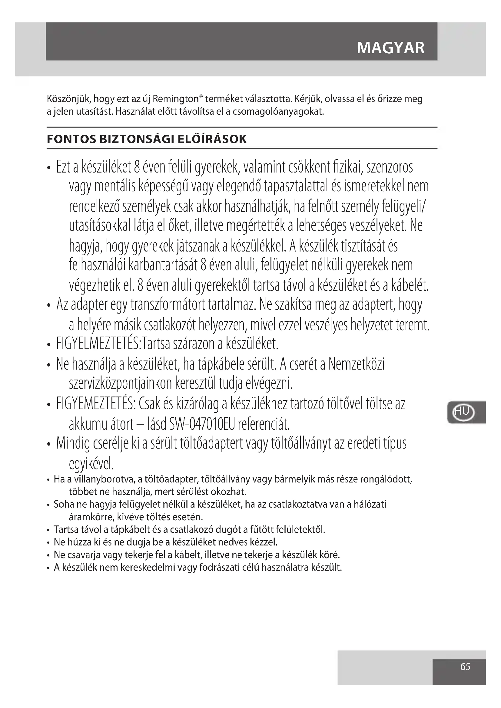 - Ezt a készüléket 8 éven felüli gyerekek, valamint csökkent fizikai, szenzoros vagy mentális képességű vagy elegendő tapasztalattal és ismeretekkel nem rendelkező személyek csak akkor használhatják, ha felnőtt személy felügyeli/ utasításokkal látja el őket, illetve megértették a lehetséges veszélyeket. Ne hagyja, hogy gyerekek játszanak a készülékkel. A készülék tisztítását és felhasználói karbantartását 8 éven aluli, felügyelet nélküli gyerekek nem végezhetik el. 8 éven aluli gyerekektől tartsa távol a készüléket és a kábelét.