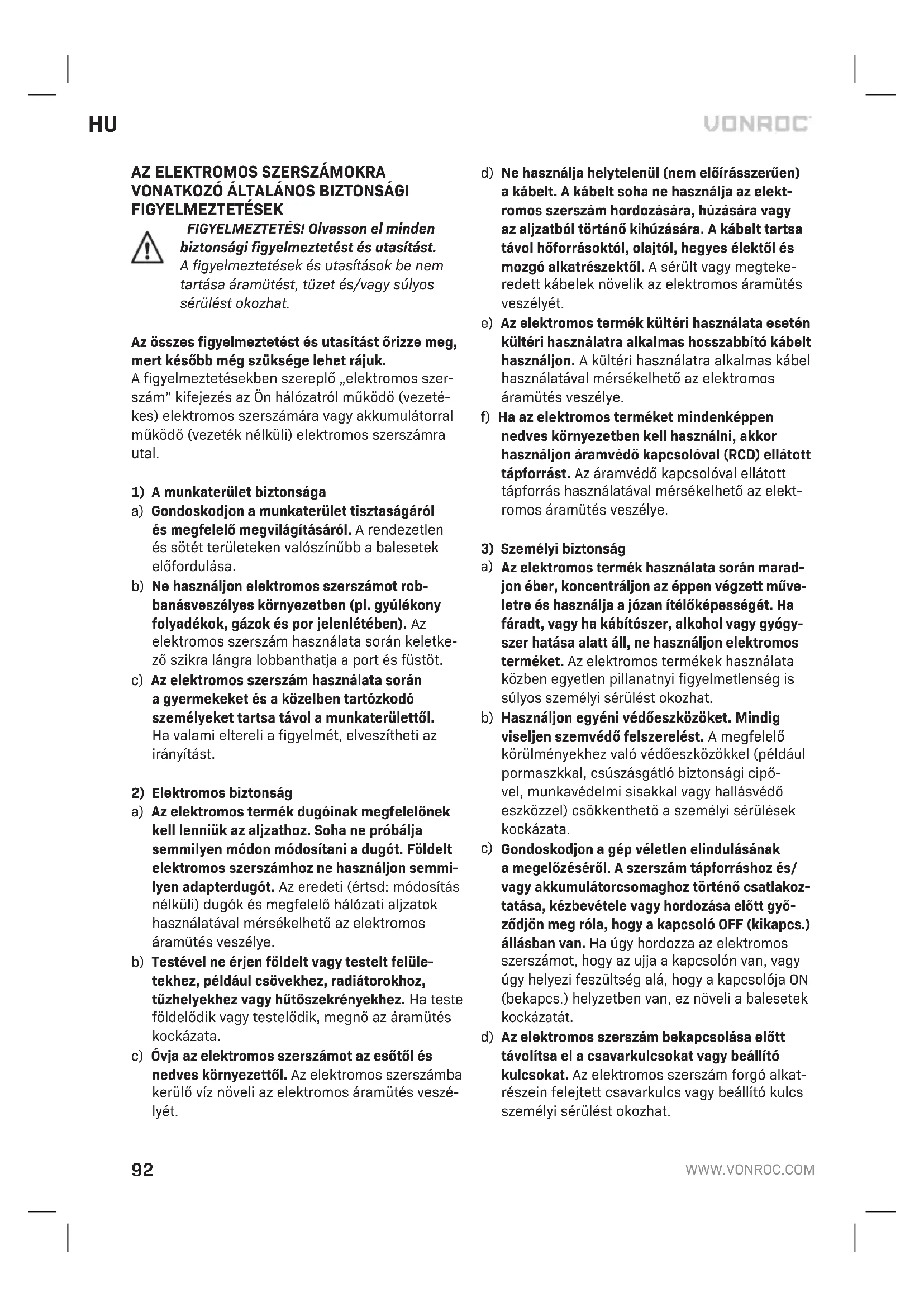 c) Ha az akkumulátor sérült, vagy rendellenesen használják, gőzök áramolhatnak belőle. Szel- lőztesse át amunkaterületet, és ha egészségi panaszai vannak, kérjen orvosi segítséget. Agőzök irritálhatják alégutakat. d) Az akkumulátort csak az Ön Vonroc-terméké- hez használja. Ezzel az intézkedéssel veszélyes túlterheléstől védi az akkumulátorát.
