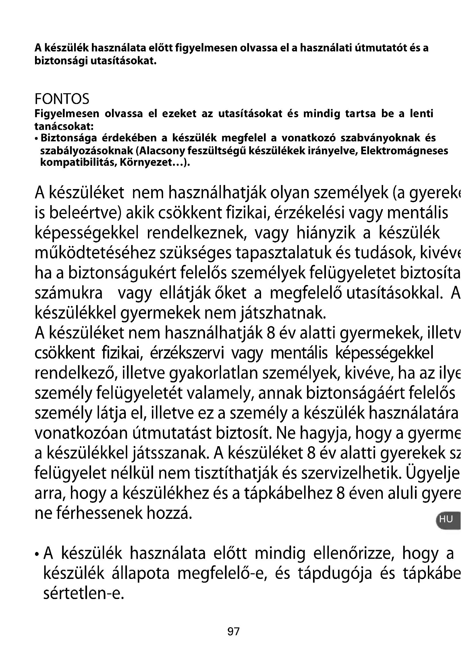 - Biztonsága érdekében a készülék megfelel a vonatkozó szabványoknak és szabályozásoknak (Alacsony feszültségű készülékek irányelve, Elektromágneses kompatibilitás, Környezet…). A készüléket nem használhatják olyan személyek (a gyerekeket is beleértve) akik csökkent fizikai, érzékelési vagy mentális képességekkel rendelkeznek, vagy hiányzik a készülék működtetéséhez szükséges tapasztalatuk és tudások, kivéve ha a biztonságukért felelős személyek felügyeletet biztosítanak számukra vagy ellátják őket a megfelelő utasításokkal. A készülékkel gyermekek nem játszhatnak. A készüléket nem használhatják 8 év alatti gyermekek, illetve csökkent fizikai, érzékszervi vagy mentális képességekkel rendelkező, illetve gyakorlatlan személyek, kivéve, ha az ilyen személy felügyeletét valamely, annak biztonságáért felelős személy látja el, illetve ez a személy a készülék használatára vonatkozóan útmutatást biztosít. Ne hagyja, hogy a gyermekek a készülékkel játsszanak. A készüléket 8 év alatti gyerekek szülői felügyelet nélkül nem tisztíthatják és szervizelhetik. Ügyeljen arra, hogy a készülékhez és a tápkábelhez 8 éven aluli gyerekek ne férhessenek hozzá.