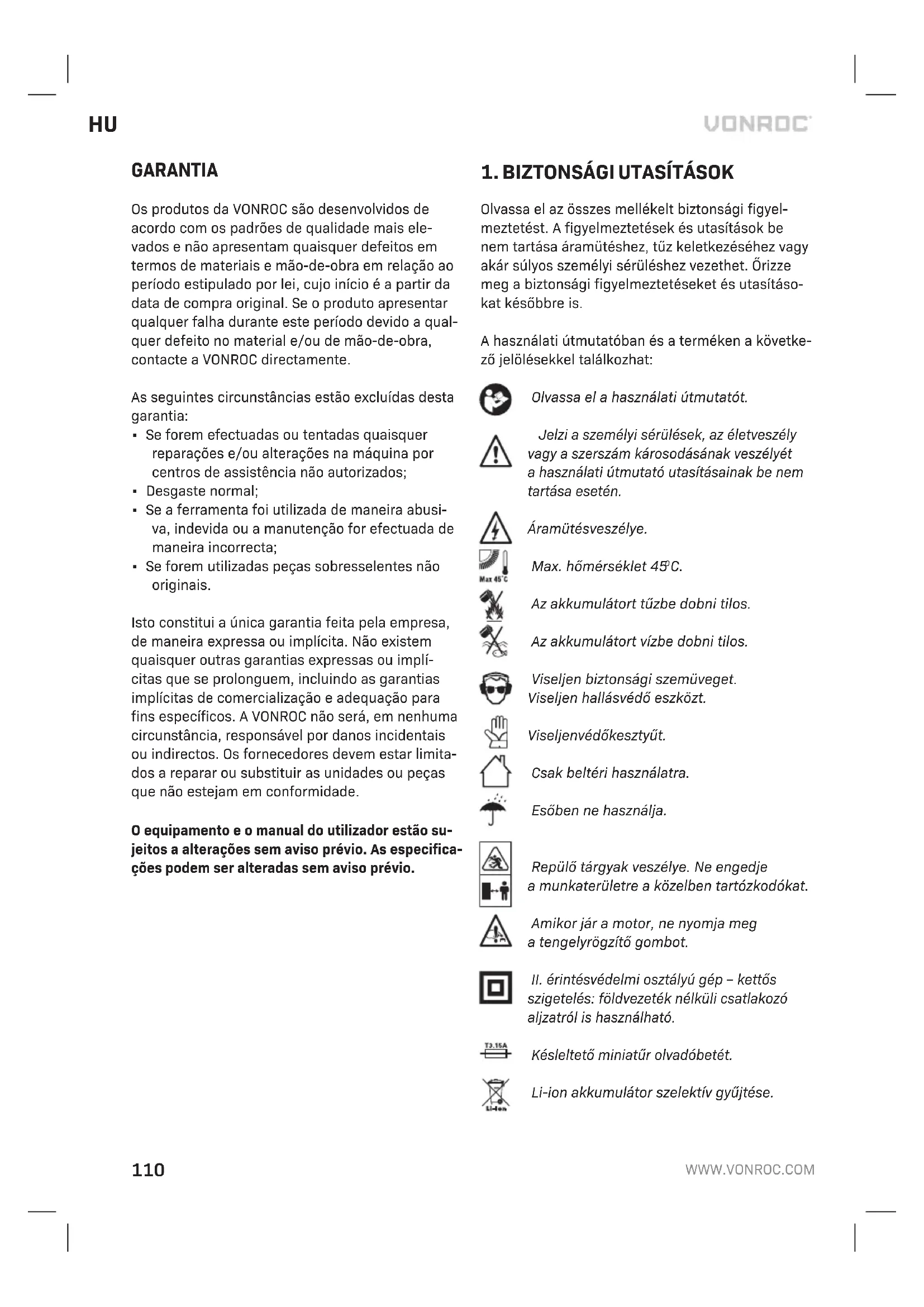 CD802AA Gyorstöltő AVONROC VPOWER 20 Vakkumulátor-platformok csereszabatosak minden VONROC VPOWER 20 Vakkumulátor-platformos szerszámmal. Rezgésértékek Ahasználati útmutatóban megadott rezgéskibocsá- tási értékek mérése az EN60745 szabvány szerinti egységesített eljárással történt; az értékek használ- hatók gépek összehasonlítására és amunkavégzés közbeni rezgés terhelés előzetes megbecslésére az adott alkalmazási területen.