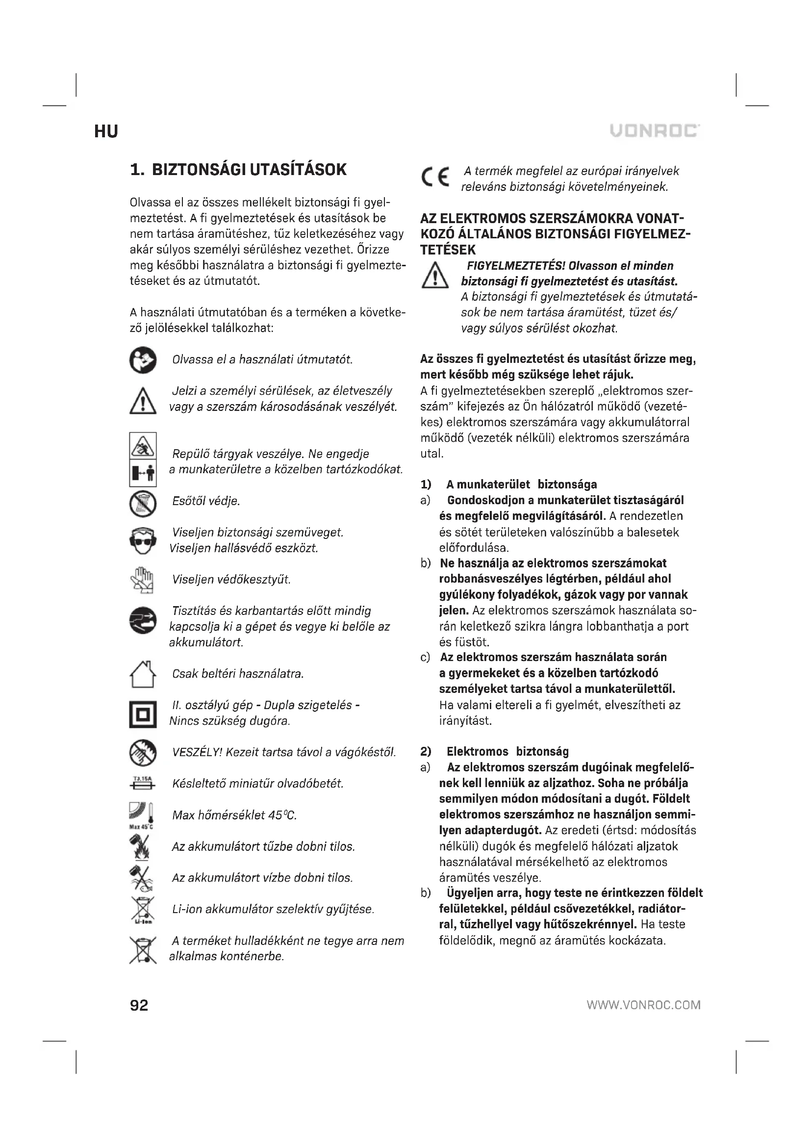 c) Ha az akkumulátor sérült, vagy rendellenesen használják, gőzök áramolhatnak belőle. Szel- lőztesse át amunkaterületet, és ha egészségi panaszai vannak, kérjen orvosi segítséget. Agőzök irritálhatják alégutakat. d) Az akkumulátort csak aVonroc termékéhez használja. Ezzel az intézkedéssel veszélyes túlterheléstől védi az akkumulátorát. e) Az akkumulátor megsérülhet, ha akülsejét he- gyes tárggyal (pl. szeggel, csavarhúzóval) vagy erőszakosan manipulálják. Belső rövidzárlat következhet be, amitől az akkumulátor leéghet, füstölhet, robbanhat vagy túlmelegedhet. ATÖLTŐRE VONATKOZÓ BIZTONSÁGI FIGYEL MEZTETÉSEK Rendeltetése Atöltővel kizárólag CD801AA és CD803AA típusú újratölthető akkumulátorcsomagokat töltsön fel. Másfajta akkumulátorok használata személyi sérülést és károkat okozhat.