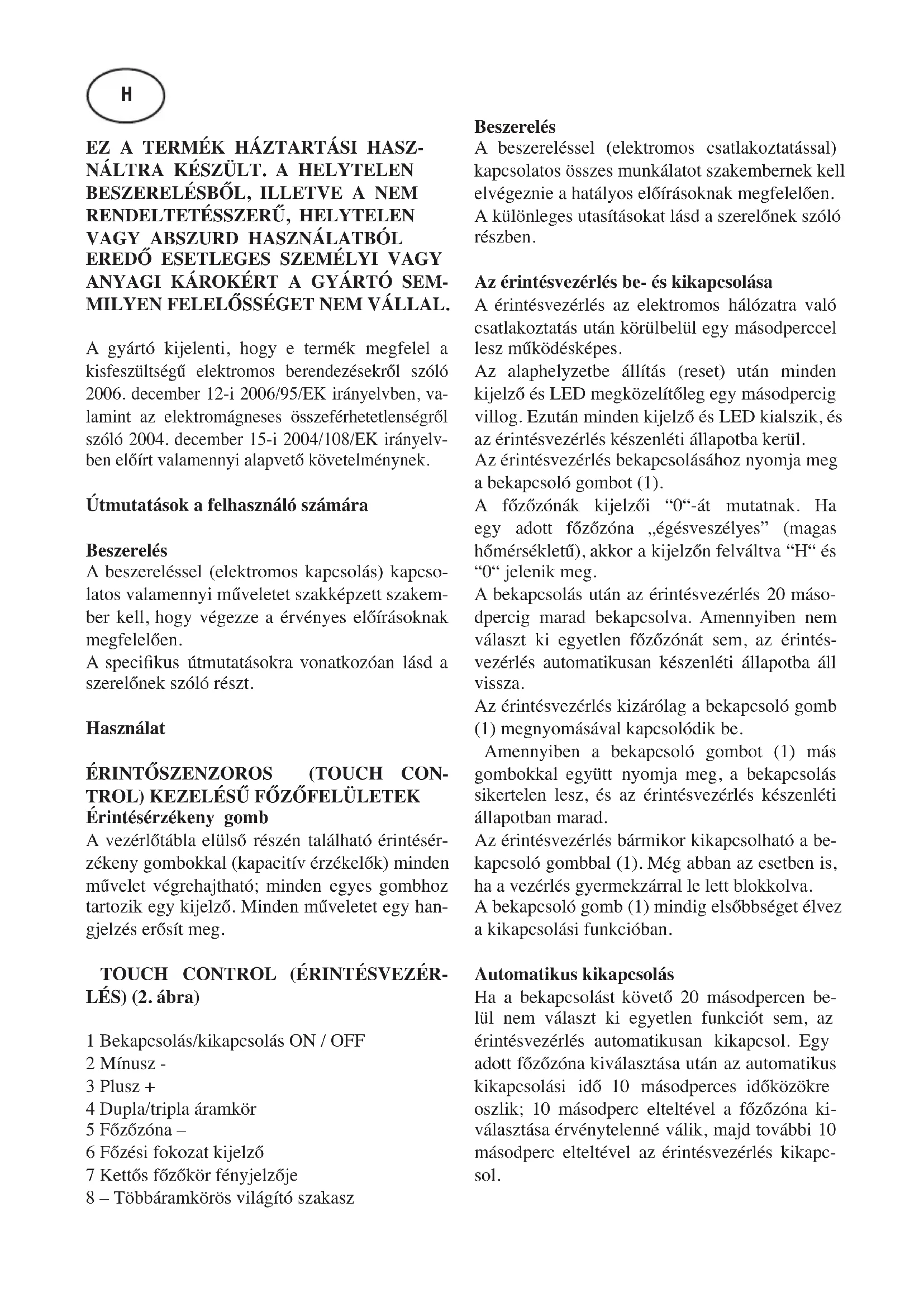 LÉS) (2. ábra) 1 Bekapcsolás/kikapcsolás ON / OFF 2 Mínusz - 3 Plusz + 4 Dupla/tripla áramkör 5 Főzőzóna – 6 Főzési fokozat kijelző 7 Kettős főzőkör fényjelzője 8 – Többáramkörös világító szakasz Beszerelés A beszereléssel (elektromos csatlakoztatással) kapcsolatos összes munkálatot szakembernek kell elvégeznie a hatályos előírásoknak megfelelően. A különleges utasításokat lásd a szerelőnek szóló részben. Az érintésvezérlés be- és kikapcsolása A érintésvezérlés az elektromos hálózatra való csatlakoztatás után körülbelül egy másodperccel lesz működésképes. Az alaphelyzetbe állítás (reset) után minden kijelző és LED megközelítőleg egy másodpercig villog. Ezután minden kijelző és LED kialszik, és az érintésvezérlés készenléti állapotba kerül. Az érintésvezérlés bekapcsolásához nyomja meg a bekapcsoló gombot (1). A főzőzónák kijelzői “0“-át mutatnak. Ha egy adott főzőzóna „égésveszélyes” (magas hőmérsékletű), akkor a kijelzőn felváltva “H“ és “0“ jelenik meg. A bekapcsolás után az érintésvezérlés 20 máso- dpercig marad bekapcsolva. Amennyiben nem választ ki egyetlen főzőzónát sem, az érintés- vezérlés automatikusan készenléti állapotba áll vissza. Az érintésvezérlés kizárólag a bekapcsoló gomb (1) megnyomásával kapcsolódik be. Amennyiben a bekapcsoló gombot (1) más gombokkal együtt nyomja meg, a bekapcsolás sikertelen lesz, és az érintésvezérlés készenléti állapotban marad. Az érintésvezérlés bármikor kikapcsolható a be- kapcsoló gombbal (1). Még abban az esetben is, ha a vezérlés gyermekzárral le lett blokkolva. A bekapcsoló gomb (1) mindig elsőbbséget élvez a kikapcsolási funkcióban. Automatikus kikapcsolás Ha a bekapcsolást követő 20 másodpercen be- lül nem választ ki egyetlen funkciót sem, az érintésvezérlés automatikusan kikapcsol. Egy adott főzőzóna kiválasztása után az automatikus kikapcsolási idő 10 másodperces időközökre oszlik; 10 másodperc elteltével a főzőzóna ki- választása érvénytelenné válik, majd további 10 másodperc elteltével az érintésvezérlés kikapc- sol. HEgy adott főzőzóna be- és kikapcsolása Ha az érintésvezérlés be van kapcsolva, az adott főzőzónát a hozzá tartozó gomb (5) megnyomá- sával választhatja ki. A kiválasztott főzőzóna kijelzője (6) fényesebbé válik, miközben a többi kijelző elhalványodik. Ha a főzőzóna „égésveszélyes”, akkor a “H” és “0” jelzések felváltva jelennek meg. A PLUSZ (3) illetve MINUSZ (2) gomb megn- yomásával kiválaszthat egy adott főzési fokoza- tot, majd a főzőzóna melegíteni kezd. A főzőzóna kiválasztása után, a PLUSZ (3) gomb megnyomásával kiválaszthatja a főzési fokozatot; ez az 1-es szintről indulva 0,4 másodpercenként egy-egy egységgel növelhető. A 9-es szint eléré- se után a főzési fokozat tovább nem növelhető. Ha a főzési fokozatot a MÍNUSZ (2) gombbal választotta ki, a kiindulási szint a 9-es (maximá- lis szint). A gombot benyomva tartva a főzési fokozat 0,4 másodpercenként egy-egy egységgel csökken. A 0 szint elérése után a főzési fokozat nem csökkenthető tovább. A beállított főzési fokozatot csak a PLUSZ (2), illetve MÍNUSZ (3) gombok újbóli megnyomásával lehet módosíta- ni. Egy adott főzőzóna kikapcsolása A kikapcsolandó főzőzónát a hozzá tartozó (5) gombbal tudja kiválasztani. A kiválasztott főzőzóna kijelzője (6) fényesebb lesz, miköz- ben a többi kijelző elhalványodik. A PLUSZ (3), illetve MÍNUSZ (2) gombok egyidejű megnyo- másával az adott főzőzóna főzési fokozata 0-ra áll. Választhatja azt a megoldást is, hogy a főzési fokozatot a MÍNUSZ (2) gombbal csökkenteni le a 0-ra. Ha egy adott főzőzóna „égésveszélyes”, akkor a kijelzőn felváltva “H“ és “0“ jelzés jelenik meg. Az összes főzőzóna kikapcsolása A bekapcsoló gomb (1) megnyomásával az ös- szes főzőzóna bármikor azonnal kikapcsolható. Készenléti üzemmódban egy “H“ jelenik meg az összes „égésveszélyes” főzőzóna kijelzőjén. Az összes többi kijelző kikapcsol. Főzési fokozat A főzőzónák 9 főzési fokozattal rendelkeznek, amelyek “1“-től “9“-ig terjedő számjelzés- sel jelennek meg a hét szegmensből álló LED kijelzőkön (6). Maradékhő kijelző Jelzi a felhasználónak, hogy az üvegkerámia hőmérséklete veszélyes a főzőzóna területével való érintkezés esetén. A hőmérséklet egy ma- tematikai modell szerint kerül meghatározásra, és maradékhő esetén az adott hét szegmensű kijelzőn egy “H” jelzi. A melegítés és a hűtés az alábbiak alapján kerül kiszámításra: