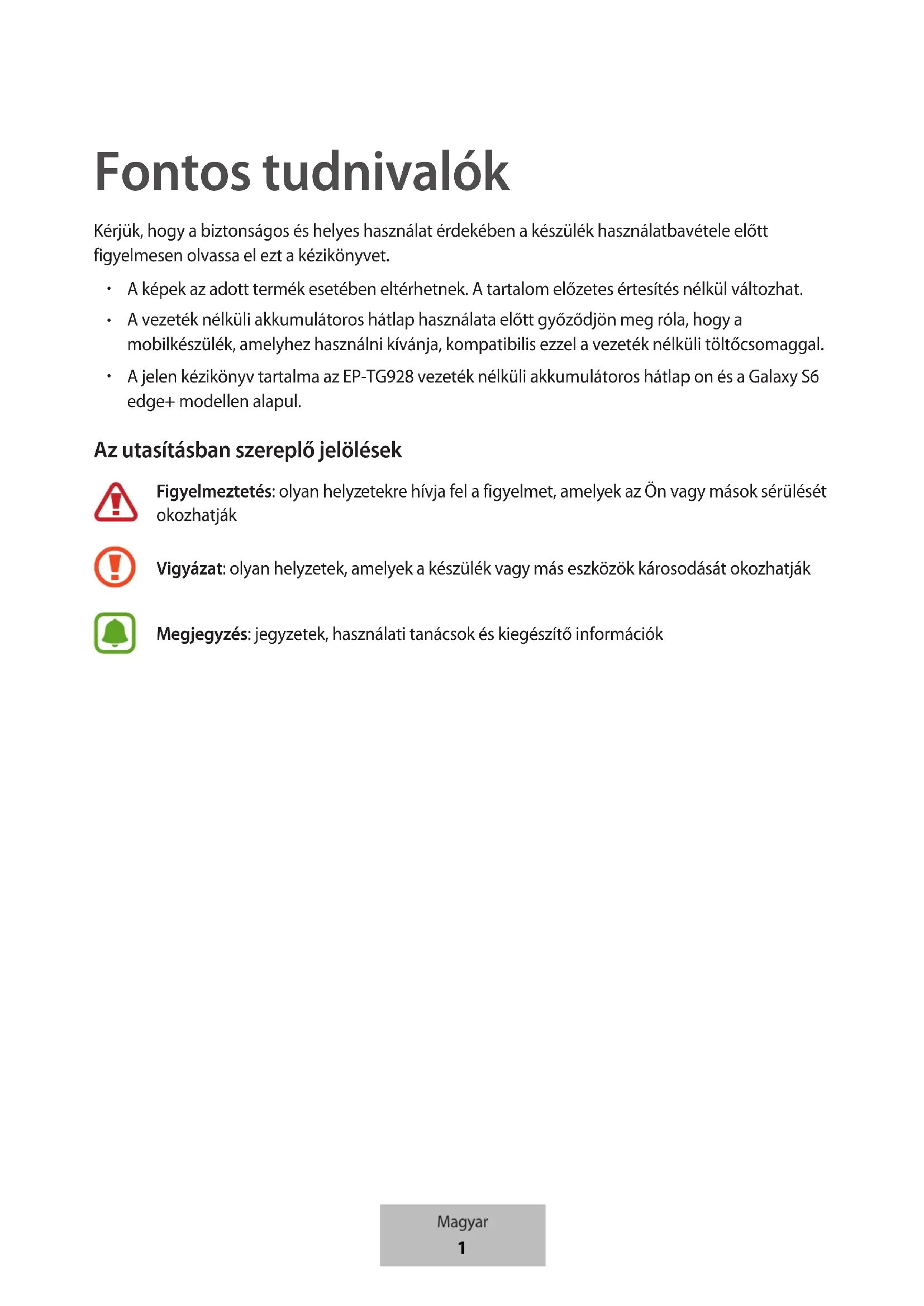 A jelen kézikönyv tartalma az EP-TG928 vezeték nélküli akkumulátoros hátlap on és a Galaxy S6 edge+ modellen alapul. Az utasításban szereplő jelölések Figyelmeztetés: olyan helyzetekre hívja fel a figyelmet, amelyek az Ön vagy mások sérülését okozhatják Vigyázat: olyan helyzetek, amelyek a készülék vagy más eszközök károsodását okozhatják Megjegyzés: jegyzetek, használati tanácsok és kiegészítő információk Magyar