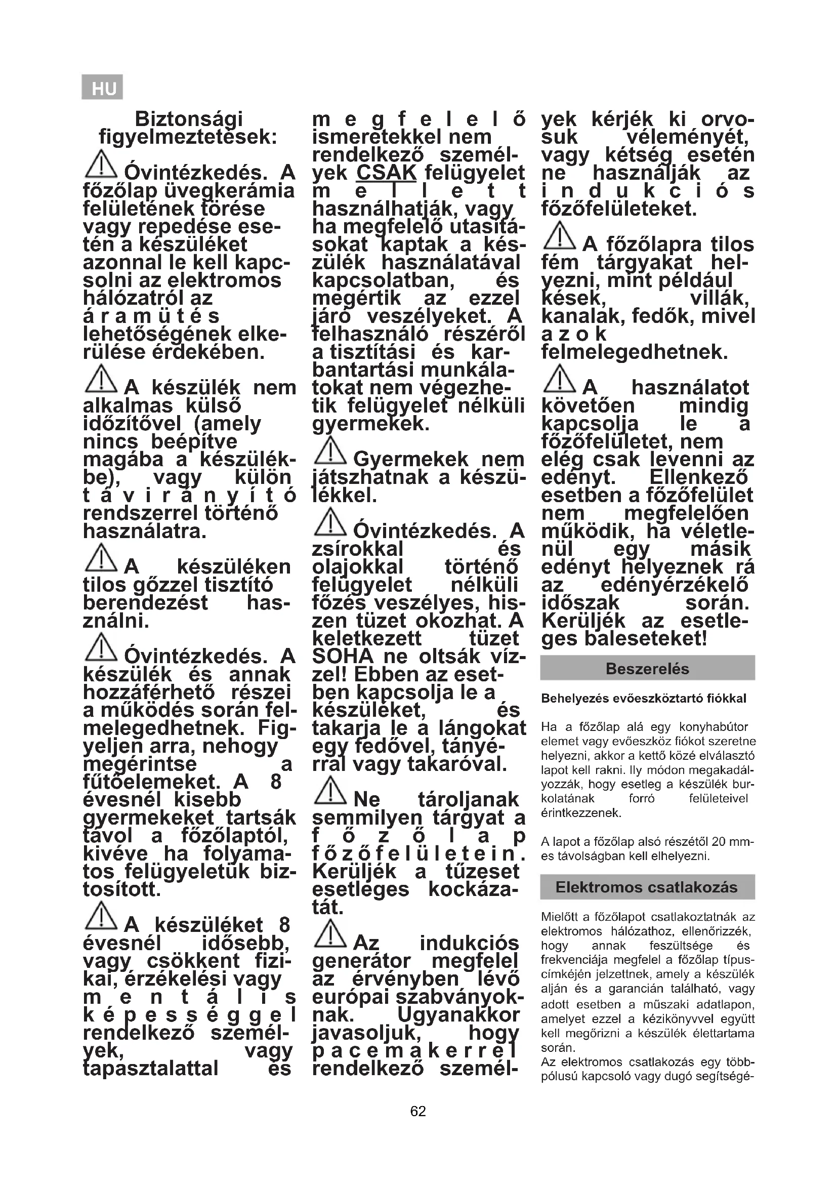 Védett kés Nem védett kés A kaparó használata 66megfelelően helyezik el a hulladékot, hozzájárulnak ahhoz, hogy elkerüljék a környezetre és a közegészségre esetleg káros negatív követkeményeket, amelyek előfordulhatnak abban az esetben, ha a terméket nem a megfelelő módon ártalmatlanítják. A termék újrafeldogozásával kapcsolatos további részletes információ beszer-zése érdekében vegyék fel a kapcso-latot a helyi hatóságokkal, a hulladékelhelyezésért felelős szolgá-lattal, vagy az üzlettel, ahol a termé-ket vásárolták. A termék csomagolóanyagai ökoló- giaiak és teljes mértékben újrahasznosíthatóak. A műanyag alkotóalemeket >PE<, >LD<, >EPS<, stb. jelölték. A csomagolóanyago-kat háztartási hulladékként dobják ki a megfelelő önkormányzati konténerbe. Teljesítésének az Energiahatékony- sági a készülék: Mielőtt a Műszaki Szervizt kihívná, végezze el a következő ellenőrzéseket. A főzőlap nem működik: Ellenőrizze, hogy a hálózati kábel csatlakoztatva van-e a megfelelő aljzathoz. Az indukciós főzőfelületek nem melegednek fel: Az edény nem megfelelő (a feneke nem mágneses, vagy túl kicsi). Ellenőrizze, hogy az edény alja még- neses, vagy használjon nagyobb edényt. A főzés kezdetén egy rezgő hangot lehet hallani az indukciós felületeken: A nem nagyon vastag edények eseté- ben, vagy amelyek nem egy darabból állnak, a rezgő hang az edény fenekére történő közvetlen energiaát- vitel következménye. Ez a hang nem meghibásodást jelez, de ha minden- képp meg szeretné szüntetni, akkor csökkentse kissé a kiválasztott teljesit- ményszintet, vagy használjon vastagabb fenekű edényt és/vagy amelyik egy darabból áll. Az érintőgombok nem kapcsolnak be, vagy ha bekapcsolnak, akkor nem reagálnak: Nem választott ki főzőfelületet. Győződjenek meg, hogy kiválasztottak egy főzőfelületet, mielőtt azt bekapcsolnák. Az érzékelőkön nedvesség van és/vagy az Ön ujjai nedvesek. Tartsa tisztán és szárazon az érintőgombok felületét és/ vagy ujjait. A lezárás be van kapcsolva. Oldja fel a lezárást. A főzés alatt szellőző hangot hall, amely akkor is folytatódik, amikor a főzőlapot lekapcsolja: Az indukciós felületeknél egy ventillátor található, amely hűti az elektronikát. Ez csak akkor működik, amikor az elektronika felmelegszik, és ha ennek hőmérséklete csökken, akkor automatikusan kikapcsol, attól függetlenül, hogy a főzőlap be van-e kapcsolva. Az egyik főzőfelület teljesítménykijelzőjén megjelenik a szimbólum: Az indukciós rendszer nem talál edényt a főzőfelületen, vagy a rátett edény nem megfelelő. Egy főzőfelület kikapcsol és a C81 vagy C82 üzenet jelenik meg a kijelzőkön: Az elektronika vagy az üveg túl magas hőmérséklete. Várjon egy ideig, hogy az elektronika lehűljön, vagy vegye le az edényt, hogy az üveg lehűljön. Az egyik főzőfelület teljesítménykijelzőjén megjelenik a C85 üzenet: A használt edény nem megfelelő. Kapcsolja le a főzőlapot, majd kapc-solja vissza, és próbálja másik edénn-yel.
