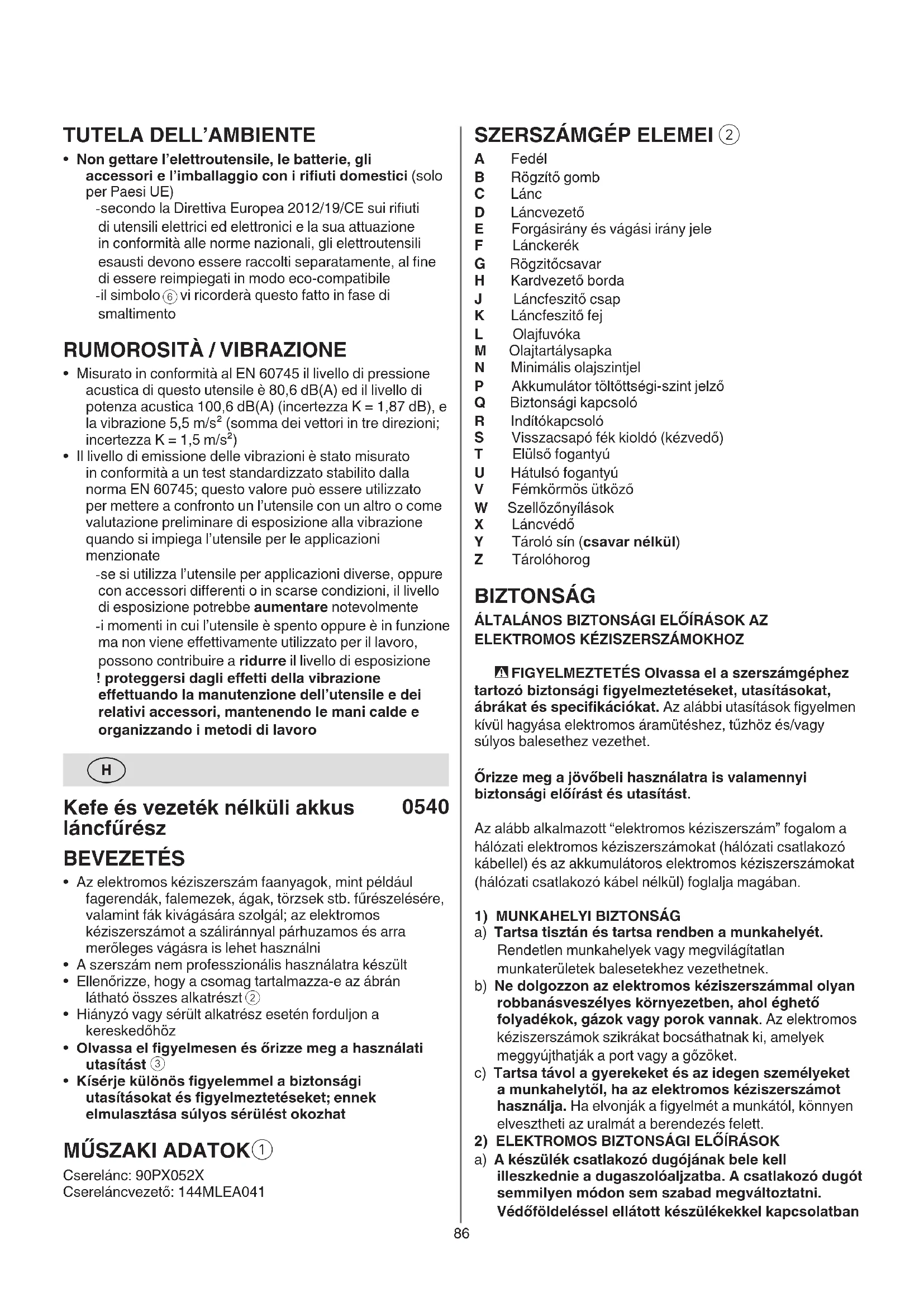 A Fedél B Rögzítő gomb C Lánc D Láncvezető E Forgásirány és vágási irány jele F Lánckerék G Rögzitőcsavar H Kardvezető borda J Láncfeszitő csap K Láncfeszitő fej L Olajfuvóka M Olajtartálysapka N Minimális olajszintjel P Akkumulátor töltőttségi-szint jelző Q Biztonsági kapcsoló R Indítókapcsoló S Visszacsapó fék kioldó (kézvedő) T Elülső fogantyú U Hátulsó fogantyú V Fémkörmös ütköző W Szellőzőnyílások X Láncvédő Y Tároló sín (csavar nélkül) Z Tárolóhorog BIZTONSÁG ÁLTALÁNOS BIZTONSÁGI ELŐÍRÁSOK AZ