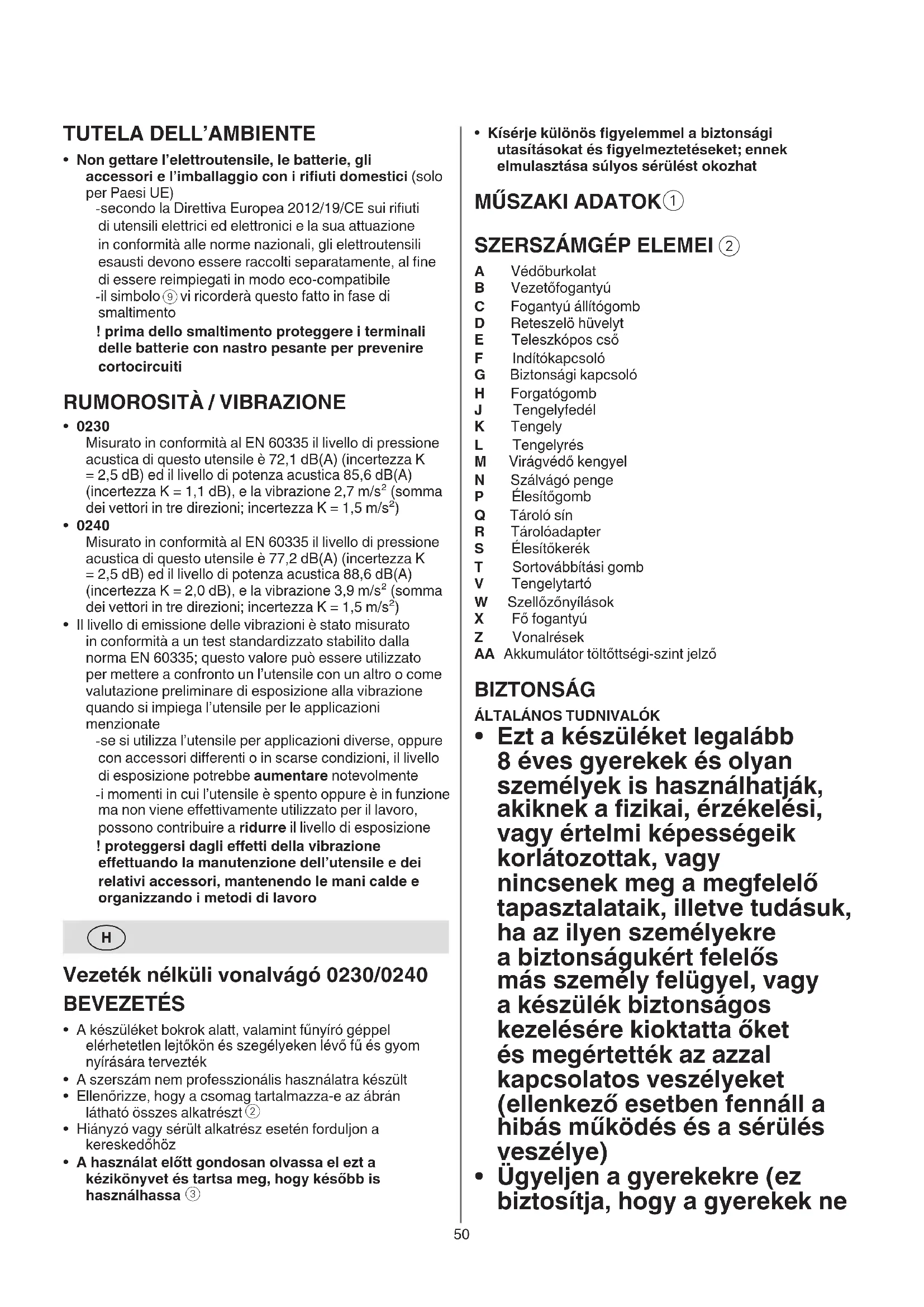 - 0240 Az EN 60335 alapján végzett mérések szerint ezen készülék hangnyomás szintje 77,2 dB(A) (szórás K = 2,5 dB) a hangteljesítmény szintje 88,6 dB(A) (szórás K = 2,0 dB), a rezgésszám 3,9 m/s² (a három irány vektorösszege; szórás K = 1,5 m/s²)