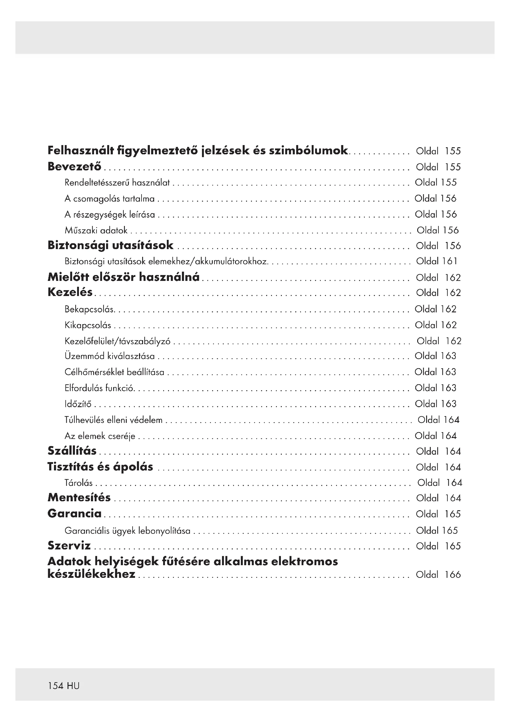 Felhasznált figyelmeztető jelzések és szimbólumok............. Oldal 155 Bevezető ............................................................... Oldal 155 Rendeltetésszerű használat ................................................. Oldal 155 A csomagolás tartalma .................................................... Oldal 156 A részegységek leírása .................................................... Oldal 156 Műszaki adatok .......................................................... Oldal 156 Biztonsági utasítások ................................................ Oldal 156 Biztonsági utasítások elemekhez/akkumulátorokhoz.............................. Oldal 161 Mielőtt először használná ........................................... Oldal 162 Kezelés................................................................. Oldal 162 Bekapcsolás............................................................. Oldal 162 Kikapcsolás ............................................................. Oldal 162 Kezelőfelület/távszabályzó ................................................. Oldal 162 Üzemmód kiválasztása .................................................... Oldal 163 Célhőmérséklet beállítása .................................................. Oldal 163 Elfordulás funkció......................................................... Oldal 163 Időzítő ................................................................. Oldal 163 Túlhevülés elleni védelem ................................................... Oldal 164 Az elemek cseréje ........................................................ Oldal 164 Szállítás ................................................................ Oldal 164 Tisztítás és ápolás .................................................... Oldal 164 Tárolás . . . . . . . . . . . . . . . . . . . . . . . . . . . . . . . . . . . . . . . . . . . . . . . . . . . . . . . . . . . . . . ... Oldal 164 Mentesítés ............................................................. Oldal 164 Garancia ............................................................... Oldal 165 Garanciális ügyek lebonyolítása ............................................. Oldal 165 Szerviz ................................................................. Oldal 165 Adatok helyiségek fűtésére alkalmas elektromos készülékekhez ........................................................ Oldal 166155