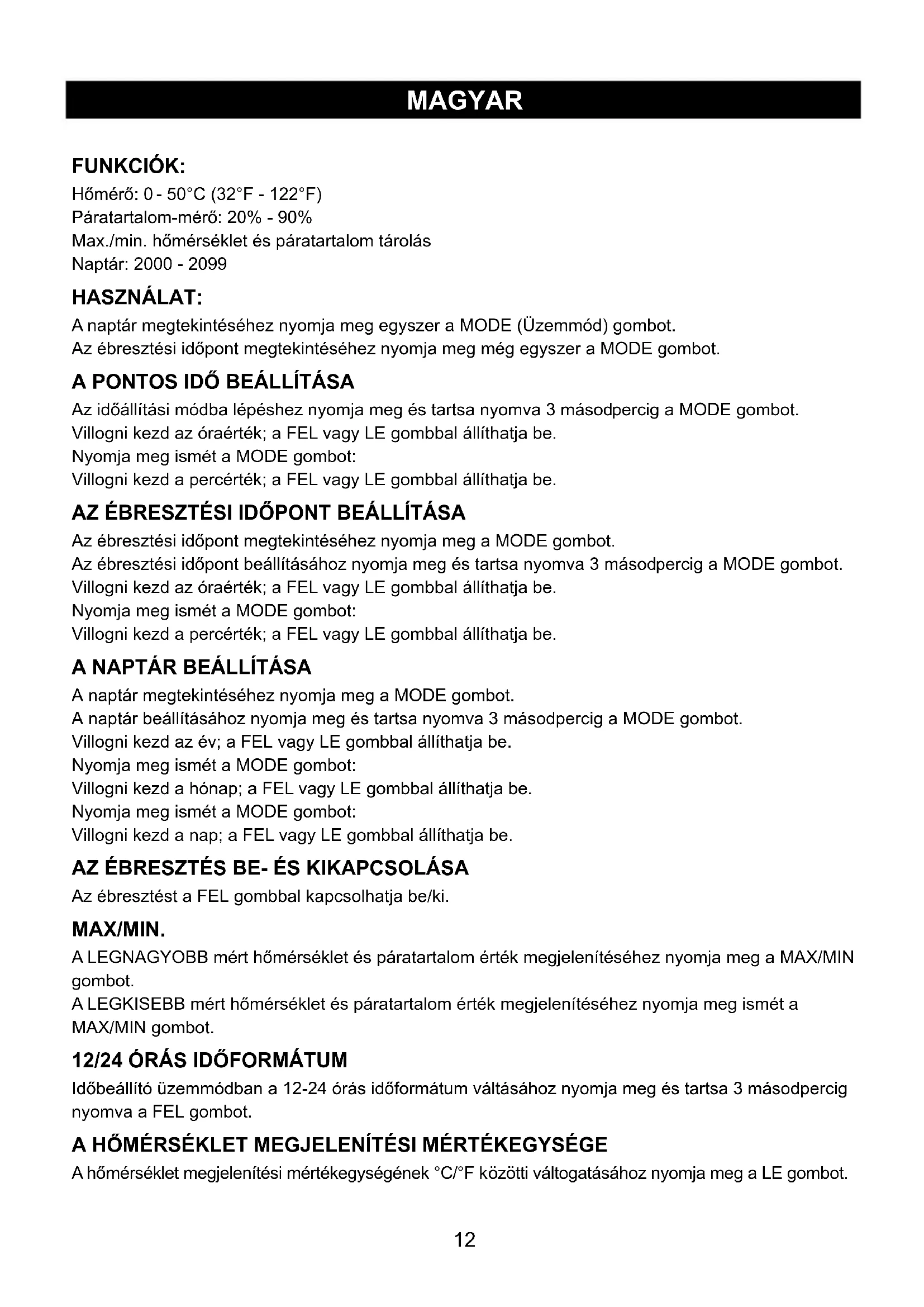 Pulse SNZ para el modo de repetición en la alarma. Medidas de seguridad: Para reducir el peligro de descarga eléctrica, este producto SÓLO lo debería abrir un técnico autorizado cuando necesite reparación. Desconecte el producto de la toma de corriente y de los otros equipos si ocurriera algún problema. No exponga el producto al agua ni a la humedad. Mantenimiento: Límpielo sólo con un paño seco. No utilice disolventes de limpieza ni productos abrasivos. Garantía: No se aceptará ninguna garantía o responsabilidad derivada de cualquier cambio o modificaciones realizadas al producto o daños provocados por un uso incorrecto del producto. General: Las ilustraciones y las especificaciones podrán sufrir cambios sin previo aviso. Todas las marcas de logotipos y nombres de productos constituyen patentes o marcas registradas a nombre de sus titulares correspondientes, reconocidos como tal. Conserve este manual y el embalaje en caso de futura necesidad. Atención: Este producto está señalizado con este símbolo. Esto significa que los productos eléctricos y electrónicos usados no deberán mezclarse con los desechos domésticos generales. Existe un sistema de recogida individual para este tipo de productos.12 MAGYAR LCD kijelzős óra FUNKCIÓK: Hőmérő: 0 - 50°C (32°F - 122°F) Páratartalom-mérő: 20% - 90% Max./min. hőmérséklet és páratartalom tárolás Naptár: 2000 - 2099 HASZNÁLAT: A naptár megtekintéséhez nyomja meg egyszer a MODE (Üzemmód) gombot. Az ébresztési időpont megtekintéséhez nyomja meg még egyszer a MODE gombot. A PONTOS IDŐ BEÁLLÍTÁSA Az időállítási módba lépéshez nyomja meg és tartsa nyomva 3 másodpercig a MODE gombot. Villogni kezd az óraérték; a FEL vagy LE gombbal állíthatja be. Nyomja meg ismét a MODE gombot: Villogni kezd a percérték; a FEL vagy LE gombbal állíthatja be. AZ ÉBRESZTÉSI IDŐPONT BEÁLLÍTÁSA Az ébresztési időpont megtekintéséhez nyomja meg a MODE gombot. Az ébresztési időpont beállításához nyomja meg és tartsa nyomva 3 másodpercig a MODE gombot. Villogni kezd az óraérték; a FEL vagy LE gombbal állíthatja be. Nyomja meg ismét a MODE gombot: Villogni kezd a percérték; a FEL vagy LE gombbal állíthatja be. A NAPTÁR BEÁLLÍTÁSA A naptár megtekintéséhez nyomja meg a MODE gombot. A naptár beállításához nyomja meg és tartsa nyomva 3 másodpercig a MODE gombot. Villogni kezd az év; a FEL vagy LE gombbal állíthatja be. Nyomja meg ismét a MODE gombot: Villogni kezd a hónap; a FEL vagy LE gombbal állíthatja be. Nyomja meg ismét a MODE gombot: Villogni kezd a nap; a FEL vagy LE gombbal állíthatja be. AZ ÉBRESZTÉS BE- ÉS KIKAPCSOLÁSA Az ébresztést a FEL gombbal kapcsolhatja be/ki. MAX/MIN. A LEGNAGYOBB mért hőmérséklet és páratartalom érték megjelenítéséhez nyomja meg a MAX/MIN gombot. A LEGKISEBB mért hőmérséklet és páratartalom érték megjelenítéséhez nyomja meg ismét a MAX/MIN gombot.