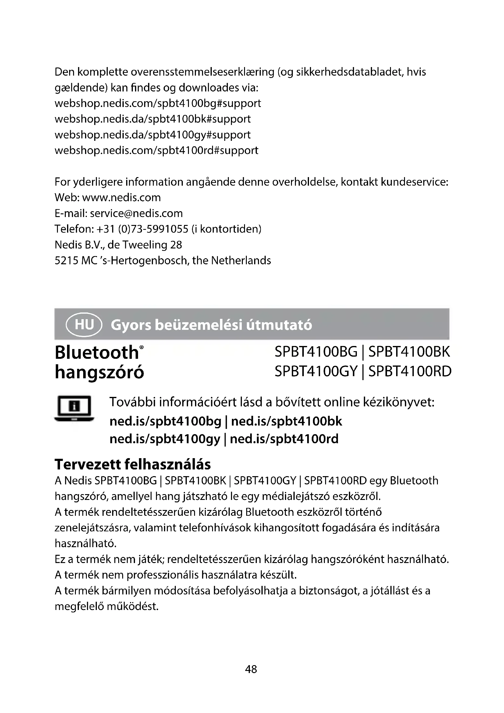 Találja meg az eszköz kézikönyvét ingyenesen SPBT4100BG NEDIS PDF formátumban.