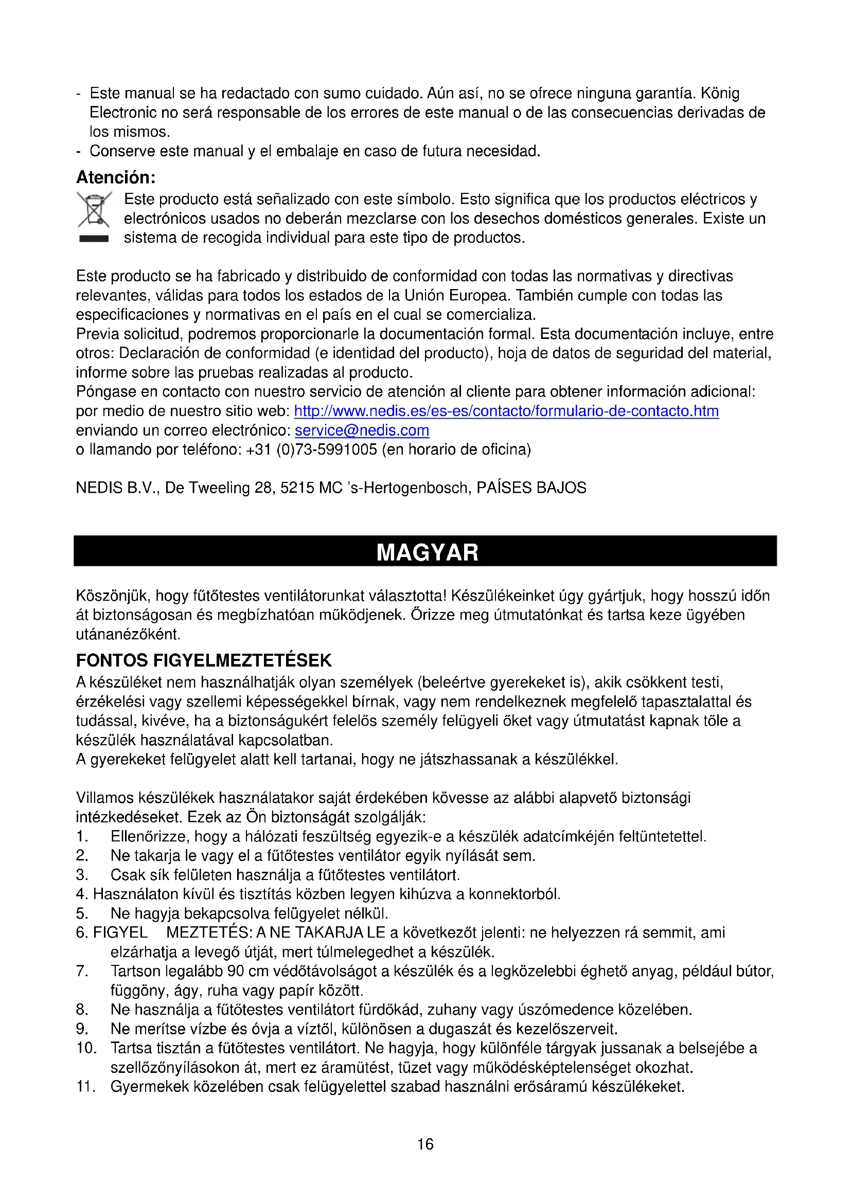 llamando por teléfono: +31 (0)73-5991005 (en horario de oficina) NEDIS B.V., De Tweeling 28, 5215 MC ’s-Hertogenbosch, PAÍSES BAJOS MAGYAR Kerámia fűtőtestes ventilátor Köszönjük, hogy fűtőtestes ventilátorunkat választotta! Készülékeinket úgy gyártjuk, hogy hosszú időn át biztonságosan és megbízhatóan működjenek. Őrizze meg útmutatónkat és tartsa keze ügyében utánanézőként.