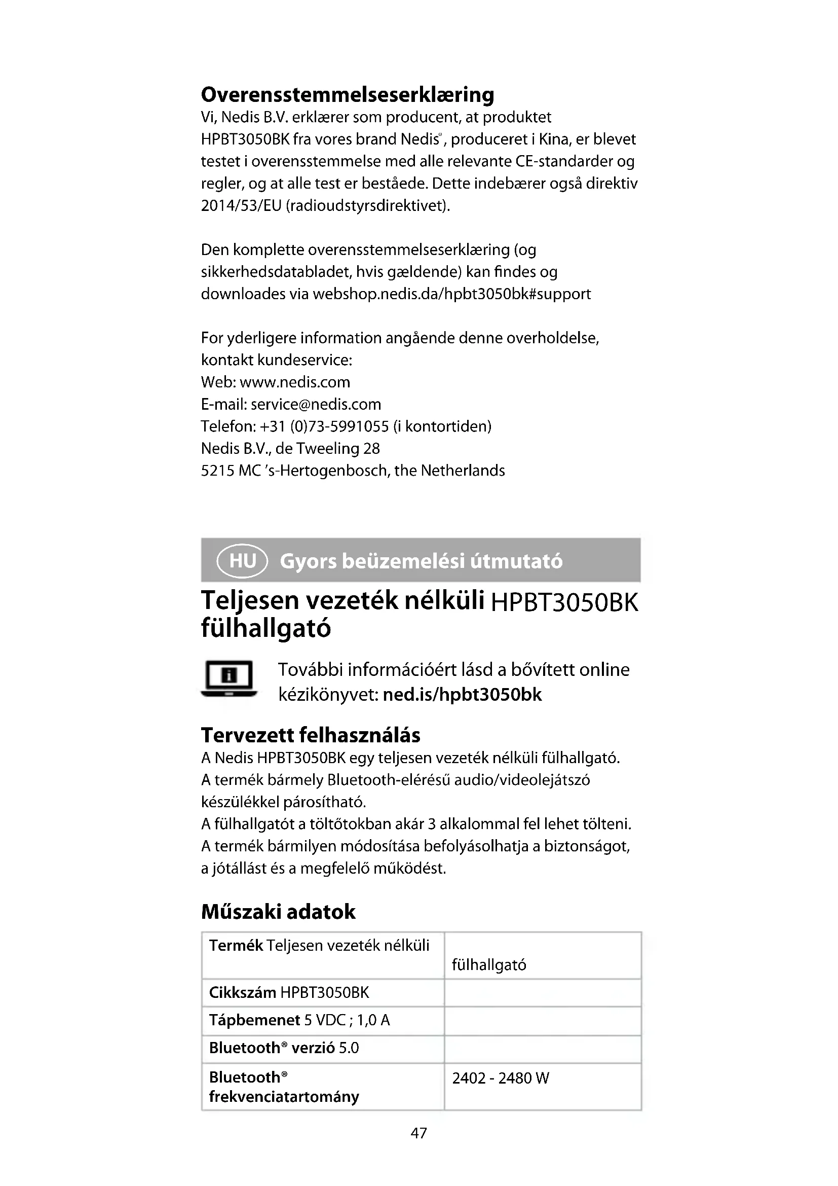 Ezt a funkciót abban az esetben javasolt használni, ha a fülhallgatók általános használati körülmények mellett nem képesek egymáshoz csatlakozni. Megfelelőségi nyilatkozat A gyártó Nedis B.V. nevében kijelentjük, hogy a Nedis márkájú, Kínában gyártott HPBT3050BK terméket az összes vonatkozó CE szabvány és előírás szerint bevizsgáltuk, és a termék minden vizsgálaton sikeresen megfelelt. Ez magában foglalja – nem kizárólagos jelleggel – a rádióberendezésekről szóló 2014/53/EU irányelvet.A teljes megfelelőségi nyilatkozat (és ha van, akkor a biztonsági adatlap) a webshop.nedis.hu/hpbt3050bk#support címen elérhető és letölthetőA megfelelőséggel kapcsolatos további információkért hívja az ügyfélszolgálatot:Web: www.nedis.comE-mail: service@nedis.comTelefon: +31 (0)73-5991055 (munkaidőben)Nedis B.V., de Tweeling 285215 MC ’s-Hertogenbosch, Hollandia