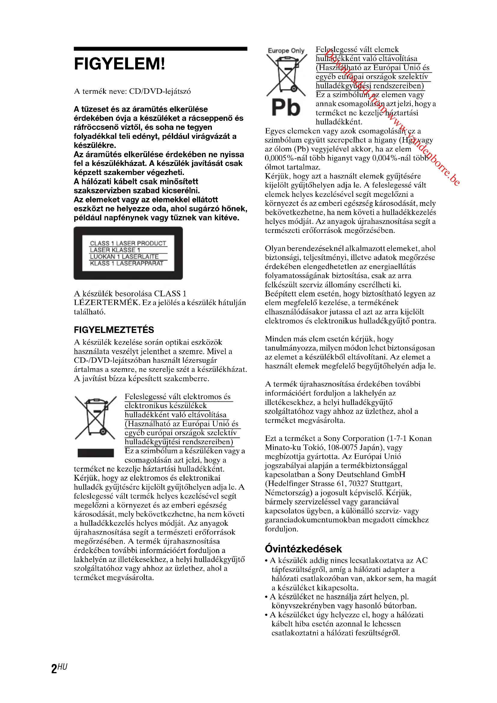 FIGYELEM! A termék neve: CD/DVD-lejátszóA tűzeset és az áramütés elkerülése érdekében óvja a készüléket a rácseppenő és ráfröccsenő víztől, és soha ne tegyen folyadékkal teli edényt, például virágvázát a készülékre.Az áramütés elkerülése érdekében ne nyissa fel a készülékházat. A készülék javítását csak képzett szakember végezheti.A hálózati kábelt csak minősített szakszervizben szabad kicserélni.Az elemeket vagy az elemekkel ellátott eszközt ne helyezze oda, ahol sugárzó hőnek, például napfénynek vagy tűznek van kitéve.A készülék besorolása CLASS 1 LÉZERTERMÉK. Ez a jelölés a készülék hátulján található. FIGYELMEZTETÉS A készülék kezelése során optikai eszközök használata veszélyt jelenthet a szemre. Mivel a CD-/DVD-lejátszóban használt lézersugár ártalmas a szemre, ne szerelje szét a készülékházat.A javítást bízza képesített szakemberre.Feleslegessé vált elektromos és elektronikus készülékek hulladékként való eltávolítása (Használható az Európai Unió és egyéb európai országok szelektív hulladékgyűjtési rendszereiben)Ez a szimbólum a készüléken vagy a csomagolásán azt jelzi, hogy a terméket ne kezelje háztartási hulladékként. Kérjük, hogy az elektromos és elektronikai hulladék gyűjtésére kijelölt gyűjtőhelyen adja le. A feleslegessé vált termék helyes kezelésével segít megelőzni a környezet és az emberi egészség károsodását, mely bekövetkezhetne, ha nem követi a hulladékkezelés helyes módját. Az anyagok újrahasznosítása segít a természeti erőforrások megőrzésében. A termék újrahasznosítása érdekében további információért forduljon a lakhelyén az illetékesekhez, a helyi hulladékgyűjtő szolgáltatóhoz vagy ahhoz az üzlethez, ahol a terméket megvásárolta.Feleslegessé vált elemek hulladékként való eltávolítása (Használható az Európai Unió és egyéb európai országok szelektív hulladékgyűjtési rendszereiben)Ez a szimbólum az elemen vagy annak csomagolásán azt jelzi, hogy a terméket ne kezelje háztartási hulladékként.Egyes elemeken vagy azok csomagolásán ez a szimbólum együtt szerepelhet a higany (Hg) vagy az ólom (Pb) vegyjelével akkor, ha az elem 0,0005%-nál több higanyt vagy 0,004%-nál több ólmot tartalmaz.Kérjük, hogy azt a használt elemek gyűjtésére kijelölt gyűjtőhelyen adja le. A feleslegessé vált elemek helyes kezelésével segít megelőzni a környezet és az emberi egészség károsodását, mely bekövetkezhetne, ha nem követi a hulladékkezelés helyes módját. Az anyagok újrahasznosítása segít a természeti erőforrások megőrzésében.Olyan berendezéseknél alkalmazott elemeket, ahol biztonsági, teljesítményi, illetve adatok megőrzése érdekében elengedhetetlen az energiaellátás folyamatosságának biztosítása, csak az arra felkészült szerviz állomány cserélheti ki.Beépített elem esetén, hogy biztosítható legyen az elem megfelelő kezelése, a termékének elhasználódásakor jutassa el azt az arra kijelölt elektromos és elektronikus hulladékgyűjtő pontra.Minden más elem esetén kérjük, hogy tanulmányozza, milyen módon lehet biztonságosan az elemet a készülékből eltávolítani. Az elemet a használt elemek megfelelő begyűjtőhelyén adja le.A termék újrahasznosítása érdekében további információért forduljon a lakhelyén az illetékesekhez, a helyi hulladékgyűjtő szolgáltatóhoz vagy ahhoz az üzlethez, ahol a terméket megvásárolta.Ezt a terméket a Sony Corporation (1-7-1 Konan Minato-ku Tokió, 108-0075 Japán), vagy megbízottja gyártotta. Az Európai Unió jogszabályai alapján a termékbiztonsággal kapcsolatban a Sony Deutschland GmbH (Hedelfinger Strasse 61, 70327 Stuttgart, Németország) a jogosult képviselő. Kérjük, bármely szervizeléssel vagy garanciával kapcsolatos ügyben, a különálló szerviz- vagy garanciadokumentumokban megadott címekhez forduljon. Óvintézkedések