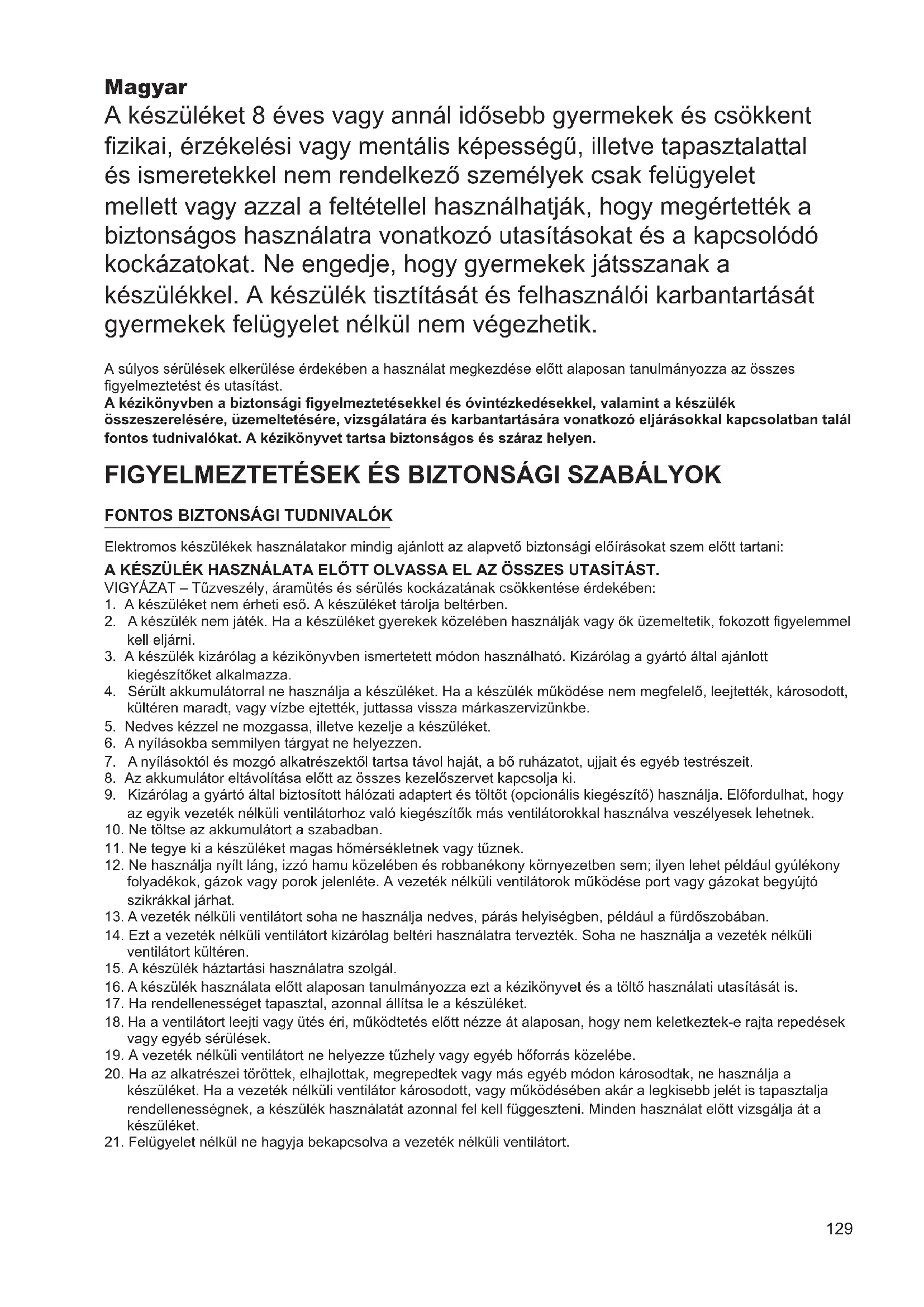21. Felügyelet nélkül ne hagyja bekapcsolva a vezeték nélküli ventilátort.130