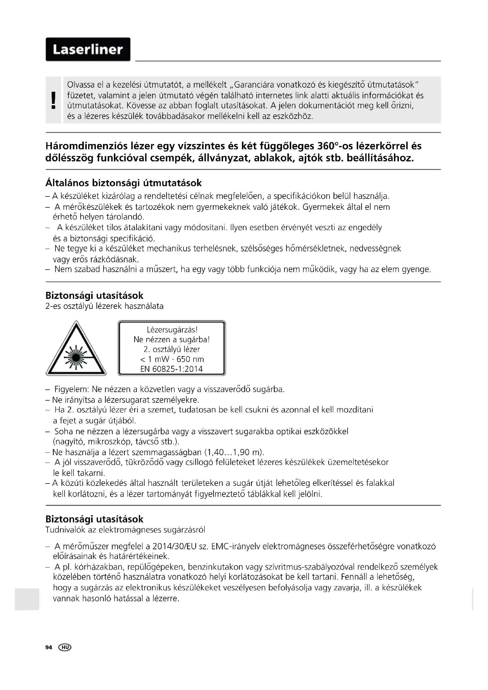 < 1 mW · 650 nm EN 60825-1:2014 Biztonsági utasítások 2-es osztályú lézerek használata Általános biztonsági útmutatások m J°RYÂK°JDSJHY¨Q¹K@F@QDMCDKSDS°RHB°KM@JLDFEDKDKŧDM@RODBHÖJ¨BH¹JNMADKÂKG@RYM¨KI@ m L°QŧJ°RYÂK°JDJ°RS@QSNY°JNJMDLFXDQLDJDJMDJU@K¹I¨S°JNJ&XDQLDJDJ¨KS@KDKMDL °QGDSŧGDKXDMS¨QNK@MC¹ – A készüléket tilos átalakítani vagy módosítani. Ilyen esetben érvényét veszti az engedély