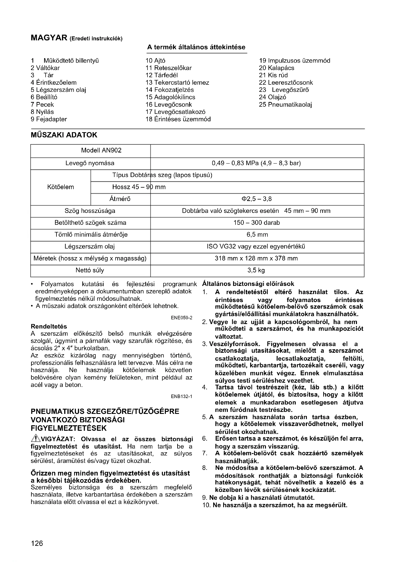 - A műszaki adatok országonként eltérőek lehetnek. ENE059-2 Rendeltetés A szerszám előkészítő belső munkák elvégzésére szolgál, úgymint a párnafák vagy szarufák rögzítése, és ácsolás 2″ x 4″ burkolatban. Az eszköz kizárólag nagy mennyiségben történő, professzionális felhasználásra lett tervezve. Más célra ne használja. Ne használja kötőelemek közvetlen belövésére olyan kemény felületeken, mint például az acél vagy a beton. ENB132-1 PNEUMATIKUS SZEGEZŐRE/TŰZŐGÉPRE
