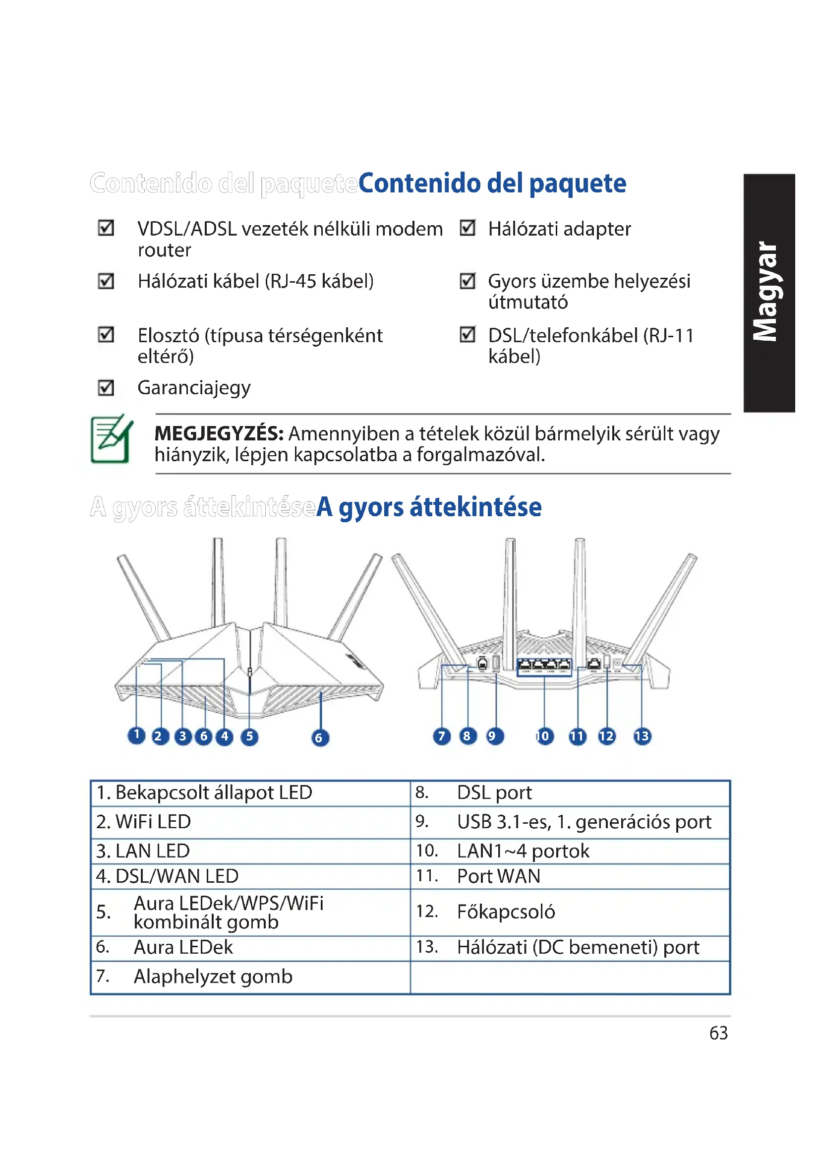 / Aura WiFi / WPS63 Magyar A gyors áttekintéseA gyors áttekintése MEGJEGYZÉS: Amennyiben a tételek közül bármelyik sérült vagy hiányzik, lépjen kapcsolatba a forgalmazóval. Contenido del paqueteContenido del paquete VDSL/ADSL vezeték nélküli modem router Hálózati adapter Hálózati kábel (RJ-45 kábel) Gyors üzembe helyezési útmutató Elosztó (típusa térségenként eltérő) DSL/telefonkábel (RJ-11 kábel) Garanciajegy