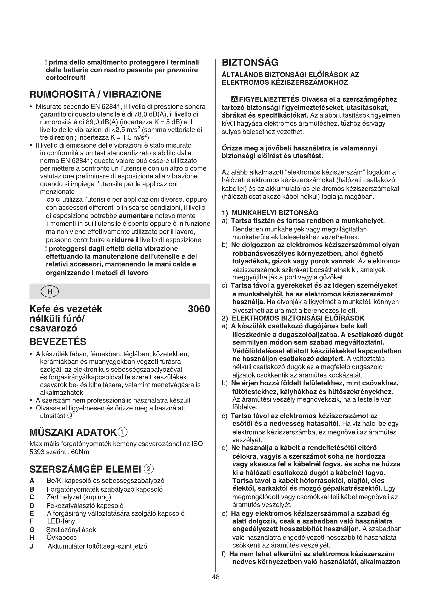 a) A készülék csatlakozó dugójának bele kell illeszkednie a dugaszolóaljzatba. A csatlakozó dugót semmilyen módon sem szabad megváltoztatni. Védőföldeléssel ellátott készülékekkel kapcsolatban ne használjon csatlakozó adaptert. A változtatás nélküli csatlakozó dugók és a megfelelő dugaszoló aljzatok csökkentik az áramütés kockázatát. b) Ne érjen hozzá földelt felületekhez, mint csövekhez, fűtőtestekhez, kályhákhoz és hűtőszekrényekhez. Az áramütési veszély megnövekszik, ha a teste le van földelve. c) Tartsa távol az elektromos kéziszerszámot az esőtől és a nedvesség hatásaitól. Ha víz hatol be egy elektromos kéziszerszámba, ez megnöveli az áramütés veszélyét. d) Ne használja a kábelt a rendeltetésétől eltérő célokra, vagyis a szerszámot soha ne hordozza vagy akassza fel a kábelnél fogva, és soha ne húzza ki a hálózati csatlakozó dugót a kábelnél fogva. Tartsa távol a kábelt hőforrásoktól, olajtól, éles élektől, sarkaktól és mozgó gépalkatrészektől. Egy megrongálódott vagy csomókkal teli kábel megnöveli az áramütés veszélyét. e) Ha egy elektromos kéziszerszámmal a szabad ég alatt dolgozik, csak a szabadban való használatra engedélyezett hosszabbítót használjon. A szabadban való használatra engedélyezett hosszabbító használata csökkenti az áramütés veszélyét. f) Ha nem lehet elkerülni az elektromos kéziszerszám nedves környezetben való használatát, alkalmazzon ! prima dello smaltimento proteggere i terminali delle batterie con nastro pesante per prevenire cortocircuiti RUMOROSITÀ / VIBRAZIONE