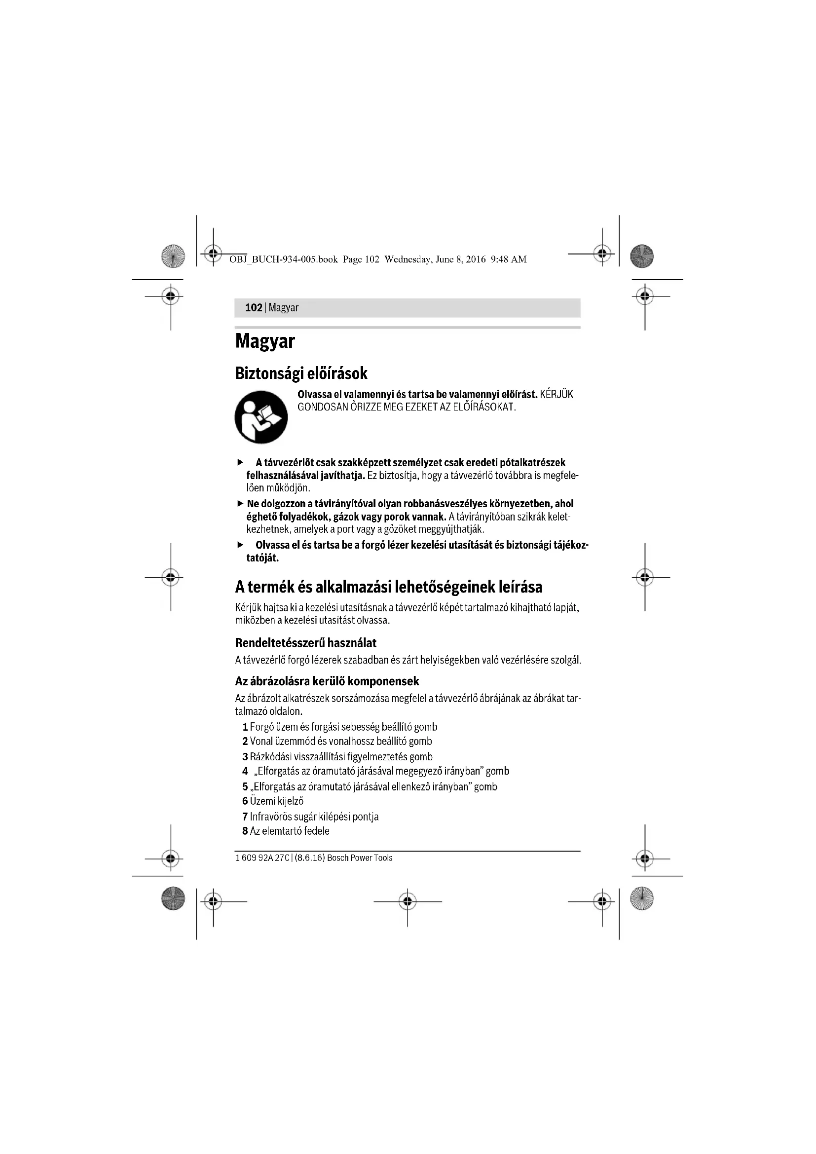 Len čo sa rotačný laser naniveluje (indikácia nivelácie na rotačnom laseri svieti trvalo zeleno), spustí sa v tom druhu prevádzky, ktorý bol uložený do pamäte. Prekontroluj- te výšku laserového lúča na nejakom referenčnom bode a v prípade potreby výšku skorigujte. Príklad postupu práce Otáčanie roviny rotácie pri vertikálnej polohe (pozri obrázok B) Keď chcete nastaviť zvislú laserovú čiaru alebo rovinu rotácie na nejakom referenč- nom bode na stene, postavte rotačný laser do vertikálnej polohy a vyrovnajte laserovú čiaru resp. rovinu rotácie hrubo na referenčný bod. Na presné nastavenie na referenč- ný bod stlačte tlačidlo 4 (otáčanie doprava) alebo tlačidlo 5 (otáčanie doľava). Údržba a servis Údržba a čistenie Udržiavajte diaľkové ovládanie vždy v čistote. Neponárajte diaľkové ovládanie do vody ani do iných kvapalín. Znečistenia utrite vlhkou mäkkou handričkou. Nepoužívajte žiadne čistiace prostried- ky ani rozpúšťadlá. Ak by diaľkové ovládanie napriek starostlivej výrobe a kontrole predsa len prestalo niekedy fungovať, treba dať opravu vykonať niektorej autorizovanej servisnej opra- vovni ručného elektrického náradia Bosch. Diaľkové ovládanie sami nikdy neotváraj- te. Pri všetkých dopytoch a objednávkach náhradných súčiastok uvádzajte bezpodmie- nečne 10-miestne vecné číslo uvedené na typovom štítku diaľkového ovládania. OBJ_BUCH-934-005.book Page 100 Wednesday, June 8, 2016 9:48 AMSlovensky | 101 Bosch Power Tools 1 609 92A 27C | (8.6.16) Servisné stredisko a poradenstvo pri používaní Servisné stredisko Vám odpovie na otázky týkajúce sa opravy a údržby Vášho produk- tu ako aj náhradných súčiastok. Rozložené obrázky a informácie k náhradným súčias- tkam nájdete aj na web-stránke: www.bosch-pt.com Tím poradcov Bosch Vám s radosťou poskytne pomoc pri otázkach týkajúcich sa na- šich produktov a ich príslušenstva. V prípade akýchkoľvek otázok a objednávok náhradných súčiastok uvádzajte bezpod- mienečne 10-miestne vecné číslo uvedené na typovom štítku výrobku. Slovakia Na www.bosch-pt.sk si môžete objednať opravu vášho stroja alebo náhradné diely online. Tel.: (02) 48 703 800 Fax: (02) 48 703 801 E-Mail: servis.naradia@sk.bosch.com www.bosch.sk Likvidácia Diaľkové ovládanie, príslušenstvo a obal treba dať na recykláciu šetriacu životné pro- stredie. Neodhadzujte diaľkové ovládania a akumulátory/batérie do komunálneho odpadu! Len pre krajiny EÚ: Podľa Európskej smernice 2012/19/EÚ sa musia nepoužiteľné ruč- né elektrické spotrebiče a podľa európskej smernice 2006/66/ES sa musia poškodené alebo opotrebované akumulátory/batérie zbierať separovane a treba ich dávať na recykláciu zodpovedajúcu ochrane životného prostredia. Zmeny vyhradené. OBJ_BUCH-934-005.book Page 101 Wednesday, June 8, 2016 9:48 AM102 | Magyar 1 609 92A 27C | (8.6.16) Bosch Power Tools Magyar Biztonsági előírások Olvassa el valamennyi és tartsa be valamennyi előírást. KÉRJÜK GONDOSAN ŐRIZZE MEG EZEKET AZ ELŐÍRÁSOKAT. A távvezérlőt csak szakképzett személyzet csak eredeti pótalkatrészek felhasználásával javíthatja. Ez biztosítja, hogy a távvezérlő továbbra is megfele- lően működjön. Ne dolgozzon a távirányítóval olyan robbanásveszélyes környezetben, ahol éghető folyadékok, gázok vagy porok vannak. A távirányítóban szikrák kelet- kezhetnek, amelyek a port vagy a gőzöket meggyújthatják. Olvassa el és tartsa be a forgó lézer kezelési utasítását és biztonsági tájékoz- tatóját. A termék és alkalmazási lehetőségeinek leírása Kérjük hajtsa ki a kezelési utasításnak a távvezérlő képét tartalmazó kihajtható lapját, miközben a kezelési utasítást olvassa. Rendeltetésszerű használat A távvezérlő forgó lézerek szabadban és zárt helyiségekben való vezérlésére szolgál. Az ábrázolásra kerülő komponensek Az ábrázolt alkatrészek sorszámozása megfelel a távvezérlő ábrájának az ábrákat tar- talmazó oldalon. 1 Forgó üzem és forgási sebesség beállító gomb 2 Vonal üzemmód és vonalhossz beállító gomb 3 Rázkódási visszaállítási figyelmeztetés gomb 4 „Elforgatás az óramutató járásával megegyező irányban” gomb 5 „Elforgatás az óramutató járásával ellenkező irányban” gomb 6 Üzemi kijelző 7 Infravörös sugár kilépési pontja 8 Az elemtartó fedele OBJ_BUCH-934-005.book Page 102 Wednesday, June 8, 2016 9:48 AMMagyar | 103 Bosch Power Tools 1 609 92A 27C | (8.6.16) 9 Az elemtartó fiók fedelének reteszelése 10 Gyártási szám A képeken látható vagy a szövegben leírt tartozékok részben nem tartoznak a standard szál- lítmányhoz. Műszaki adatok Összeszerelés Elem behelyezése/kicserélése A távvezérlő üzemeltetéséhez alkáli-mangán-elemek használatát javasoljuk. Az elemtartó 8 fedelének kinyitásához tolja el a 9 reteszelést a nyíl által jelzett irány- ban és vegye le a fedelet. Tegye be a készülékkel szállított elemet. Ügyeljen eközben az elemtartóban található ábrának megfelelő helyes polarításra. Vegye ki az elemet a távvezérlőből, ha hosszabb ideig nem használja. Az elem egy hosszabb tárolás során korrodálhat, vagy magától kimerülhet. Üzemeltetés Üzembevétel Óvja meg a távvezérlőt a nedvességtől és a közvetlen napsugárzás behatásá- tól. Ne tegye ki a távvezérlőt extrém hőmérsékleteknek vagy hőmérsékletinga- dozásoknak. Például ne hagyja hosszabb ideig a készüléket egy autóban. Nagyobb Távirányító RC 1 Cikkszám 3 601 K69 900 Munkaterület