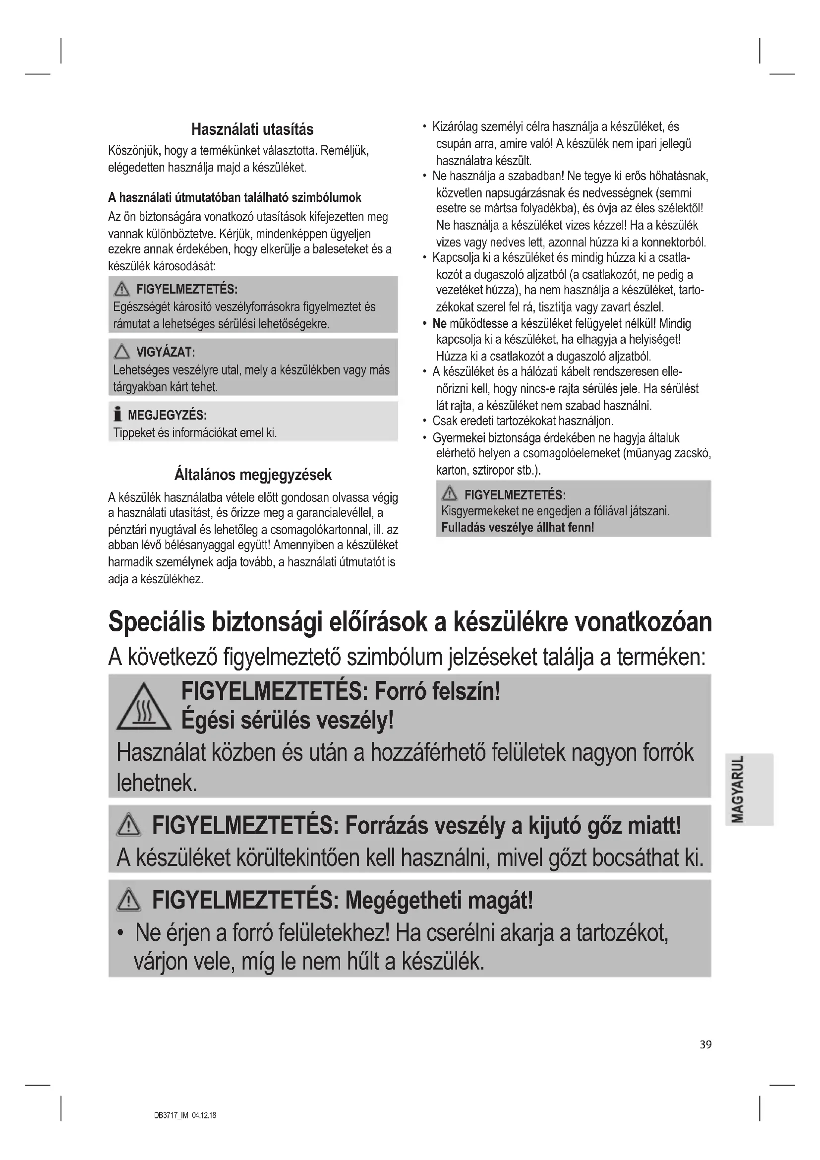 - Gyermekei biztonsága érdekében ne hagyja általuk elérhető helyen a csomagolóelemeket (műanyag zacskó, karton, sztiropor stb.). FIGYELMEZTETÉS: Kisgyermekeket ne engedjen a fóliával játszani. Fulladás veszélye állhat fenn! Speciális biztonsági előírások a készülékre vonatkozóan A következő gyelmeztető szimbólum jelzéseket találja a terméken: FIGYELMEZTETÉS: Forró felszín! Égési sérülés veszély! Használat közben és után a hozzáférhető felületek nagyon forrók lehetnek. FIGYELMEZTETÉS: Forrázás veszély a kijutó gőz miatt! A készüléket körültekintően kell használni, mivel gőzt bocsáthat ki. FIGYELMEZTETÉS: Megégetheti magát!