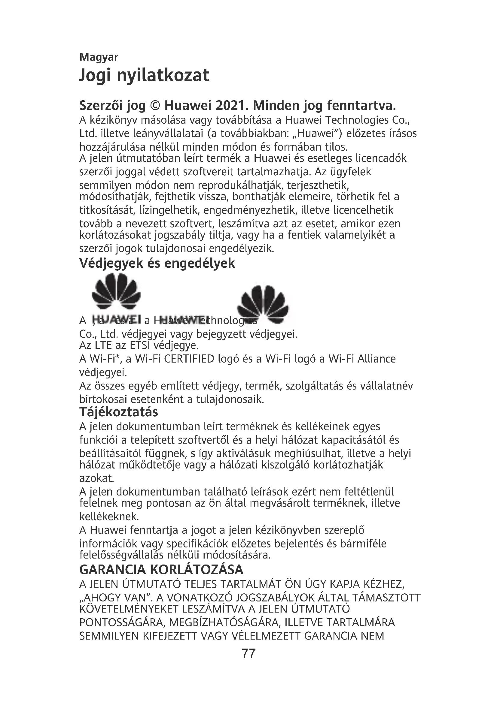 , a Wi-Fi CERTIFIED logó és a Wi-Fi logó a Wi-Fi Alliance védjegyei. Az összes egyéb említett védjegy, termék, szolgáltatás és vállalatnév birtokosai esetenként a tulajdonosaik. Tájékoztatás A jelen dokumentumban leírt terméknek és kellékeinek egyes funkciói a telepített szoftvertől és a helyi hálózat kapacitásától és beállításaitól függnek, s így aktiválásuk meghiúsulhat, illetve a helyi hálózat működtetője vagy a hálózati kiszolgáló korlátozhatják azokat. A jelen dokumentumban található leírások ezért nem feltétlenül felelnek meg pontosan az ön által megvásárolt terméknek, illetve kellékeknek. A Huawei fenntartja a jogot a jelen kézikönyvben szereplő információk vagy specikációk előzetes bejelentés és bármiféle felelősségvállalás nélküli módosítására.