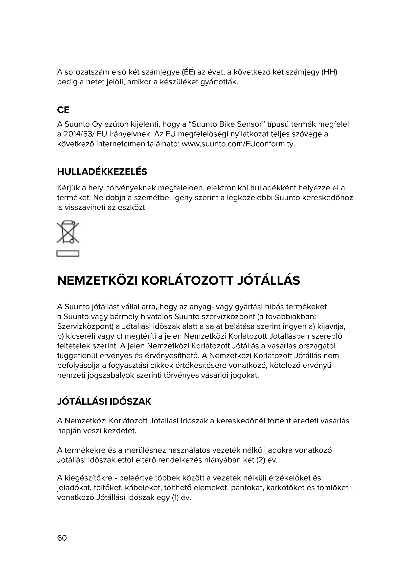 Kérjük a helyi törvényeknek megfelelően, elektronikai hulladékként helyezze el a terméket. Ne dobja a szemétbe. Igény szerint a legközelebbi Suunto kereskedőhöz is visszaviheti az eszközt. NEMZETKÖZI KORLÁTOZOTT JÓTÁLLÁS A Suunto jótállást vállal arra, hogy az anyag- vagy gyártási hibás termékeket a Suunto vagy bármely hivatalos Suunto szervizközpont (a továbbiakban: Szervizközpont) a Jótállási időszak alatt a saját belátása szerint ingyen a) kijavítja, b) kicseréli vagy c) megtéríti a jelen Nemzetközi Korlátozott Jótállásban szereplő feltételek szerint. A jelen Nemzetközi Korlátozott Jótállás a vásárlás országától függetlenül érvényes és érvényesíthető. A Nemzetközi Korlátozott Jótállás nem befolyásolja a fogyasztási cikkek értékesítésére vonatkozó, kötelező érvényű nemzeti jogszabályok szerinti törvényes vásárlói jogokat.