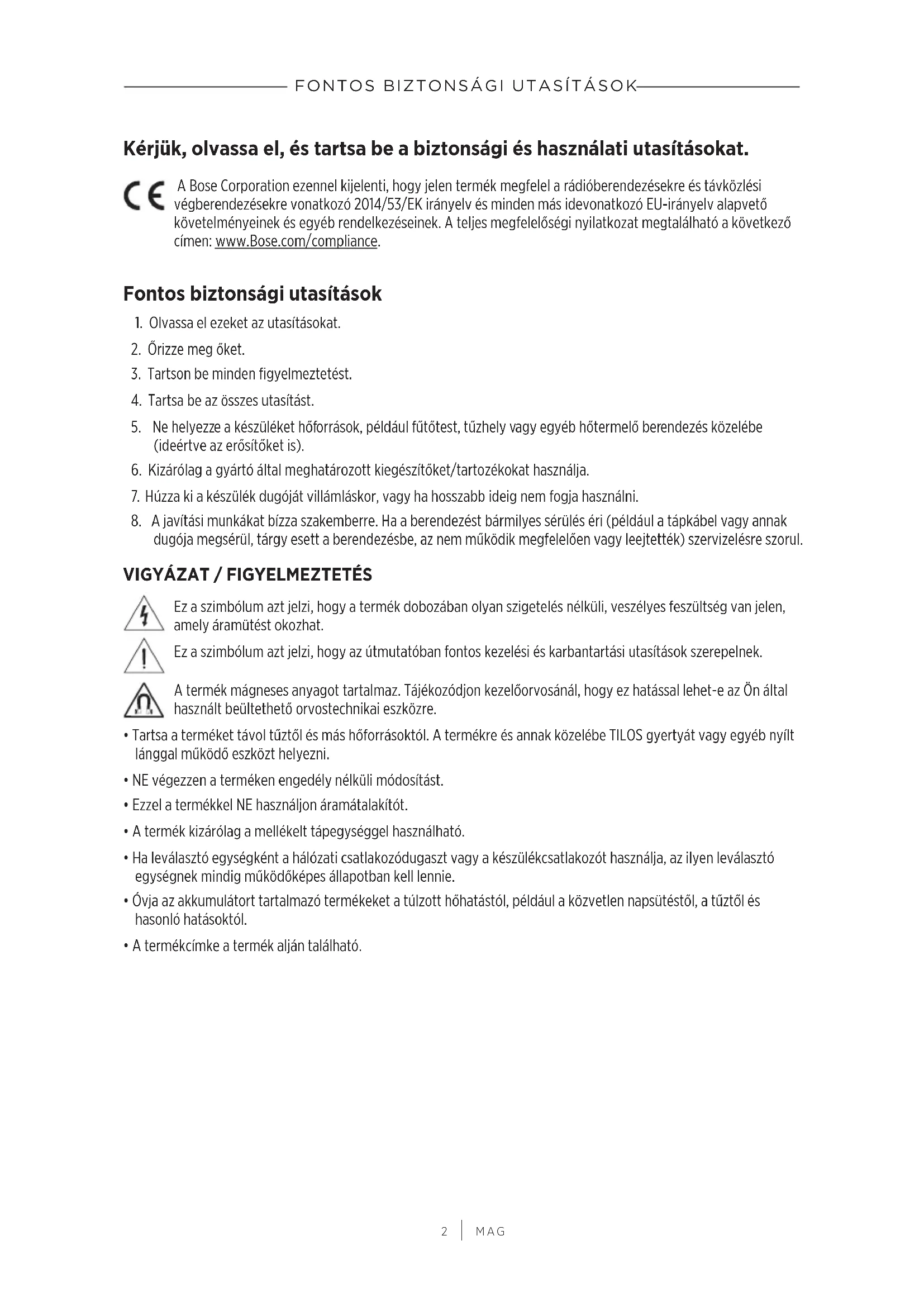 MAG Kérjük, olvassa el, és tartsa be a biztonsági és használati utasításokat. A Bose Corporation ezennel kijelenti, hogy jelen termék megfelel a rádióberendezésekre és távközlési végberendezésekre vonatkozó 2014/53/EK irányelv és minden más idevonatkozó EU-irányelv alapvető követelményeinek és egyéb rendelkezéseinek. A teljes megfelelőségi nyilatkozat megtalálható a következő címen: www.Bose.com/compliance. Fontos biztonsági utasítások