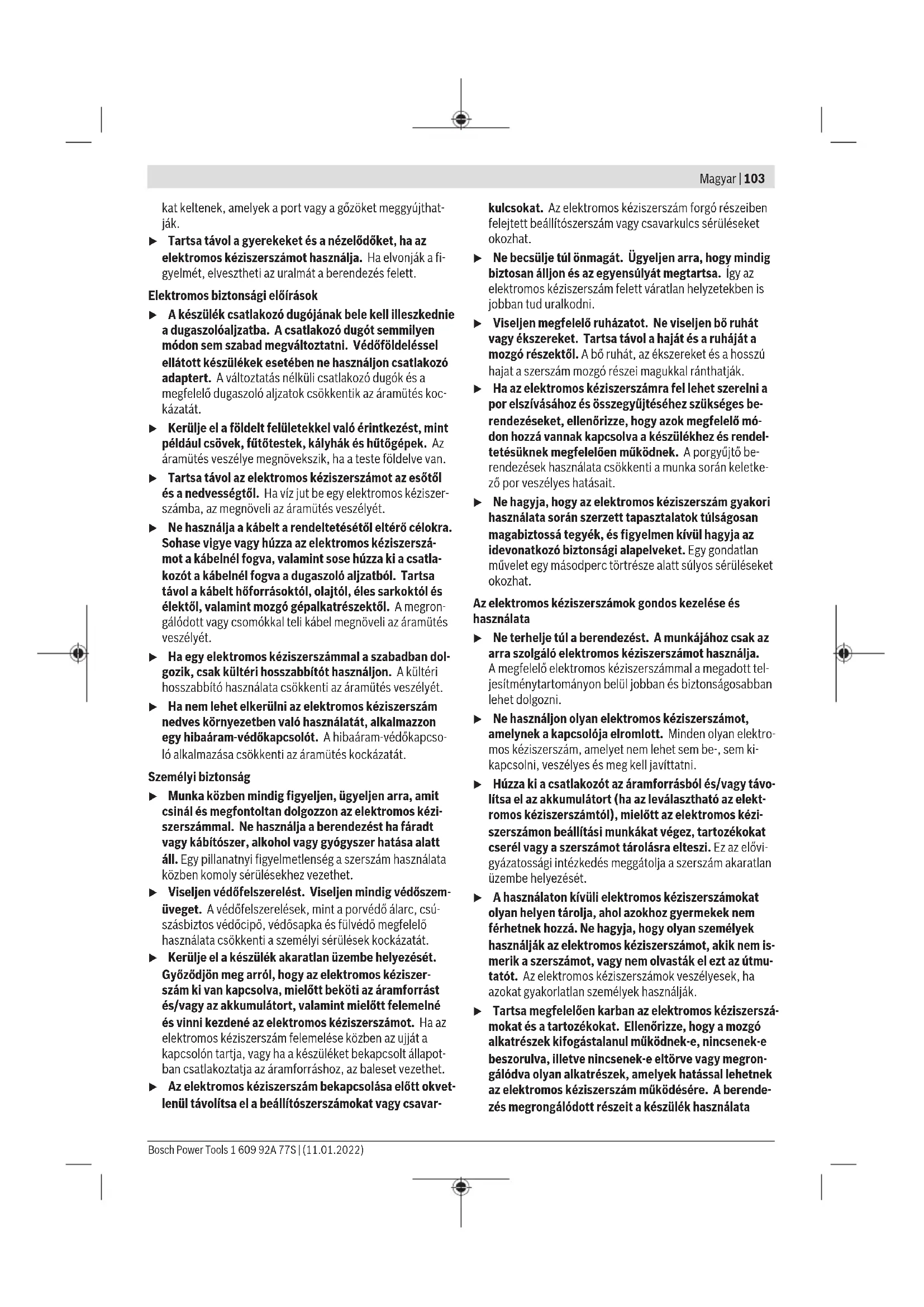 Az ezen utasításokban megadott rezgésszint és zajkibocsátá- si érték egy szabványban rögzített mérési módszerrel került meghatározásra és az elektromos kéziszerszámok egymással való összehasonlítására alkalmazható. Ez az érték a rezgés- és zajkibocsátás ideiglenes becslésére is alkalmas. A megadott rezgésszint és zajkibocsátási érték az elektro- mos kéziszerszám fő alkalmazásaira vonatkozik. Ha az elekt- romos kéziszerszámot más alkalmazásokra, eltérő betétszer- számokkal vagy nem kielégítő karbantartás mellett használ- ják, a rezgésszint és a zajkibocsátási érték a fenti értékektől eltérhet. Ez az egész munkaidőre vonatkozó rezgés- és zajki- bocsátást lényegesen megnövelheti. A rezgés- és zajkibocsátás pontos megbecsüléséhez figye- lembe kell venni azokat az időszakokat is, amikor a készülék kikapcsolt állapotban van, vagy amikor be van ugyan kap- csolva, de nem kerül ténylegesen használatra. Ez az egész munkaidőre vonatkozó rezgés- és zajkibocsátást lényegesen csökkentheti. Hozzon kiegészítő biztonsági intézkedéseket a kezelőnek a rezgések hatása elleni védelmére, például: Az elektromos ké- ziszerszám és a betétszerszámok karbantartása, a kezek me- legen tartása, a munkamenetek megszervezése. Összeszerelés u Az elektromos kéziszerszámon végzendő bármely munka megkezdése előtt húzza ki a csatlakozó dugót a dugaszolóaljzatból. Pótfogantyú u Az elektromos kéziszerszámot csak az arra felszerelt (12)pótfogantyúval együtt szabad használni. u Ügyeljen arra, hogy a pótfogantyú mindig szorosan meg legyen húzva. Ellenkező esetben munka közben el- vesztheti az uralmát az elektromos kéziszerszám felett. A pótfogantyú elforgatása (lásd a Aábrát) A (12) pótfogantyút a biztonságos és fáradságmentes mun- kához bármilyen megfelelő helyzetbe lehet forgatni. – Forgassa el a (12)pótfogantyú alsó markolatát az óramu- tató járásával ellenkező irányba és forgassa el a (12)pótfogantyút a kívánt helyzetbe. Forgassa el ismét a (12)pótfogantyú alsó markolatát az óramutató járásával megegyező irányba és ezzel szorítsa meg azt. Bosch Power Tools 1 609 92A 77S | (11.01.2022)106 | Magyar Ügyeljen arra, hogy a pótfogantyú feszítőszalag beillesz- kedjen a házon erre a célra előirányzott horonyba. A fúrótokmány és a szerszámok kijelölése Az ütvefúráshoz és a véséshez SDS-plus szerszámokra van szükség, amelyeket az SDS-plus fúrótokmányba kell behe- lyezni. Fában, fémekben, kerámikus anyagokban és műanyagban ütés nélküli fúrásra, valamint csavarozásra SDS-plus nélküli szerszámokat (például hengeres szárú fúrót) kell használni. Ezekhez a szerszámokhoz egy gyorsbefogó vagy egy fogas- koszorús fúrótokmányt kell használni. A fúrótokmány kicserélése A gyorsbefogó fúrótokmány / a fogaskoszorús fúrótokmány beszerelése (lásdaBábrát) – Csavarja be a(17)SDS-plus-befogószárt egy(1)gyorsbefogó fúrótokmányba /(16)fogaskoszorús fúrótokmányba. Biztosítsa a(15)biztosítócsavarral a(1)gyorsbefogó fúrótokmányt /(16)fogaskoszorús fú- rótokmányt. Vegye tekintetbe, hogy a biztosító csavar balmenetes. A gyorsbefogó fúrótokmány / fogaskoszorús fúrótokmány behelyezése (lásdaBábrát) – Tisztítsa meg és kissé zsírozza be a(17)SDS plus befogó- szár bedugásra kerülő végét. – Forgatva tolja be a(1)gyorsbefogó fúrótokmányt / (16)fogaskoszorús fúrótokmányt a tokmányszárral a szerszámbefogó egységbe, amíg az magától elreteszelés- re kerül. – A(1)gyorsbefogó fúrótokmány / (16)fogaskoszorús fú- rótokmány meghúzásával ellenőrizze annak reteszelését. A gyorsbefogó fúrótokmány / fogaskoszorús fúrótokmány kivétele – Tolja hátra a(5)reteszelő hüvelyt és vegye ki a(1)gyorsbefogó fúrótokmányt /(16)fogaskoszorús fú- rótokmányt. Szerszámcsere A (4) porvédő sapka üzem közben messzemenően meggátol- ja a fúrás során keletkező por behatolását a szemszámbefo- gó egységbe. A szerszám behelyezésekor ügyeljen arra, hogy ne rongálja meg a (4) porvédő sapkát. u Ha egy porvédő sapka megrongálódott, azt azonnal ki kell cserélni. Azt javasoljuk, hogy a csere végrehajtá- sával bízzon meg egy Vevőszolgálatot. Szerszámcsere (SDS-plus) Az SDS-plus betétszerszám behelyezése (lásd a C ábrát) Az SDS-plus fúrótokmánnyal a betétszerszámot egyszerűen és kényelmesen, minden további szerszám alkalmazása nél- kül ki lehet cserélni. – Tisztítsa meg és kissé zsírozza be a betétszerszám bedu- gásra kerülő végét. – Tegye be forgatva a betétszerszámot a szerszámbefogó egységbe, amíg az magától reteszelésre kerül. – Húzza meg a szerszámot, és ellenőrizze így a megfelelő re- teszelést. Az SDS-plus betétszerszám a rendszer tulajdonságaiból adó- dóan szabadon mozoghat. Ezért üresjáratban a szerszám el- tér a körkörös futástól. Ez nincs befolyással a furat pontossá- gára, mivel a fúró a fúrás során magától központozásra kerül. Az SDS-plus betétszerszám kivétele (lásd a D ábrát) – Tolja hátra a (5) reteszelő hüvelyt és vegye ki a betétszer- számot. Szerszámcsere a gyorsbefogó cseretokmánynál A betétszerszám behelyezése (lásdaEábrát) Figyelem: Az SDS-plus nélkül szerszámokat kalapácsos fú- rásra vagy vésére ne használja! Az SDS-plus és a megfelelő fúrótokmány nélküli szerszámok a kalapácsos fúrás és vésés során megrongálódnak. – Tegye be a (1)gyorsbefogó fúrótokmányt. – Tartsa fogva a (1)gyorsbefogó fúrótokmány (19)hátsó hüvelyét, és forgassa el a (18)első hüvelyt az óramutató járásával ellenkező irányba, amíg be nem lehet tenni a szerszámot a szerszámbefogó egységbe. Tegye be a szer- számot. – Fogja meg szorosan az (1)gyorsbef