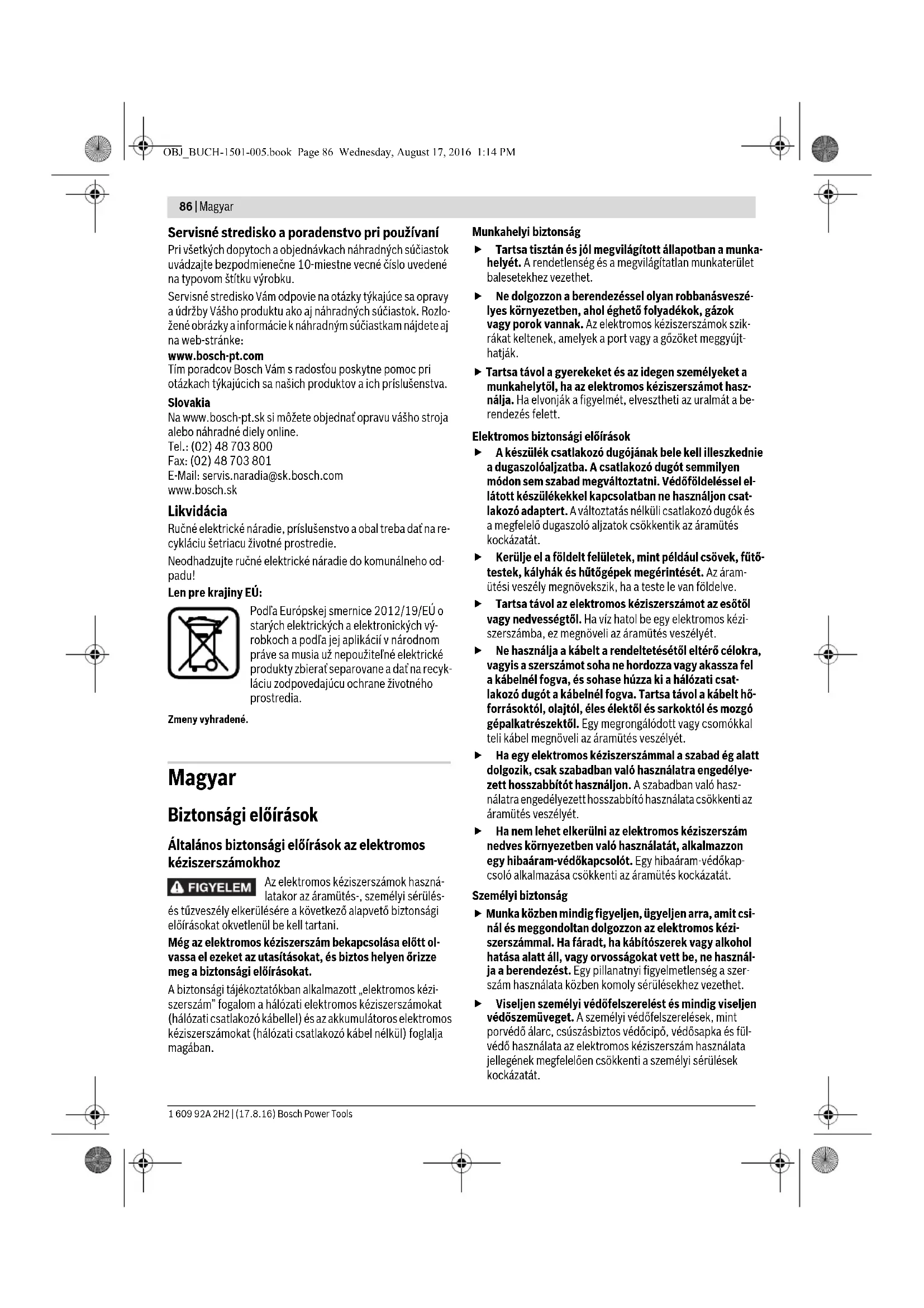 Pred použitím brúsne nástroje vždy skontrolujte. Brús- ny nástroj (brúsny kotúč) musí byť bezchybne namonto- vaný a musí sa dať voľne otáčať. Vykonajte s nástrojom skúšobný chod v trvaní minimálne 1 minúty bez zaťaže- nia s maximálnym počtom voľnobežných obrátok. Ne- používajte žiadne brúsne nástroje, ktorú sú poškodené, neokrúhle alebo vibrujúce. Poškodené brúsne nástroje sa môžu pri práci roztrhnúť a môžu spôsobiť poranenie. Zapínanie/vypínanie Aby ste ušetrili energiu, zapínajte ručné elektrické náradie iba vtedy, ked ho používate. – Ručné elektrické náradie zapnite preklopením vypínača 8 do polohy „I“. – Ručné elektrické náradie vypnite preklopením vypínača 8 do polohy „0“. Pokyny na používanie Na obrábanie obrobkov zo spekaného karbidu používajte silí- ciumkarbidové brúsne kotúče C (príslušenstvo). Chráňte brúsny kotúč pred nárazom, úderom a pred mastnotou. – Obrobok, ktorý hodláte brúsiť, položte na podpierku pre obrobok 11 a jemne ho pritláčajte proti brúsnemu kotúču. Aby ste dosiahli optimálne výsledky práce, jemne pohybuj- te obrobkom sem a tam. Takto sa bude navyše brúsny ko- túč aj rovnomerne opotrebovávať. – Obrobok ochlaďte čas od času vo vode. Údržba a servis Údržba a čistenie Pred každou prácou na ručnom elektrickom náradí vy- tiahnite zástrčku náradia zo zásuvky. Ručné elektrické náradie a jeho vetracie štrbiny udržia- vajte vždy v čistote, aby ste mohli pracovať kvalitne a bezpečne. Ak je potrebná výmena prívodnej šnúry, musí ju vykonať firma Bosch alebo niektoré autorizované servisné stredisko ručné- ho elektrického náradia Bosch, aby sa zabránilo ohrozeniu bezpečnosti používateľa náradia. OBJ_BUCH-1501-005.book Page 85 Wednesday, August 17, 2016 1:14 PM86 | Magyar 1 609 92A 2H2 | (17.8.16) Bosch Power Tools Servisné stredisko a poradenstvo pri používaní Pri všetkých dopytoch a objednávkach náhradných súčiastok uvádzajte bezpodmienečne 10-miestne vecné číslo uvedené na typovom štítku výrobku. Servisné stredisko Vám odpovie na otázky týkajúce sa opravy a údržby Vášho produktu ako aj náhradných súčiastok. Rozlo- žené obrázky a informácie k náhradným súčiastkam nájdete aj na web-stránke: www.bosch-pt.com Tím poradcov Bosch Vám s radosťou poskytne pomoc pri otázkach týkajúcich sa našich produktov a ich príslušenstva. Slovakia Na www.bosch-pt.sk si môžete objednať opravu vášho stroja alebo náhradné diely online. Tel.: (02) 48 703 800 Fax: (02) 48 703 801 E-Mail: servis.naradia@sk.bosch.com www.bosch.sk Likvidácia Ručné elektrické náradie, príslušenstvo a obal treba dať na re- cykláciu šetriacu životné prostredie. Neodhadzujte ručné elektrické náradie do komunálneho od- padu! Len pre krajiny EÚ: Podľa Európskej smernice 2012/19/EÚ o starých elektrických a elektronických vý- robkoch a podľa jej aplikácií v národnom práve sa musia už nepoužiteľné elektrické produkty zbierať separovane a dať na recyk- láciu zodpovedajúcu ochrane životného prostredia. Zmeny vyhradené. Magyar Biztonsági előírások Általános biztonsági előírások az elektromos kéziszerszámokhoz Az elektromos kéziszerszámok haszná- latakor az áramütés-, személyi sérülés- és tűzveszély elkerülésére a következő alapvető biztonsági előírásokat okvetlenül be kell tartani. Még az elektromos kéziszerszám bekapcsolása előtt ol- vassa el ezeket az utasításokat, és biztos helyen őrizze meg a biztonsági előírásokat. A biztonsági tájékoztatókban alkalmazott „elektromos kézi- szerszám” fogalom a hálózati elektromos kéziszerszámokat (hálózati csatlakozó kábellel) és az akkumulátoros elektromos kéziszerszámokat (hálózati csatlakozó kábel nélkül) foglalja magában. Munkahelyi biztonság Tartsa tisztán és jól megvilágított állapotban a munka- helyét. A rendetlenség és a megvilágítatlan munkaterület balesetekhez vezethet. Ne dolgozzon a berendezéssel olyan robbanásveszé- lyes környezetben, ahol éghető folyadékok, gázok vagy porok vannak. Az elektromos kéziszerszámok szik- rákat keltenek, amelyek a port vagy a gőzöket meggyújt- hatják. Tartsa távol a gyerekeket és az idegen személyeket a munkahelytől, ha az elektromos kéziszerszámot hasz- nálja. Ha elvonják a figyelmét, elvesztheti az uralmát a be- rendezés felett. Elektromos biztonsági előírások A készülék csatlakozó dugójának bele kell illeszkednie a dugaszolóaljzatba. A csatlakozó dugót semmilyen módon sem szabad megváltoztatni. Védőföldeléssel el- látott készülékekkel kapcsolatban ne használjon csat- lakozó adaptert. A változtatás nélküli csatlakozó dugók és a megfelelő dugaszoló aljzatok csökkentik az áramütés kockázatát. Kerülje el a földelt felületek, mint például csövek, fűtő- testek, kályhák és hűtőgépek megérintését. Az áram- ütési veszély megnövekszik, ha a teste le van földelve. Tartsa távol az elektromos kéziszerszámot az esőtől vagy nedvességtől. Ha víz hatol be egy elektromos kézi- szerszámba, ez megnöveli az áramütés veszélyét. Ne használja a kábelt a rendeltetésétől eltérő célokra, vagyis a szerszámot soha ne hordozza vagy akassza fel a kábelnél fogva, és sohase húzza ki a hálózati csat- lakozó dugót a kábelnél fogva. Tartsa távol a kábelt hő- forrásoktól, olajtól, éles élektől és sarkoktól és mozgó gépalkatrészektől. Egy megrongálódott vagy csomókkal teli kábel megnöveli az áramütés veszélyét. Ha egy elektromos kéziszerszámmal a szabad ég alatt dolgozik, csak szabadban való használatra engedélye- zett hosszabbítót használjon. A szabadban való hasz- nálatra engedélyezett hosszabbító használata csökkenti az áramütés veszélyét. Ha nem l