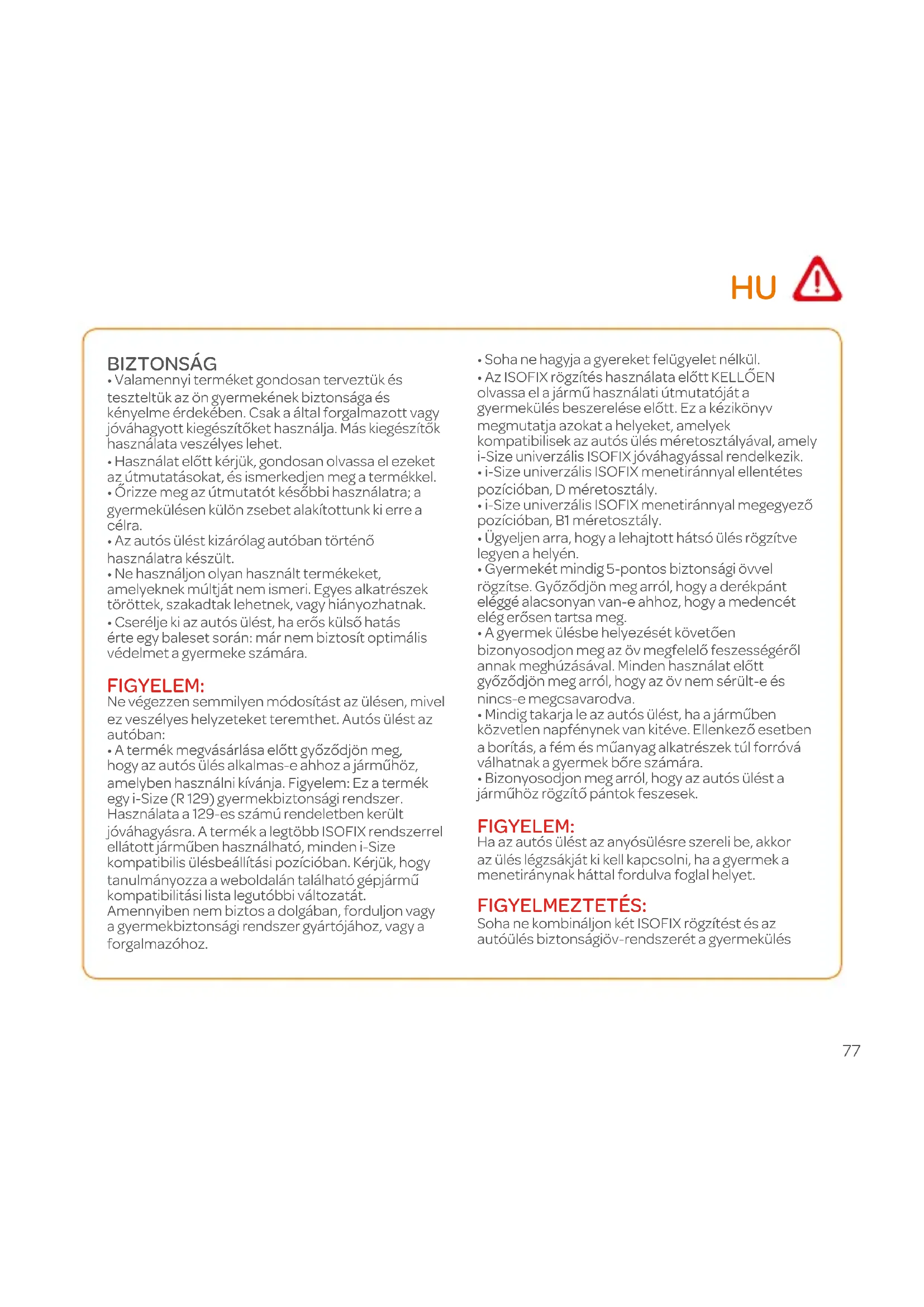 - A termék megvásárlása előtt győződjön meg, hogy az autós ülés alkalmas-e ahhoz a járműhöz, amelyben használni kívánja. Figyelem: Ez a termék egy i-Size (R 129) gyermekbiztonsági rendszer. Használata a 129-es számú rendeletben került jóváhagyásra. A termék a legtöbb ISOFIX rendszerrel ellátott járműben használható, minden i-Size kompatibilis ülésbeállítási pozícióban. Kérjük, hogy tanulmányozza a weboldalán található gépjármű kompatibilitási lista legutóbbi változatát. Amennyiben nem biztos a dolgában, forduljon vagy a gyermekbiztonsági rendszer gyártójához, vagy a forgalmazóhoz.