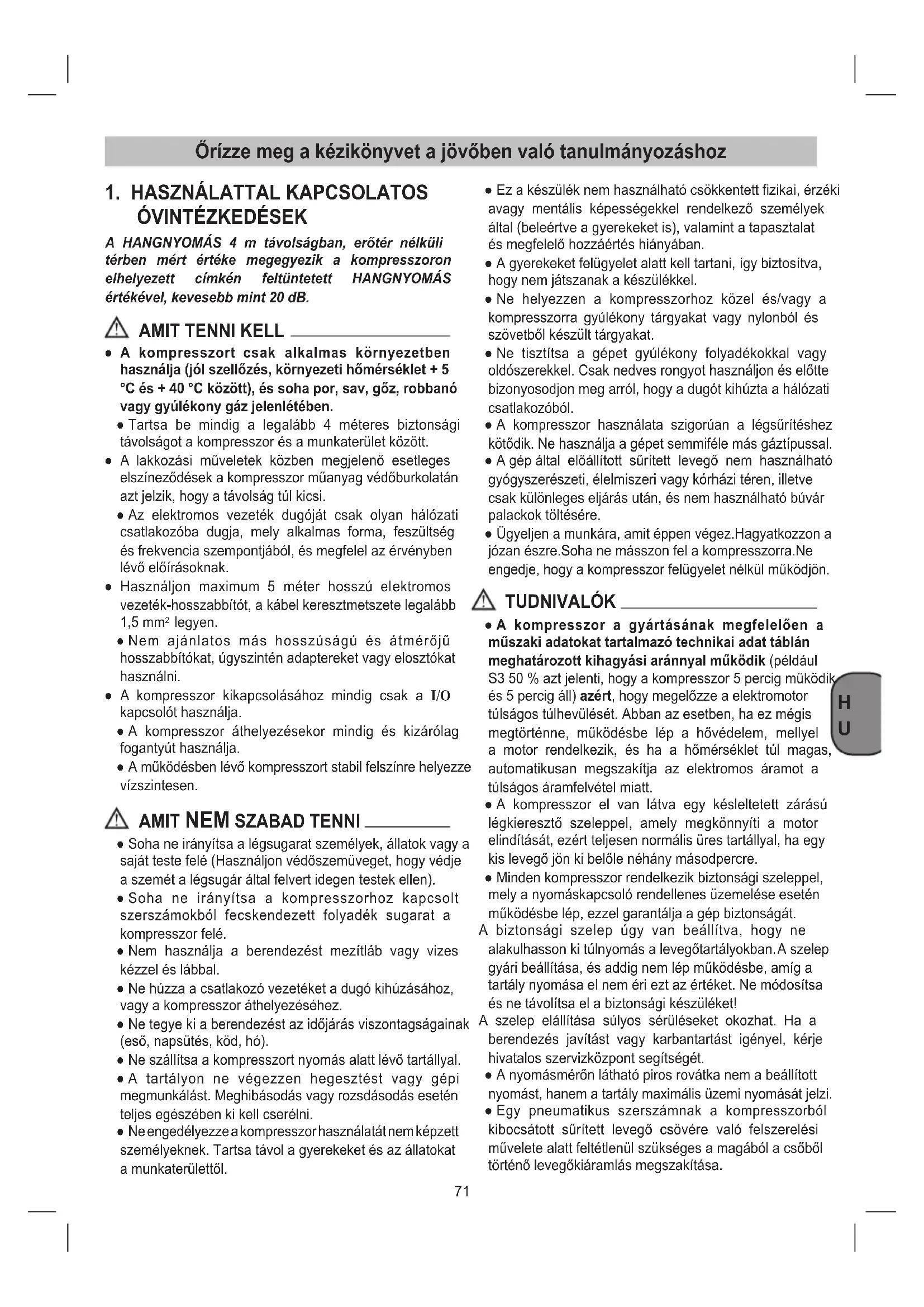● Soha ne irányítsa a légsugarat személyek, állatok vagy a saját teste felé (Használjon védőszemüveget, hogy védje a szemét a légsugár által felvert idegen testek ellen). ● Soha ne irányítsa a kompresszorhoz kapcsolt szerszámokból fecskendezett folyadék sugarat a kompresszor felé. ● Nem használja a berendezést mezítláb vagy vizes kézzel és lábbal. ● Ne húzza a csatlakozó vezetéket a dugó kihúzásához, vagy a kompresszor áthelyezéséhez. ● Ne tegye ki a berendezést az időjárás viszontagságainak (eső, napsütés, köd, hó). ● Ne szállítsa a kompresszort nyomás alatt lévő tartállyal. ● A tartályon ne végezzen hegesztést vagy gépi megmunkálást. Meghibásodás vagy rozsdásodás esetén teljes egészében ki kell cserélni. ● Ne engedélyezze a kompresszor használatát nem képzett személyeknek. Tartsa távol a gyerekeket és az állatokat a munkaterülettől. ● Ez a készülék nem használható csökkentett zikai, érzéki avagy mentális képességekkel rendelkező személyek által (beleértve a gyerekeket is), valamint a tapasztalat és megfelelő hozzáértés hiányában. ● A gyerekeket felügyelet alatt kell tartani, így biztosítva, hogy nem játszanak a készülékkel. ● Ne helyezzen a kompresszorhoz közel és/vagy a kompresszorra gyúlékony tárgyakat vagy nylonból és szövetből készült tárgyakat. ● Ne tisztítsa a gépet gyúlékony folyadékokkal vagy oldószerekkel. Csak nedves rongyot használjon és előtte bizonyosodjon meg arról, hogy a dugót kihúzta a hálózati csatlakozóból. ● A kompresszor használata szigorúan a légsűrítéshez kötődik. Ne használja a gépet semmiféle más gáztípussal. ● A gép által előállított sűrített levegő nem használható gyógyszerészeti, élelmiszeri vagy kórházi téren, illetve csak különleges eljárás után, és nem használható búvár palackok töltésére. ● Ügyeljen a munkára, amit éppen végez.Hagyatkozzon a józan észre.Soha ne másszon fel a kompresszorra.Ne engedje, hogy a kompresszor felügyelet nélkül működjön. TUDNIVALÓK ● A kompresszor a gyártásának megfelelően a műszaki adatokat tartalmazó technikai adat táblán meghatározott kihagyási aránnyal működik (például S3 50 % azt jelenti, hogy a kompresszor 5 percig működik és 5 percig áll) azért, hogy megelőzze a elektromotor túlságos túlhevülését. Abban az esetben, ha ez mégis megtörténne, működésbe lép a hővédelem, mellyel a motor rendelkezik, és ha a hőmérséklet túl magas, automatikusan megszakítja az elektromos áramot a túlságos áramfelvétel miatt. ● A kompresszor el van látva egy késleltetett zárású légkieresztő szeleppel, amely megkönnyíti a motor elindítását, ezért teljesen normális üres tartállyal, ha egy kis levegő jön ki belőle néhány másodpercre. ● Minden kompresszor rendelkezik biztonsági szeleppel, mely a nyomáskapcsoló rendellenes üzemelése esetén működésbe lép, ezzel garantálja a gép biztonságát. A biztonsági szelep úgy van beállítva, hogy ne alakulhasson ki túlnyomás a levegőtartályokban. A szelep gyári beállítása, és addig nem lép működésbe, amíg a tartály nyomása el nem éri ezt az értéket. Ne módosítsa és ne távolítsa el a biztonsági készüléket! A szelep elállítása súlyos sérüléseket okozhat. Ha a berendezés javítást vagy karbantartást igényel, kérje hivatalos szervizközpont segítségét. ● A nyomásmérőn látható piros rovátka nem a beállított nyomást, hanem a tartály maximális üzemi nyomását jelzi. ● Egy pneumatikus szerszámnak a kompresszorból kibocsátott sűrített levegő csövére való felszerelési művelete alatt feltétlenül szükséges a magából a csőből történő levegőkiáramlás megszakítása.72