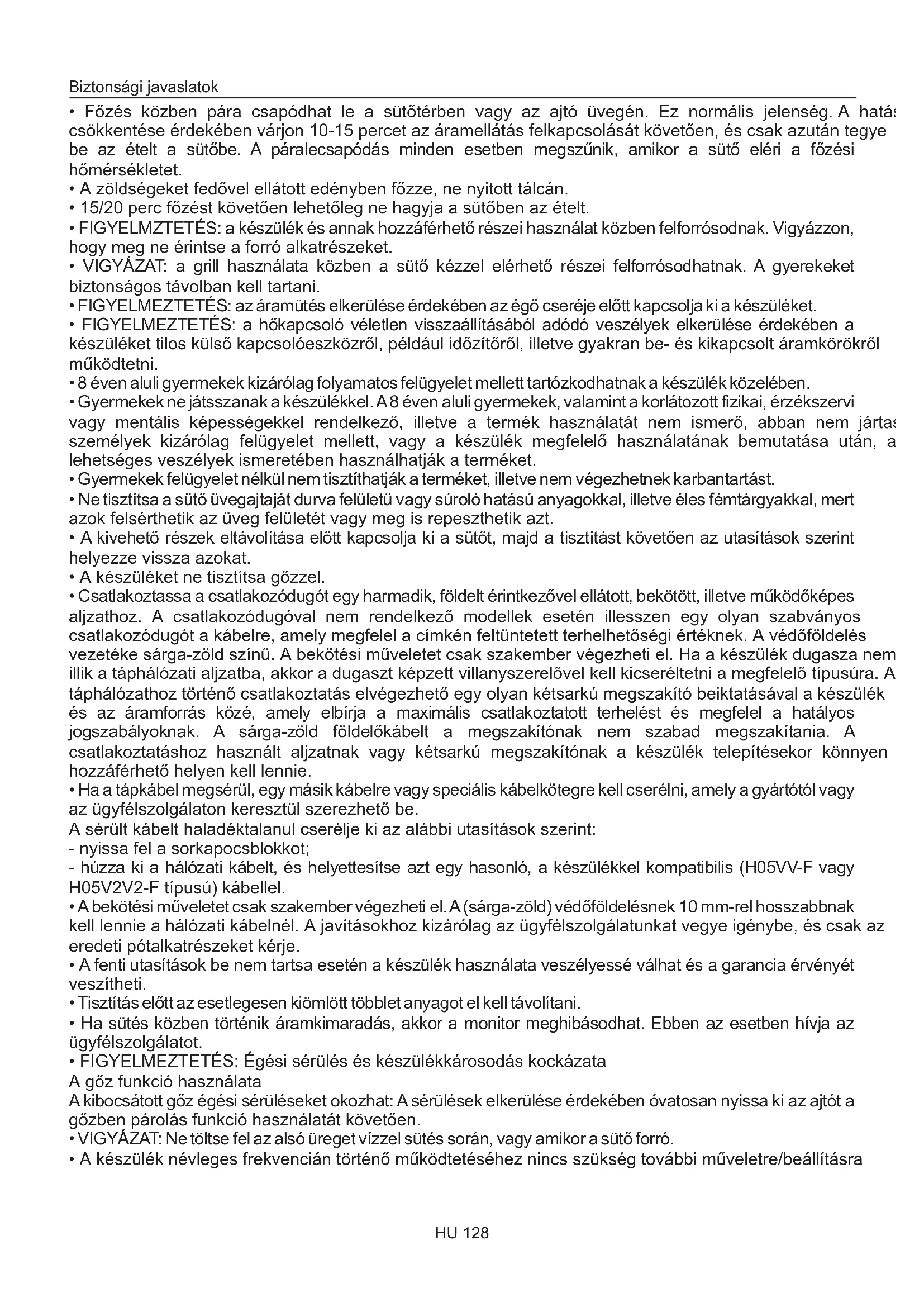 - A készülék névleges frekvencián történő működtetéséhez nincs szükség további műveletre/beállításra Biztonsági javaslatok HU 128A sütö tisztítása és karbantartása Általános utasítások