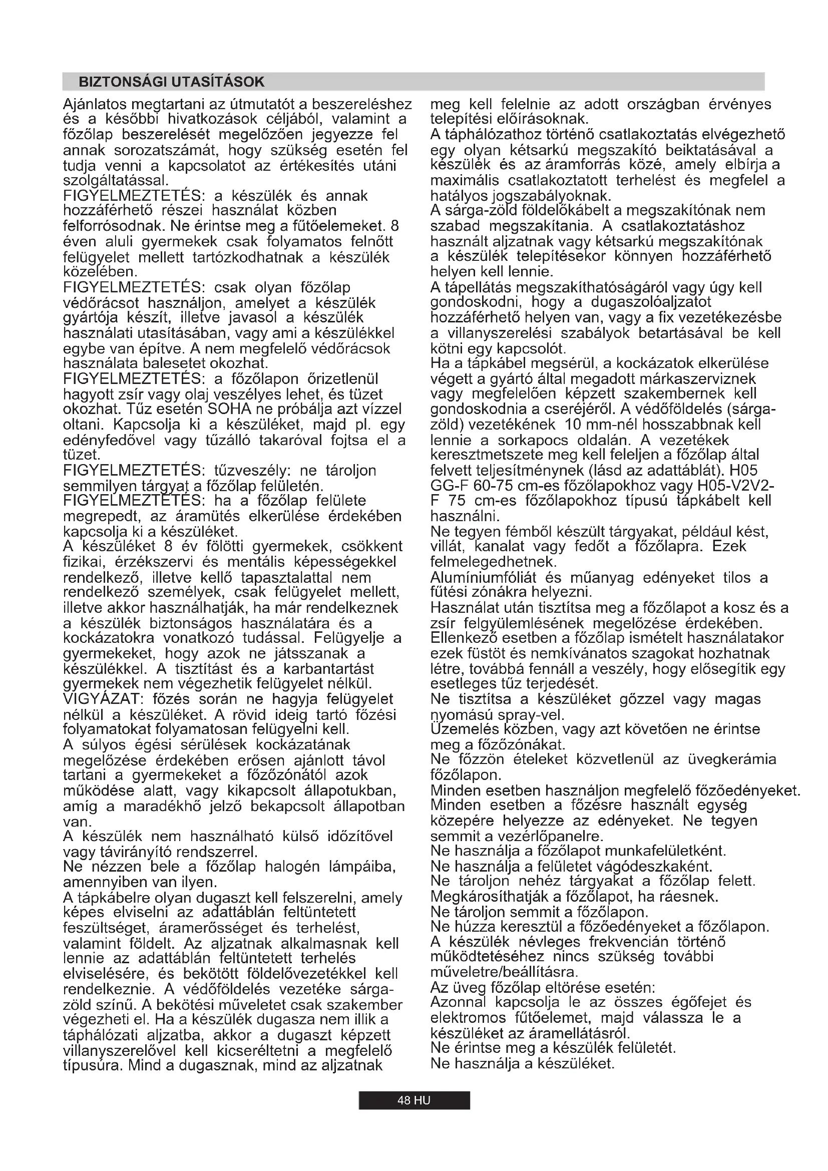 Ha a hálózati kábel sérült, az esetleges veszélyek elkerülése érdekében cseréjét szakképzett szerelőnek kell elvégeznie. Ellenőrizze a teljesítménnyel kapcsolatos adatokat a géptörzslapon, és ügyeljen arra, hogy a hálózati kábel 3x0.75 mm² H05 GG-F 60-75 cm-es főzőlapokhoz vagy H05-V2V2-F 75 cm-es főzőlapokhoz típusú legyen. A tűzhelylap felvett teljesítményéhez viszonyítva a kábelnek megfelelő méretűnek kell lennie. A tűzhelylap elektromos hálózatra történő közvetlen csatlakoztatása esetén megszakítót kell beépíteni. Ellenőrizze a készülék külső részén elhelyezett géptörzslapon lévő adatokat, hogy a hálózati és bemeneti feszültség megfelelő-e. A csatlakoztatás előtt ellenőrizze a földelő rendszert. Az előírásoknak megfelelően a készüléket földelni kell. Ennek az előírásnak a be nem tartása esetén a gyártó nem vállal felelősséget a személyi sérülésekért és az anyagi károkért. Ha a csatlakozódugó még nincs felszerelve, akkor a géptörzslapon jelzett terhelésnek megfelelő dugót használjon. A földelőkábel színe sárga-zöld. A csatlakozódugónak mindig hozzáférhetőnek kell lennie. A (zöld/sárga színű) földvezetéknek legalább 10 mm-rel hosszabbnak kell lennie a feszültség alatti vezetéknél és a nullavezetéknél. A kikapcsolást szolgáló eszközt a huzalozási szabályoknak megfelelően a fix vezetékbe kell beépíteni. A készülék táphálózatra történõ közvetlen csatlakoztatásához a rögzített huzalozásba beépített eszköz szükséges, amely az összes pólusnál olyan érintkezõ-elkülönítéssel rendelkezik, amely a huzalozási szabályoknak megfelelõen teljes megszakítást biztosít III. kategóriájú túlfeszültség esetén.